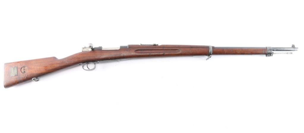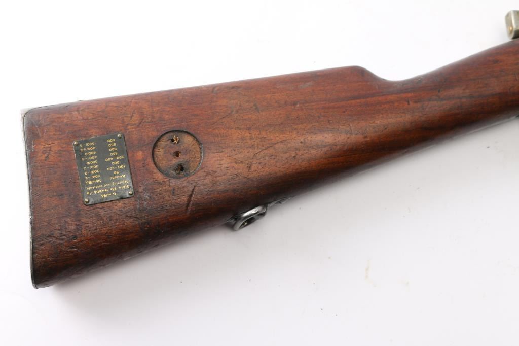 This is a Swedish M96 Mauser bolt-action rifle chambered in 6.5x55. the rifle was manufactured at the Carl Gustafs Stad factory before import though CAI (stamped behind muzzle). The rifle is complete and functional with crisp clear stampings and matching numbers. The rifle maintains approximately 80% of its finish, showing signs of wear across the rifle, with some light scratching and indentations on smaller components such as the butt plate and sling swivels. The stock is in good condition, showing age and use through light depressions and two small dents forward of the rear sight in the top handguard. No cracks or damage are present in the wood. The stock is missing the bore condition stock disk, but has an original and correctly inverted, intact range card installed on the right side of the stock. The rifle is currently still filled with packing grease.