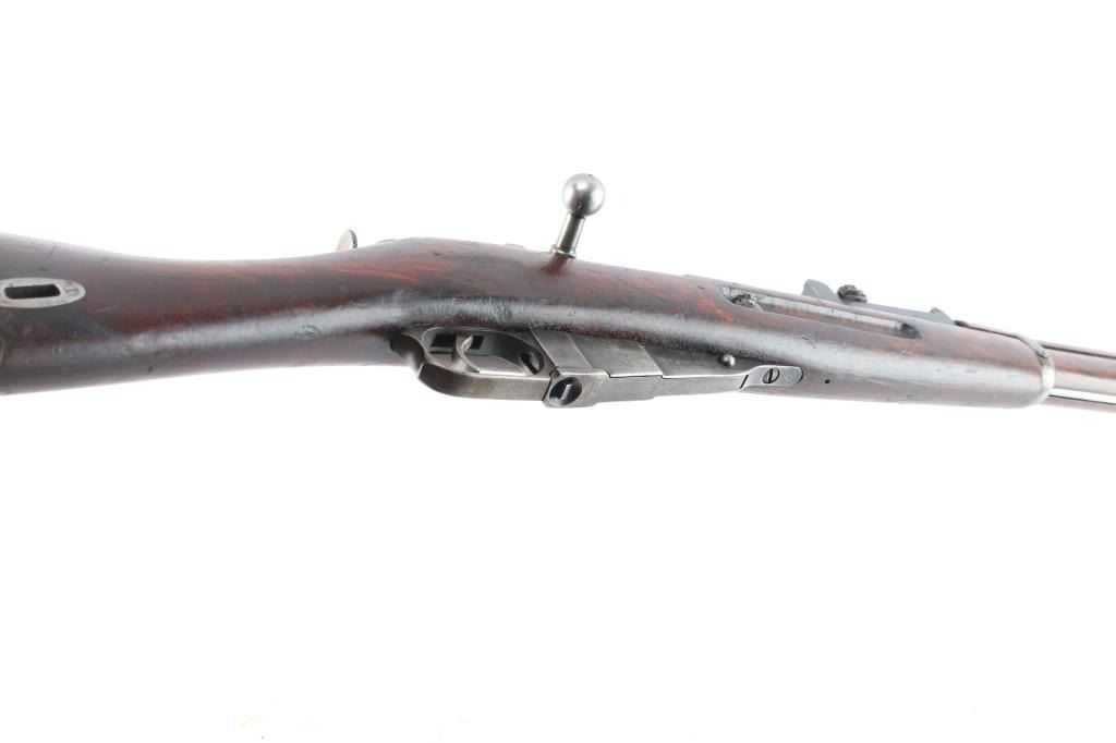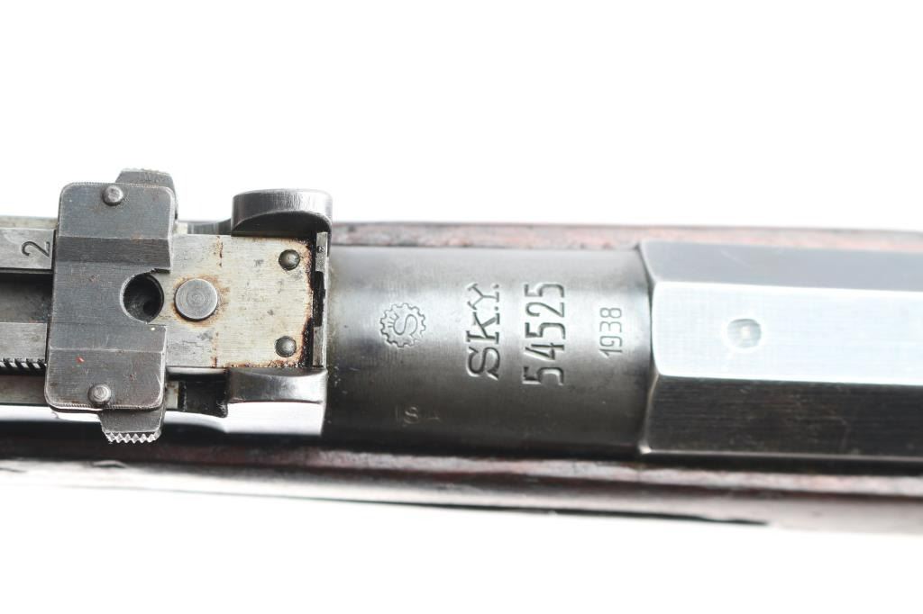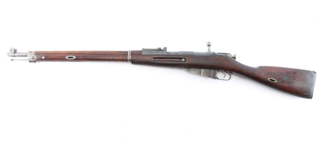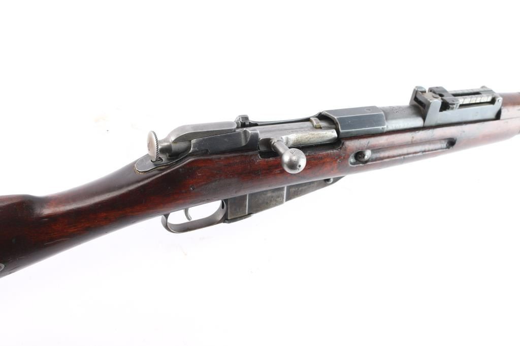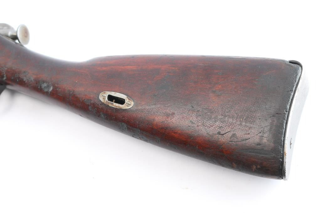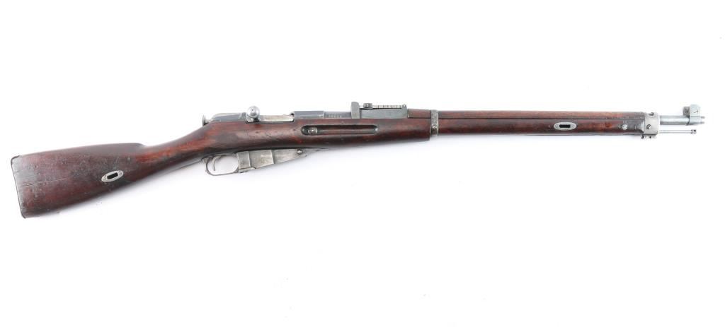 This is a Sako manufactured M28/30 bolt-action Mosin pattern rifle. The rifle is chambered for 7.62x54R. Manufactured for the Finnish Civil Guard in 1938, and later imported to the US market by Marathon Products, Inc of Weth, CT. The rifle features the Sako manufacture stamp, as well as SA property mark, 1936 Sako proofing mark and various proofs correct to the manufacturing period. The rifle bears the civil guard inventory number S10113. The barrel band is loose fitting. The bolt handle knob is stamped 4525, consistent with the SN, while also bearing the number 135636 on the lug. Stamping is crisp and clear, less the import mark behind the muzzle. The rifle features the correct front and rear sights introduced for the M28/30 pattern. The rear sight is a band mounted ramped rear with protective “ears”, stiffened by hardened cosmoline. The front sight is a bladed sight protected by “ears” The sight blade is stamped ‘76’ matching the barrel stamping of the same just before the sight. The action is set in a Russian one piece stock. The stock has not seen any repair, but an attempt to fill the gap of the receiver tang has been made. The stock suffers a crack through it between the forward sling stud and rear barrel band on the left side. The stock also bears impression markings from long term storage in a soft case in the finish on the left side of the butt. The upper handguard has a through crack spanning from the forward sling stud rearward under the barrel band, left of centerline. There is a second crack on the left of the upper handguard that starts an inch behind the crack in the stock and stops just ahead of the barrel band. The stock remains serviceable, but carries various depressions and some heavy scratching on the right face of the butt. Rifle is complete, in good working order with cleaning rod, and the bore is clean and crisp.