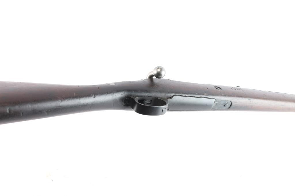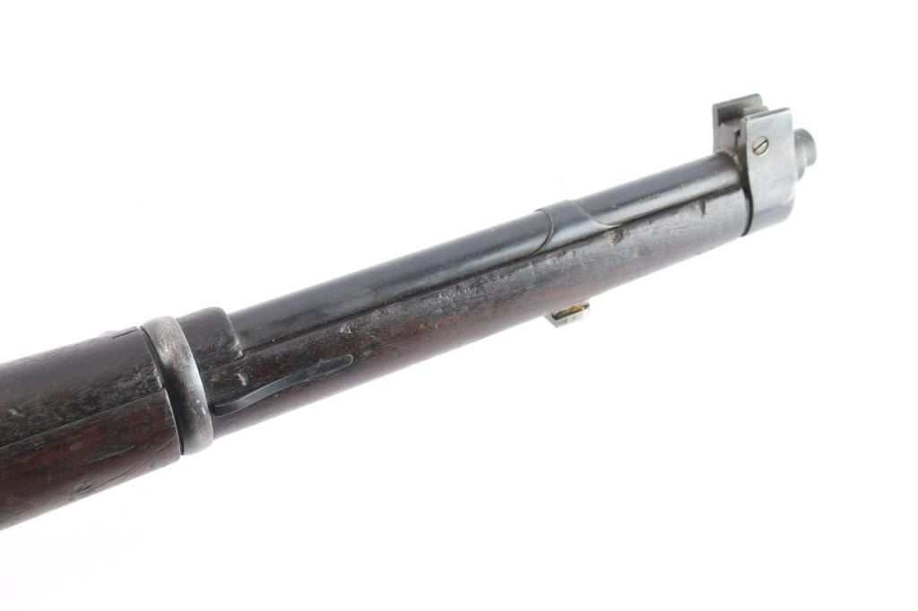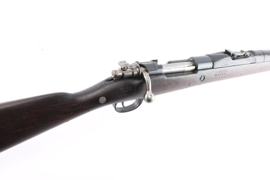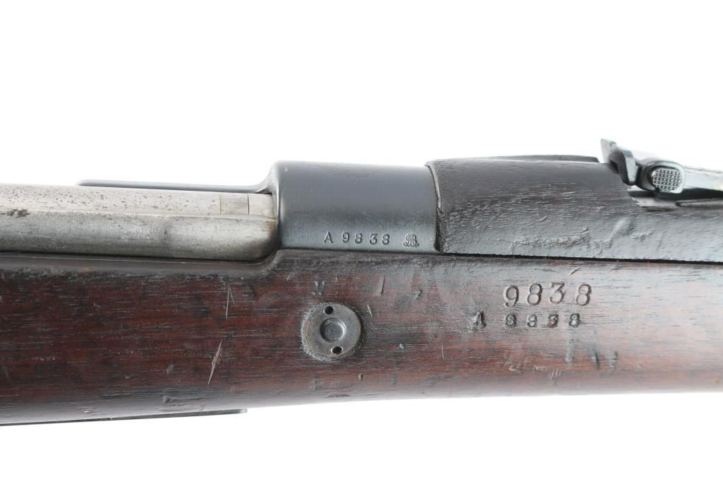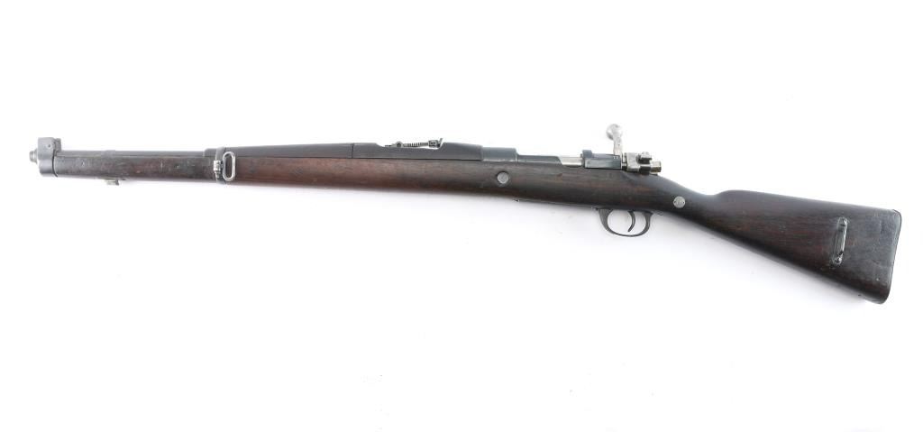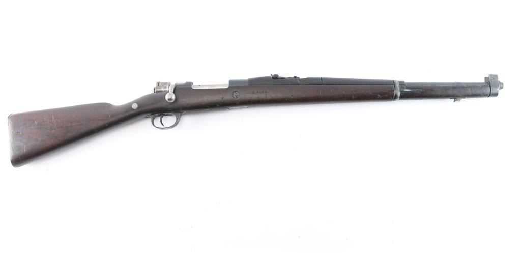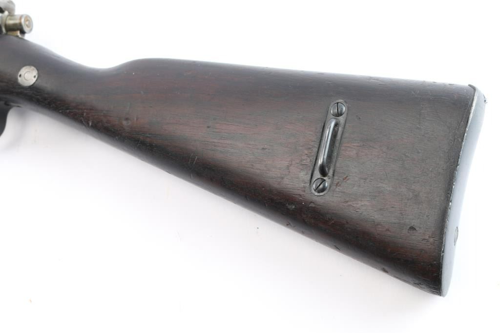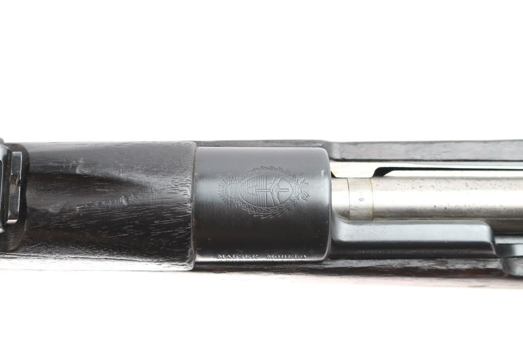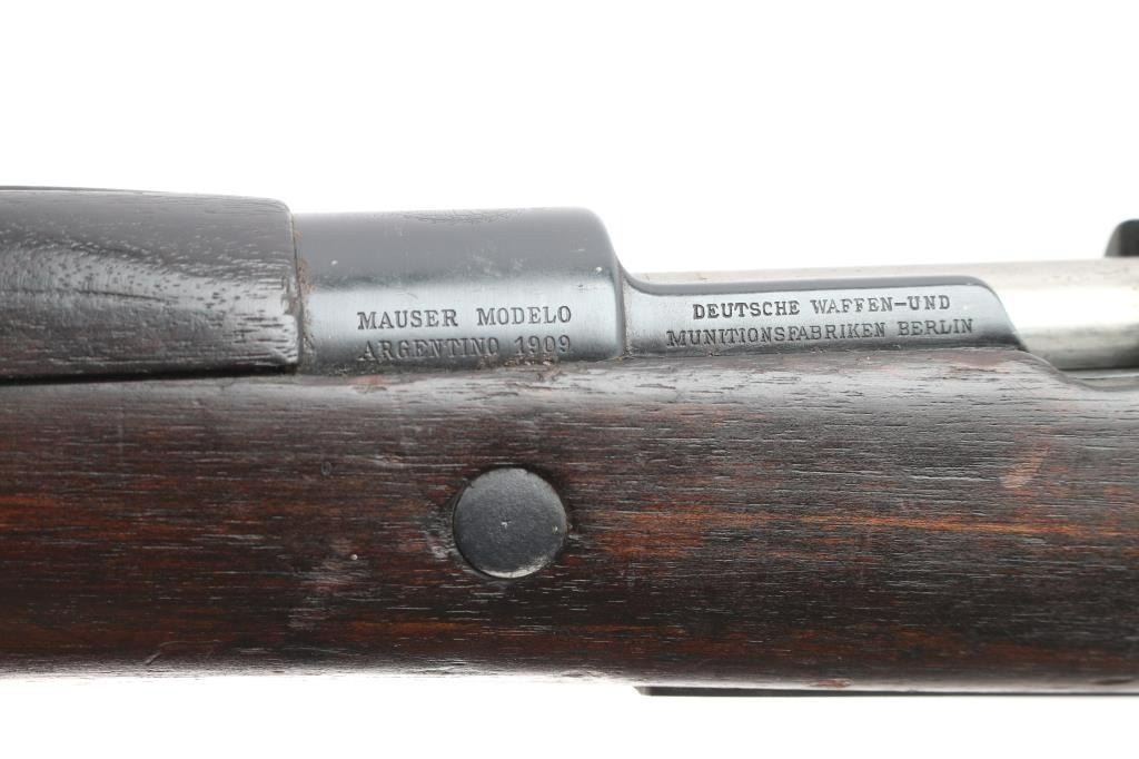 This is a 1909 pattern large-ring Mauser bolt-action rifle, manufactured by Deutsche Waffen-und Munitions (DWM), Berlin, on contract for Argentina, before import by CAI. This rifle features a full length stock and 21.9” barrel. The receiver bears the Argentine crest, with the manufacturer’s mark, and “Mauser Modelo Argentino 1909.” The bolt bears a matching SN and ‘Phrygian Cap’ (Cap) markings on the handle and safety shroud. Cap markings can also be found on the bolt release, floor plate, and guard. An additional DWM marking can be found forward of the SN. A Naval Anchor is stamped on the front of the tangent rear sight. The finish is approximately 95%, showing worn finish around the base of the front sight cap, bayonet lug and barrel band. There is light scuffing at the top of the but plat and respective screw and around the barrel band. There is light surface rust under the extractor. The stock bears matching numbers and is constructed from darkened walnut. It bears numerous small depressions and scratches with some surface hairline cracking, but no cracks that run all the way through the wood. There is a small section of wood displaced immediately behind the receiver tang, but does not appear to have ever been fully detached from the stock. Bore is excellent with very clear, crisp and clean rifling.