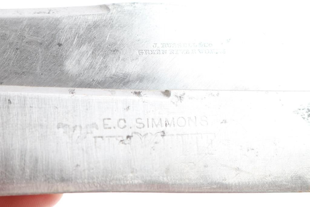 From frontier era with pewter inlaid grips. One Russell Green River Works, one marked E. C. Simmons Sheffield. Blades 8 1/2" to 11". Various conditions. Fair to good plus. Native American Indians favored this type knife as flexible and easy to sharpen - often found with Indian scabbard. James Wells "Buffalo Hunt" collection.