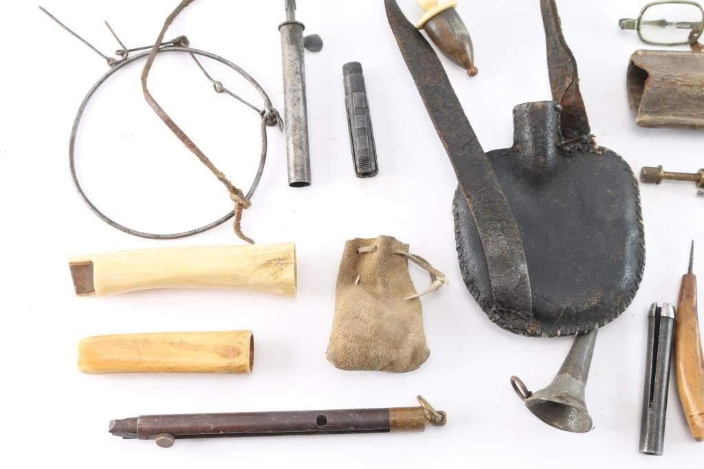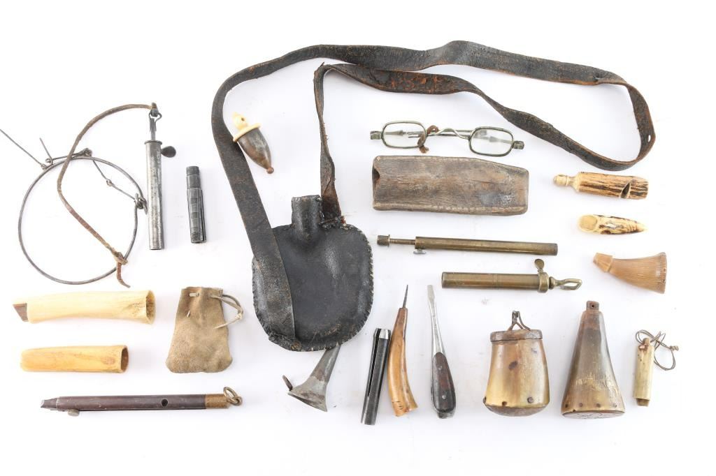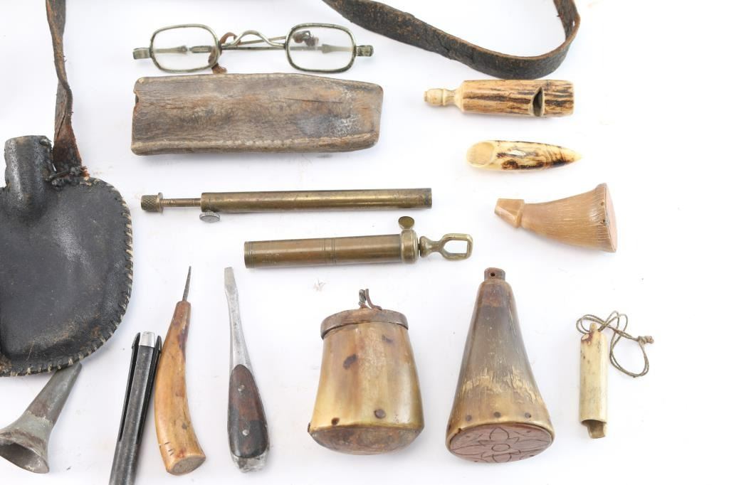 Large lot from frontier era. Includes flasks of horn and leather, nipple wrenches, powder measures, funnel of tin, shell extractor, capper, shooting glasses. Various ages and conditions. 16 pieces plus. James Wells "Buffalo Hunt" Collection.