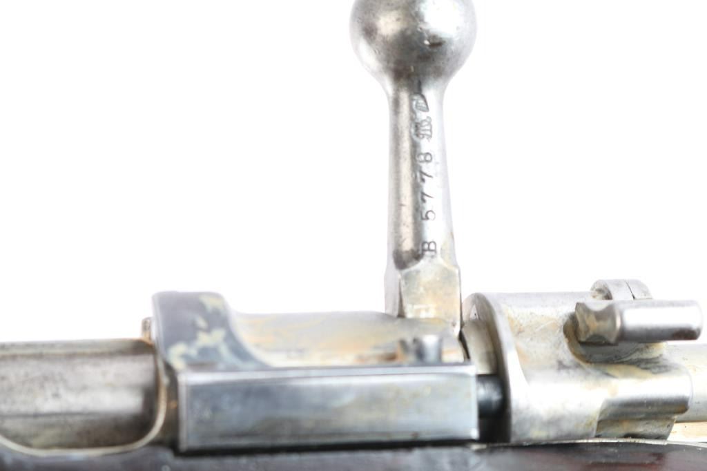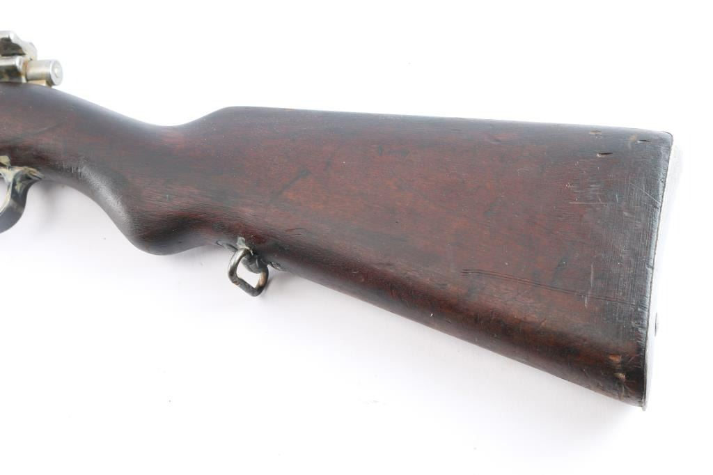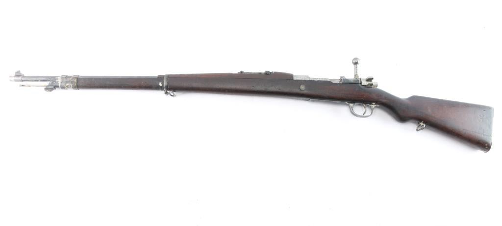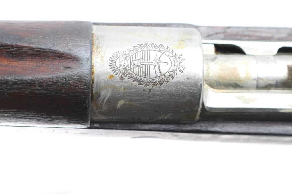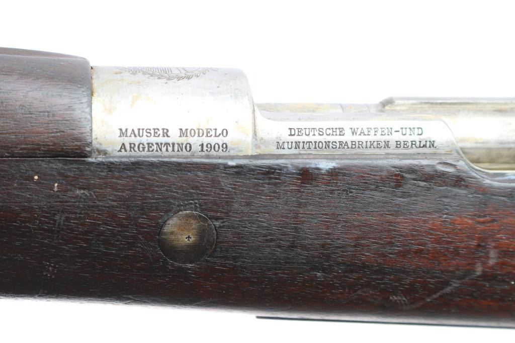 This is a 1909 pattern large-ring Mauser bolt-action rifle, manufactured by Deutsche Waffen-und Munitions (DWM), Berlin, on contract for Argentina, before import by CAI. This rifle features a 29” barrel. The receiver bears the Argentine crest, with the manufacturer’s mark, and “Mauser Modelo Argentino 1909.” The bolt bears a matching SN and ‘Phrygian Cap’ (Cap) markings on the handle, and safety shroud. Cap markings can also be found on the front sight ramp, bolt release, floor plate, and guard. An additional DWM marking can be found forward of the SN. A Naval Anchor is stamped on the front of the tangent rear sight. The finish is approximately 80%, showing worn finish around the front sight, bayonet lug, barrel, barrel bands, floor plate, guard and sling swivels. There is light oxidation present on the bolt knob and front sight band, with browned patina in other areas cause by dried packing grease. It bears numerous small depressions and scratches with no visible surface hairline cracking. The bore is well worn and no longer has sharp rifling.