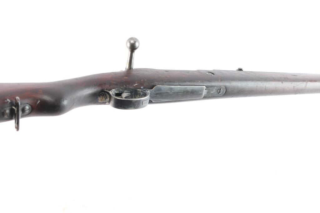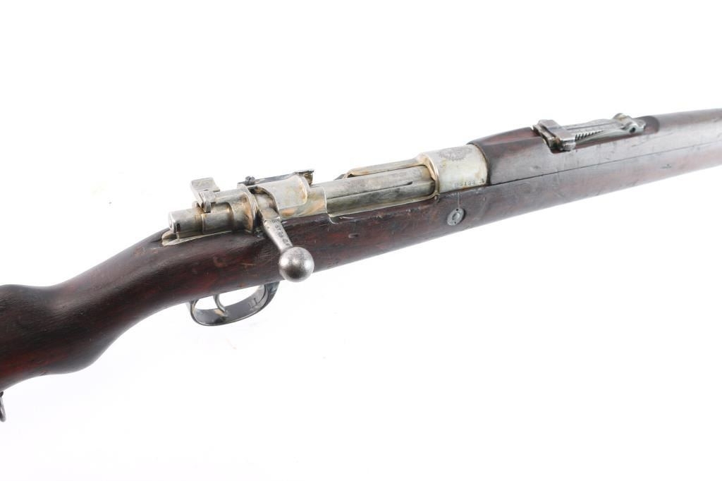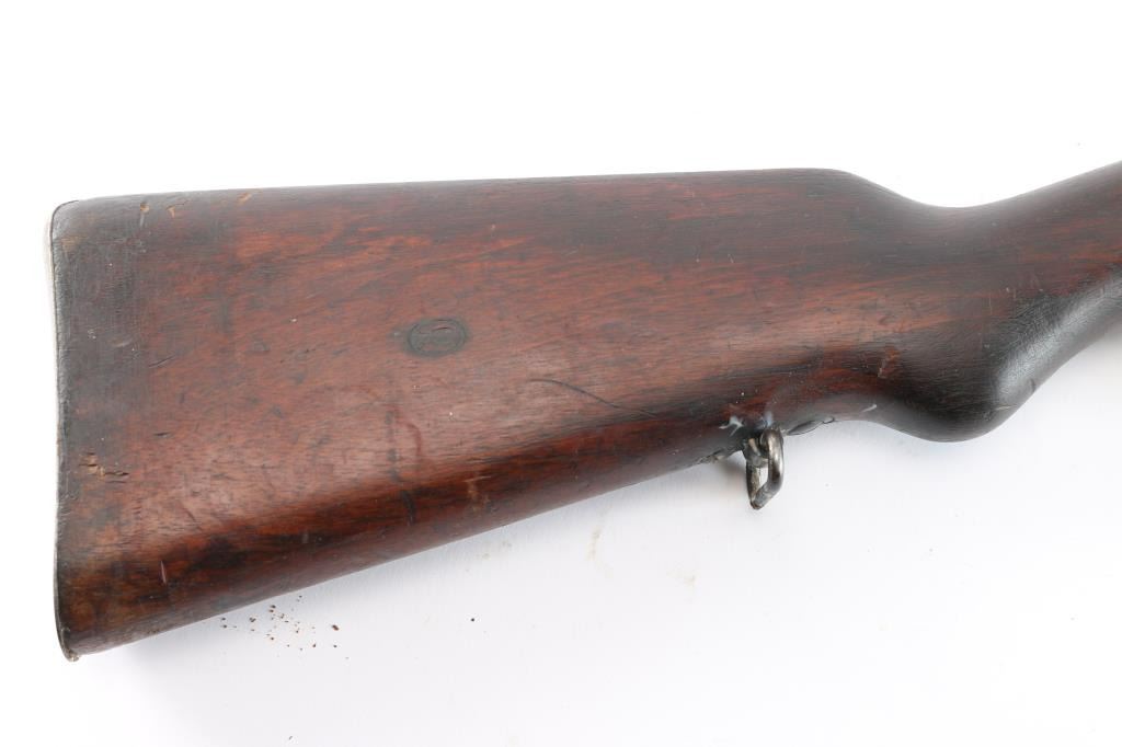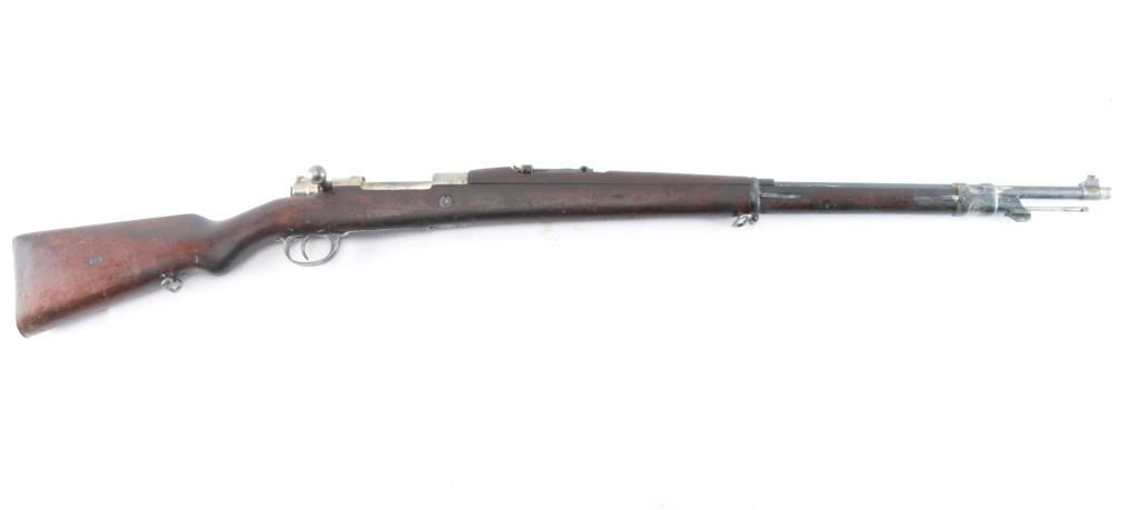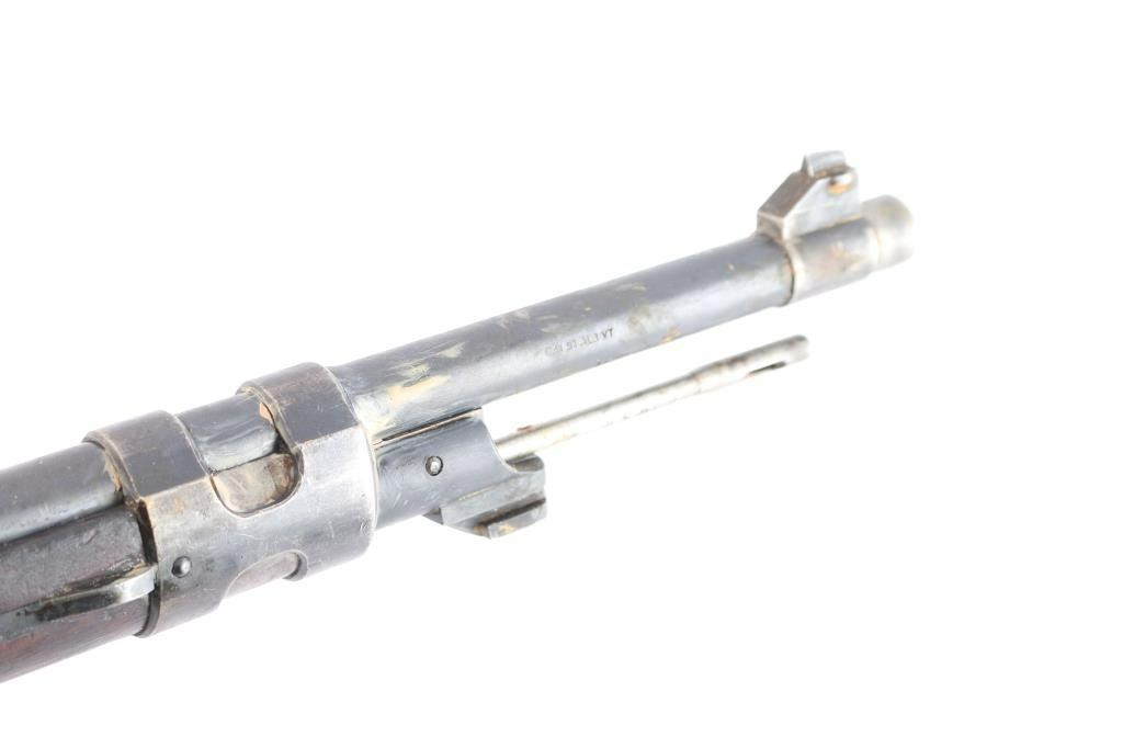This is a 1909 pattern large-ring Mauser bolt-action rifle, manufactured by Deutsche Waffen-und Munitions (DWM), Berlin, on contract for Argentina, before import by CAI. This rifle features a 29” barrel. The receiver bears the Argentine crest, with the manufacturer’s mark, and “Mauser Modelo Argentino 1909.” The bolt bears a matching SN and ‘Phrygian Cap’ (Cap) markings on the handle, and safety shroud. Cap markings can also be found on the front sight ramp, bolt release, floor plate, and guard. An additional DWM marking can be found forward of the SN. A Naval Anchor is stamped on the front of the tangent rear sight. The finish is approximately 80%, showing worn finish around the front sight, bayonet lug, barrel, barrel bands, floor plate, guard and sling swivels. There is light oxidation present on the bolt knob and front sight band, with browned patina in other areas cause by dried packing grease. It bears numerous small depressions and scratches with no visible surface hairline cracking. The bore is well worn and no longer has sharp rifling.