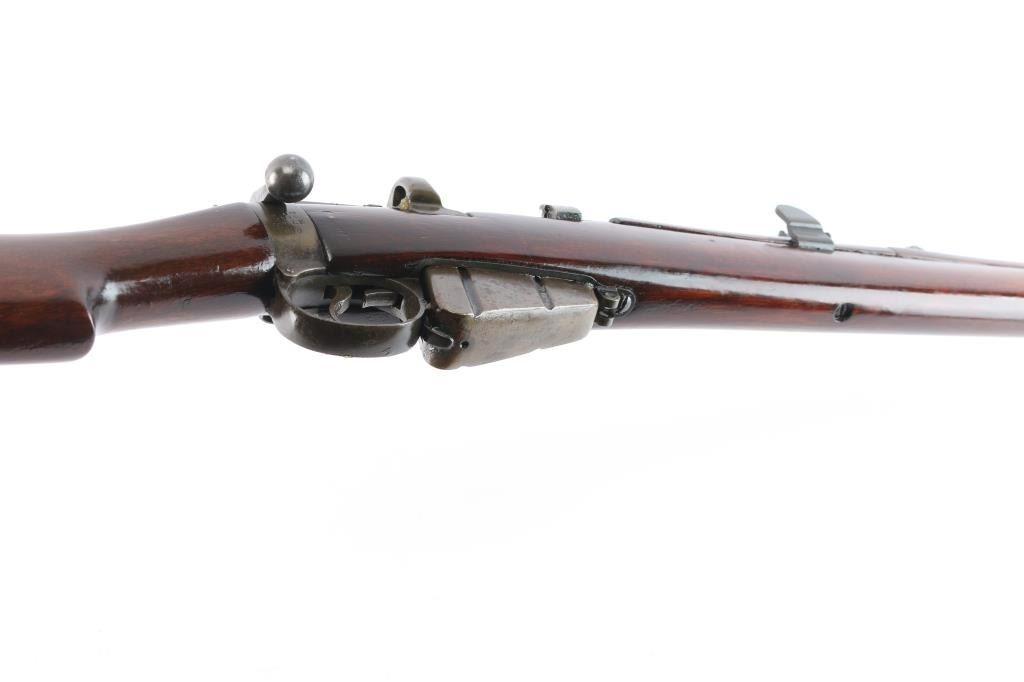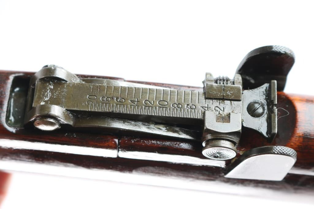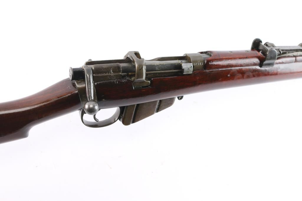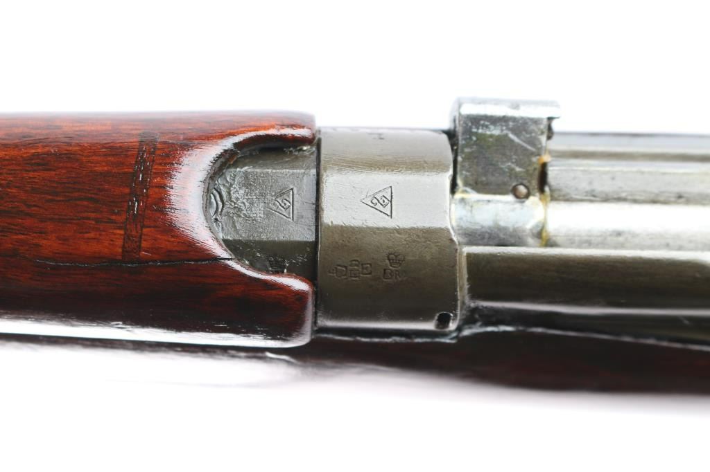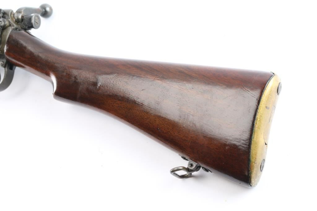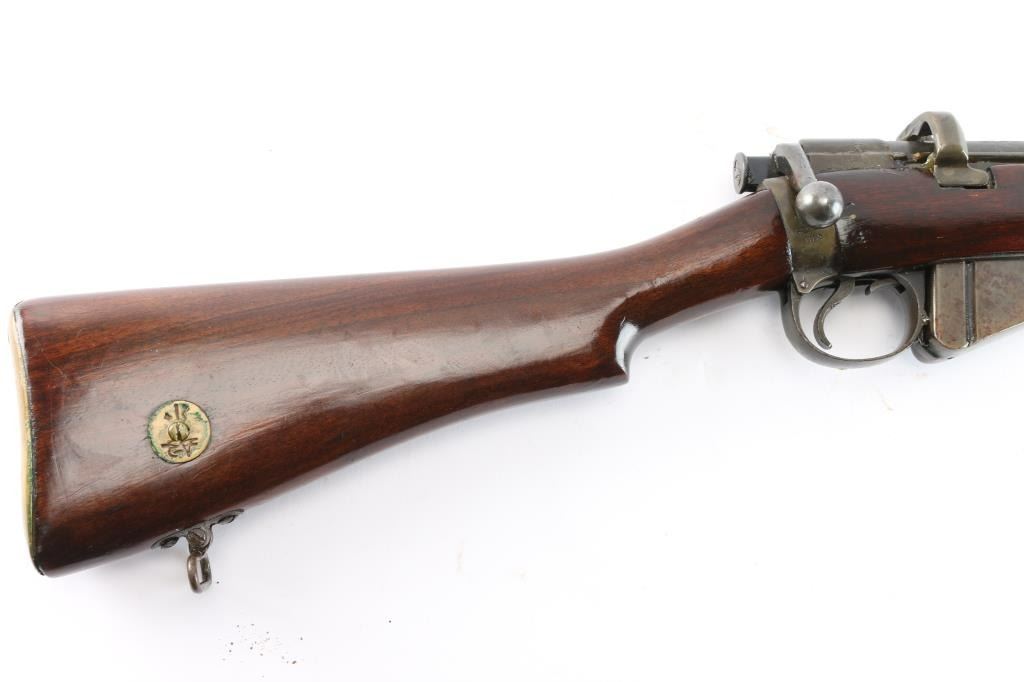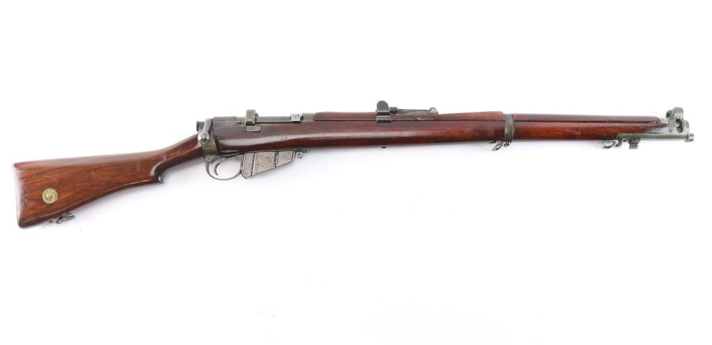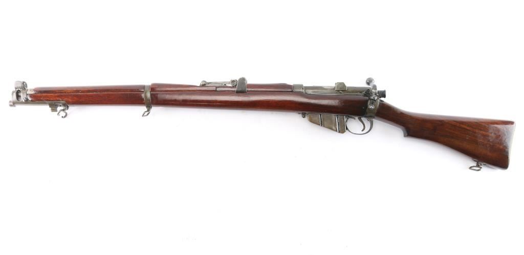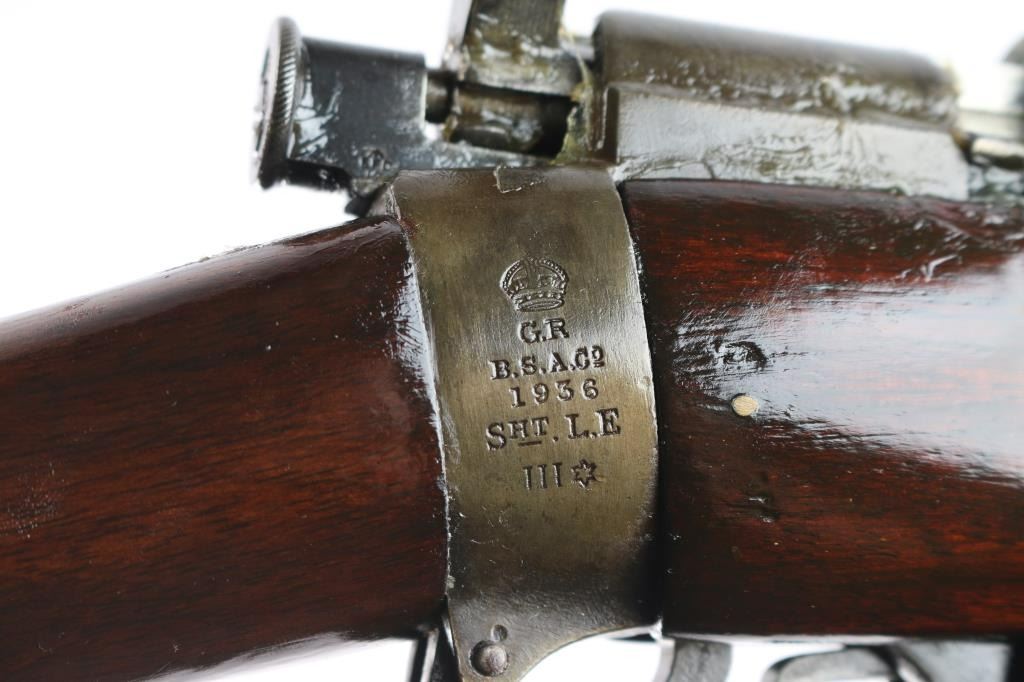 British military issue bolt action Lee Enfield SMLE short rifle, manufactured circa 1936. Imported by Federal Ordinance Inc. (left side of butt socket on receiver), 25.2" barrel with tangent rear sight graduated to 2000 meters and adjustable for windage, fixed blade front sight with curved protectors, curved grooved trigger, and bayonet lug. Fed from detachable 10-rd box magazine and with no magazine cutoff. Four piece hardwood stock with brass trapdoor buttplate, and brass stock disc with what appears to be middle eastern characters. The metal finish seems to be parkerized. Bore is Dark/dirty, and rifling is hard to determine. Action is smooth/tight. Wood is overall very good with a 1.5" crack near the receiver on the handguard, the metal is good with minor handling wear. Observed serial numbers do not match. Receiver is marked "G.R. 1936" stamped on the buttsocket. Includes (1) Magazine.