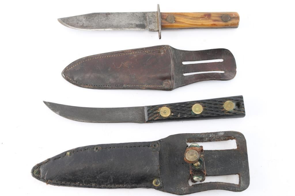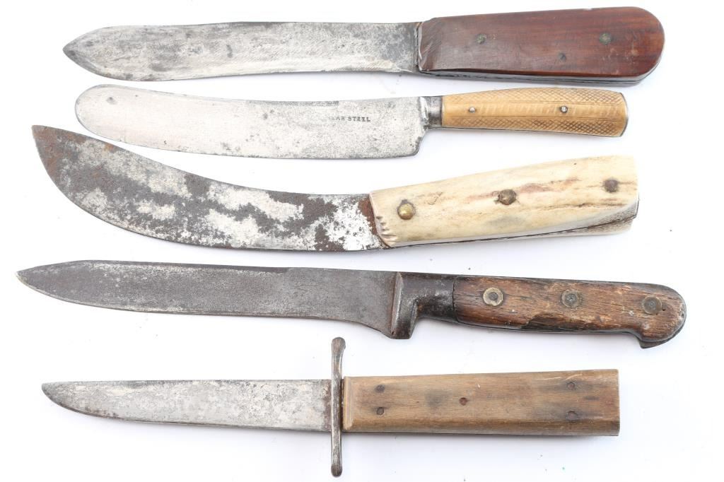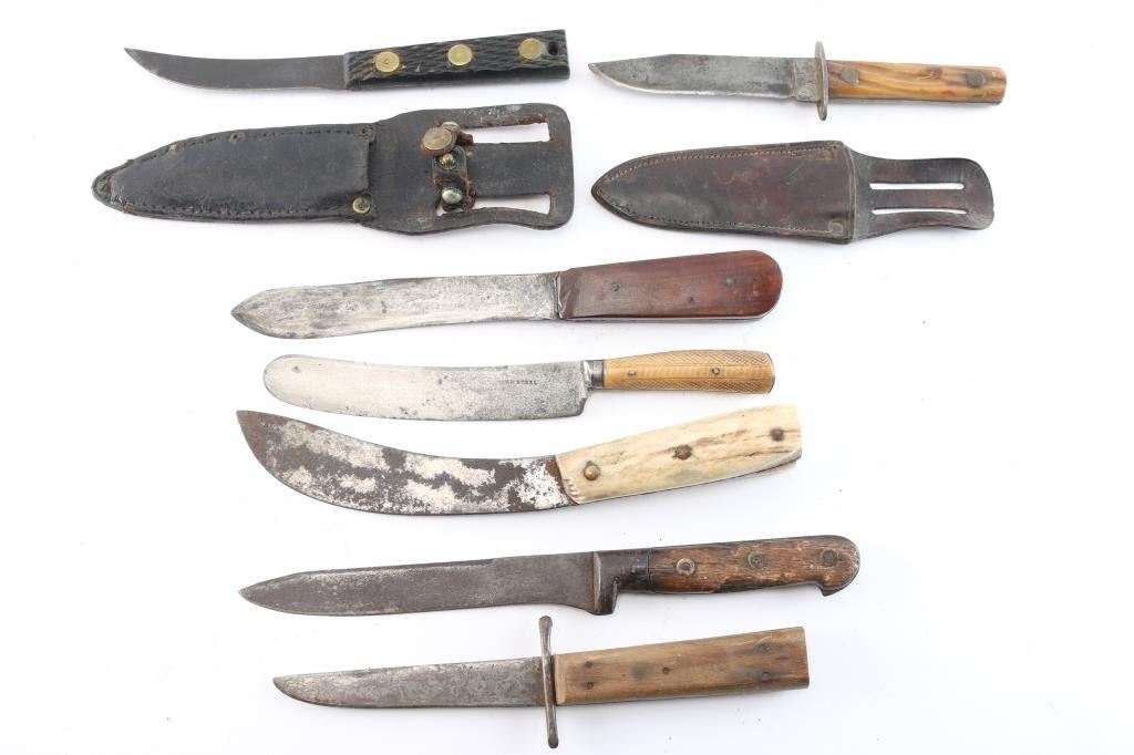 1) Russell Green River with checkered wood grip, 3 brass rivets, blade curved and 4 1/2". Period scabbard. Dark patina. Fair to good condition. 2) Thin steel blade, curved skinner with stag grip. Rusted and pitted. 10 1/4" overall. 3) Rusty early knife with illegible mark, well worn. Wood grip. Looks Solinger. 11" overall. Fair to poor condition. 4) Stag grip, small sheath or Bowie knife with scabbard. 4 1/2" blade and 8 1/2 overall. Scabbard fair only. 5) Crude sheath or Bowie, hand-made, 5" blade, fair to good. 6) Rosewood gripped skinner, blade roughly sharpened and wear to wrap at meeting point. Fair only. 7) Shear steel marked knife w/ checkered bone grip. Likely Sheffield. Fair. 6" blade. All from the James Wells "Buffalo Hunt" Collection.