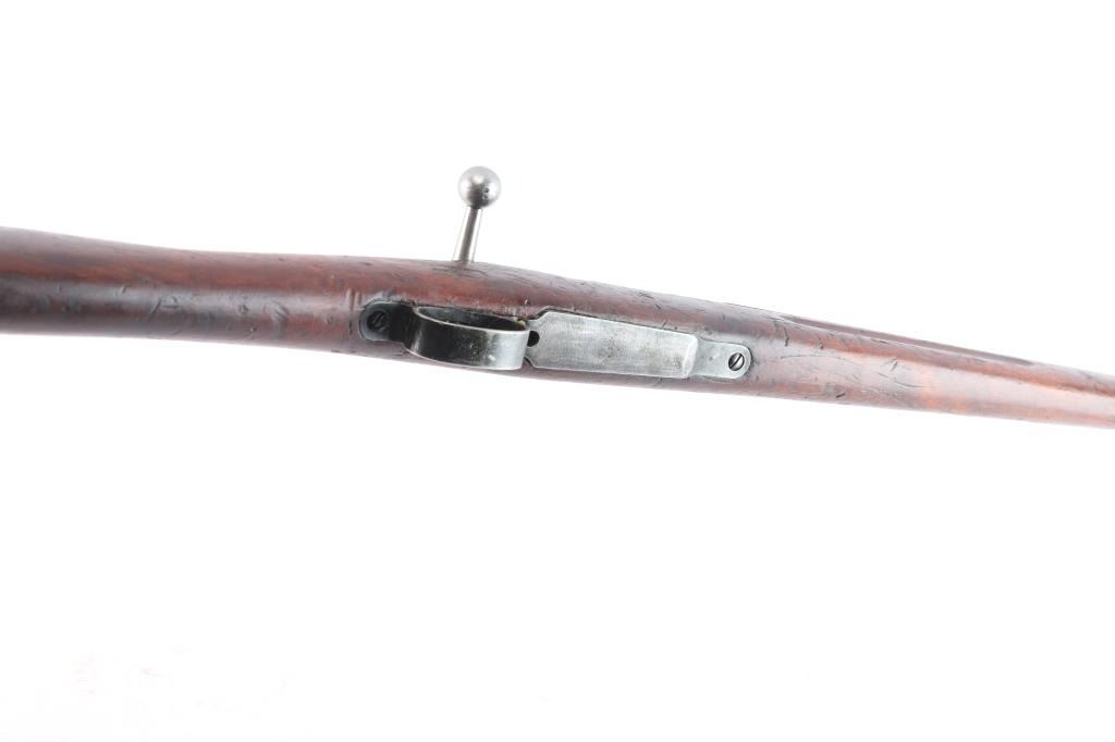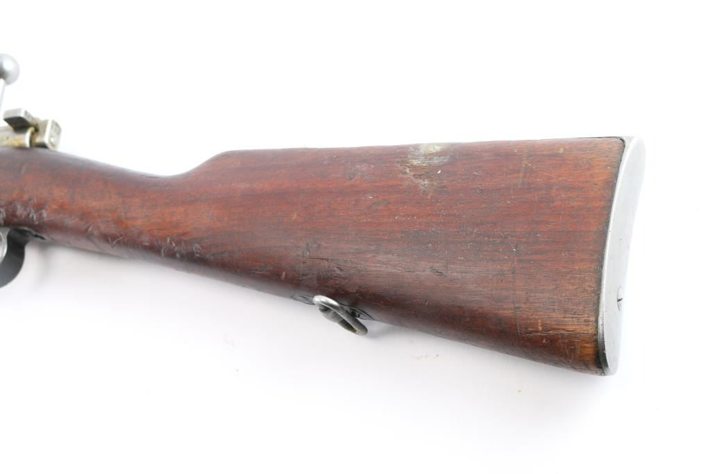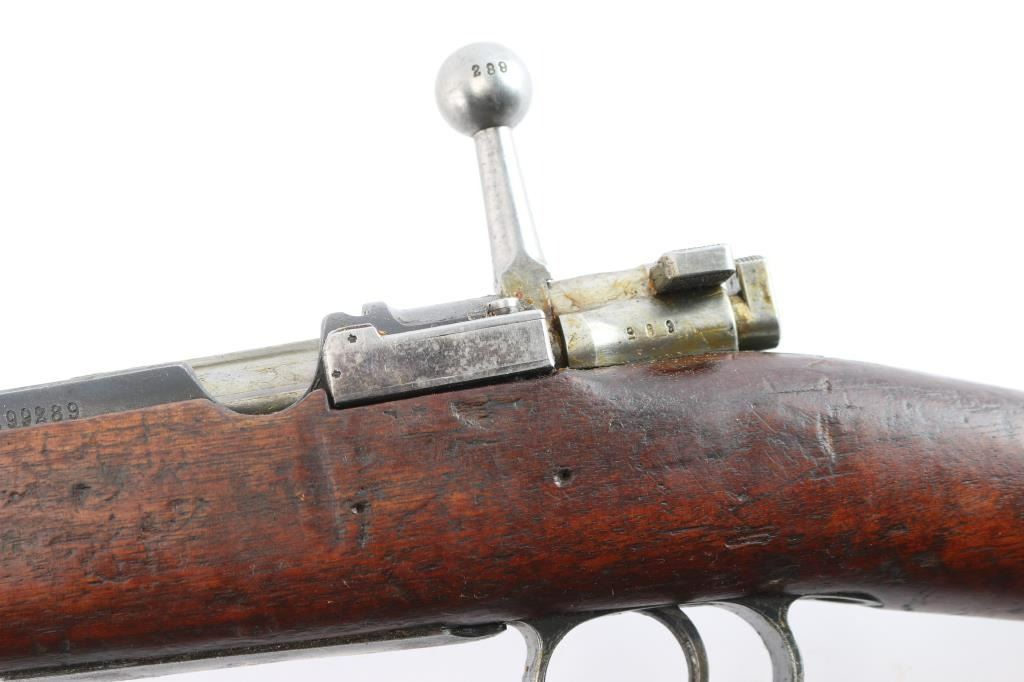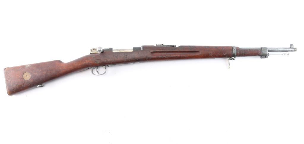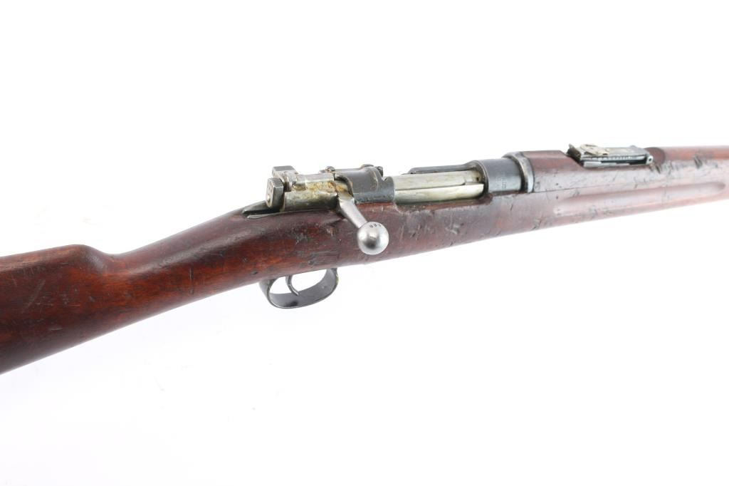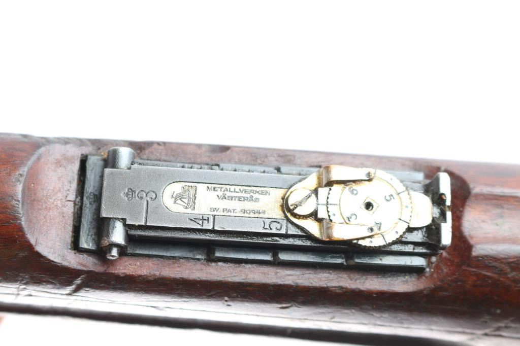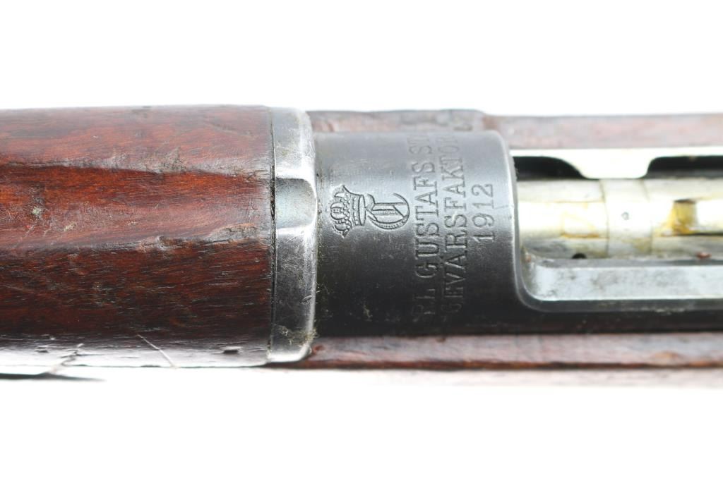 Swedish military 'Mauser" style bolt action rifle imported by CAI, St Albans VT. Manufactured circa 1912. Features blued finish with polished in-the-white bolt assembly, straight gripped wood stock with finger grooves on the forend, flat steel buttplate, 24" barrel, cleaning rod, bayonet lug, partridge front sight, Vasteras type rear sight, straight bolt handle, manual safety, sling swivels, threaded muzzle, smooth curved trigger. Matching numbers (289) on receiver, bolt handle, bolt sleeve, safety lever, cocking piece, floor plate, rear sight leaf, buttplate, both barrel bands, and bolt release. Bore condition cannot be determined because it is full of cosmoline. Retains 50% of original blued finish, metal shows edge wear, and has hardened cosmoline on some parts with no observed rust. Bolt is smooth and is in good working condition. Stock is fair with heavy handling wear, tape residue, and retains Torped Overslag stock disc noting a '0' holdover and #1 barrel condition.