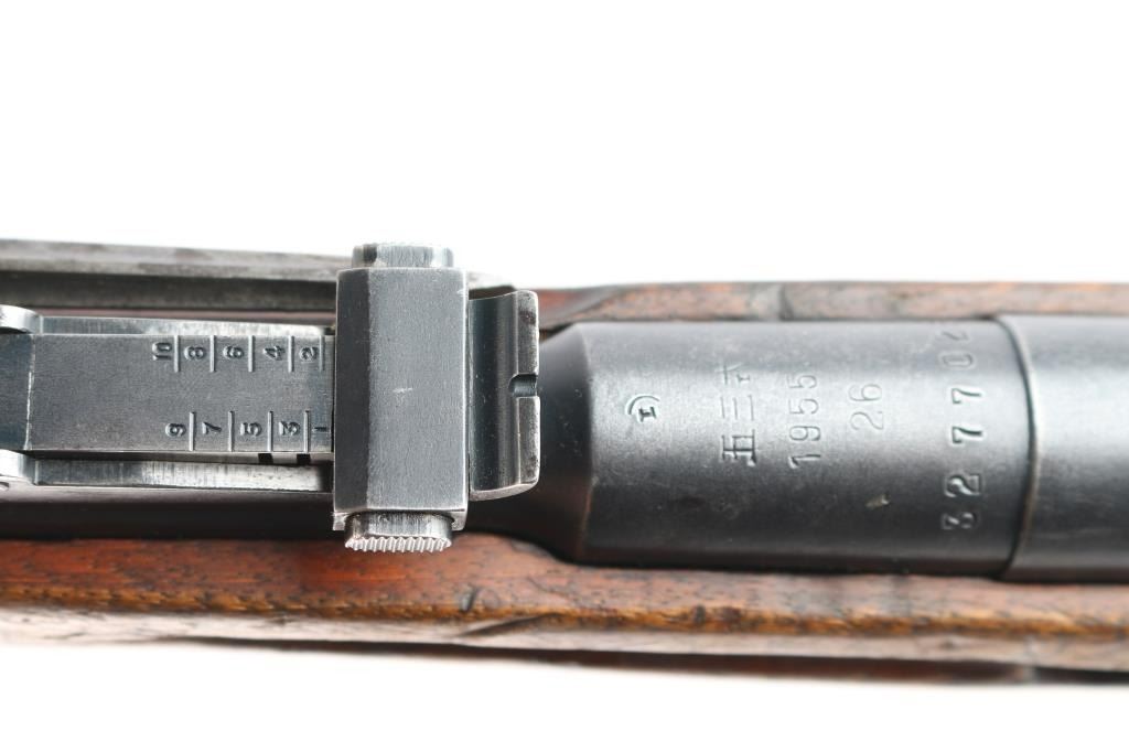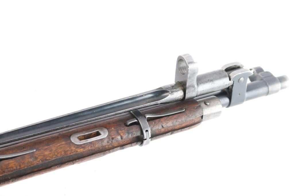 Chinese military bolt action rifle manufactured circa 1955 at the State Factory 26, arsenal 296 at Congqing, Sichuan Prov., China. Imported by Navy Arms Co., Ridgefield, NJ. and marked on the right side of the receiver. Modeled after the Russian M44. Features 20" barrel, post front sight inside protective ring, tangent style rear sight graduated to 1000 meters, straight bolt handle, sling slots, no cleaning rod, smooth curved trigger, and folding spike bayonet. Bore is excellent/bright, strong rifling. Retains 75% bluing and metal shows light scattered rust on bayonet, buttplate, and stock metal. Bolt assembly is in-the-white. Wood is in serviceable condition with heavy handling marks. Serial numbers do not match.