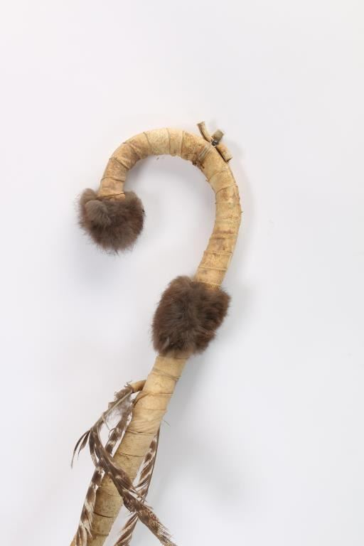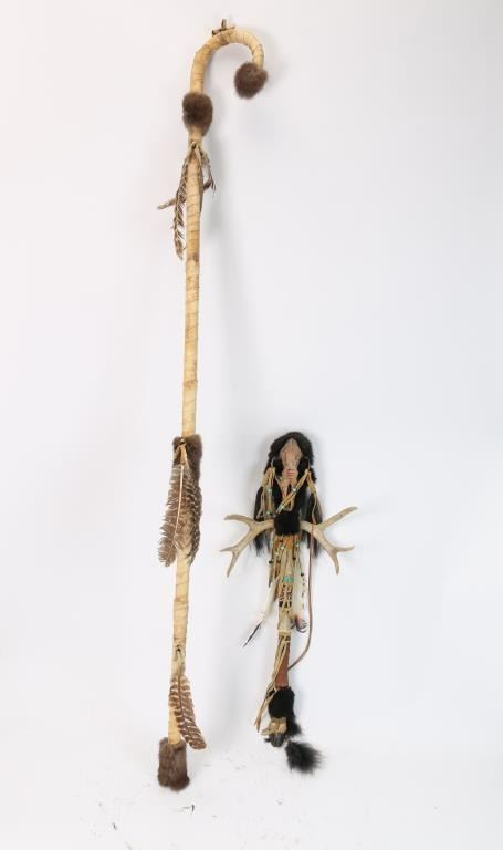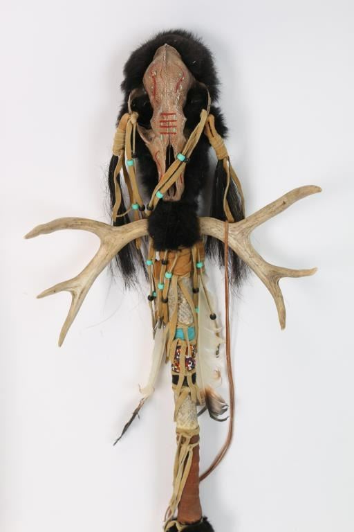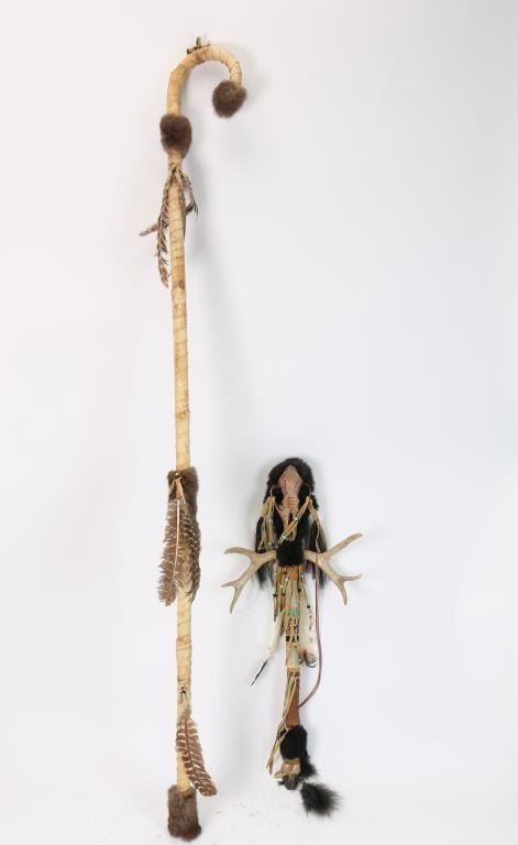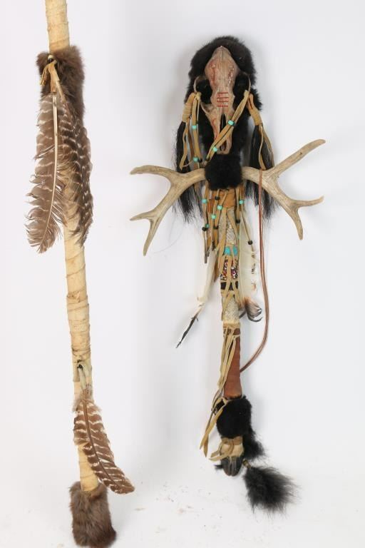 Includes: (1) Staff with deer antlers and skull. Staff has deer hoof, and is wrapped in leather, snake skin and beads. (1) Leather wrapped staff with fur and feathers.