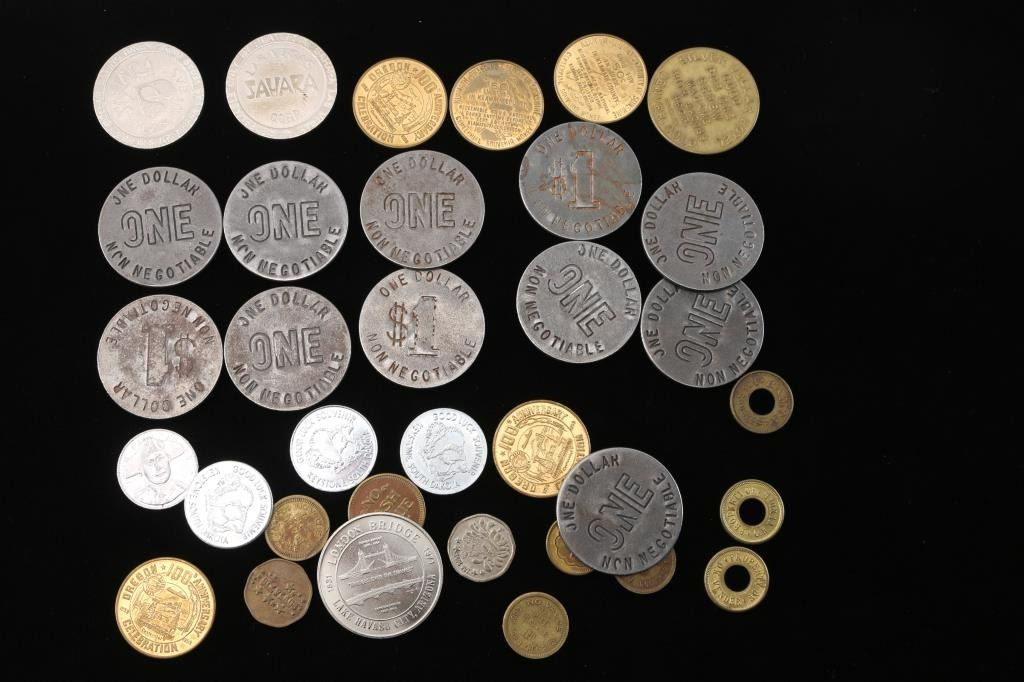 Includes: (11) $1 tokens, (2) Sahara gaming tokens, (5) Oregon 100th Anniversary Coins, (3) Mount Rushmore National Memorial Good Luck token, (3) Pile Driver gaming tokens, (3) Gaming tokens with hole punched in center, (2) Six Flags tokens, (2) Misc. tokens, (1) Silver Dollar Hotel token, (1) Havasu London Bridge coin, (1) Shell's Famous Facts & Faces token.