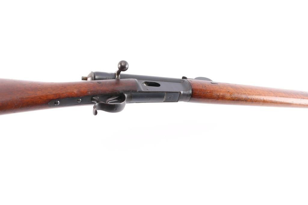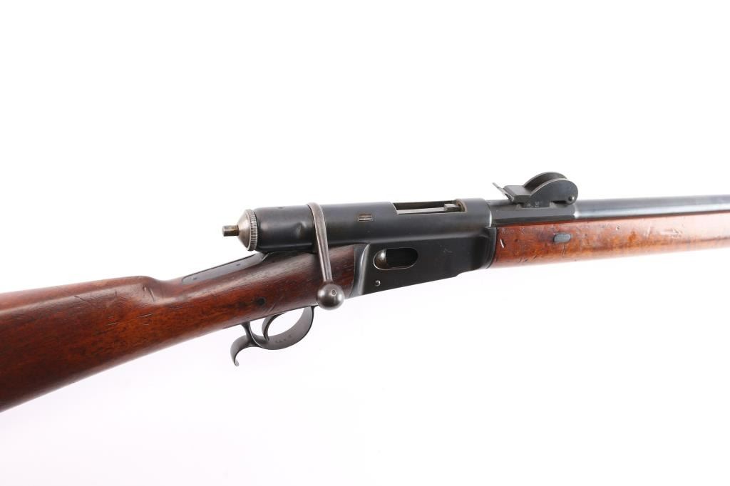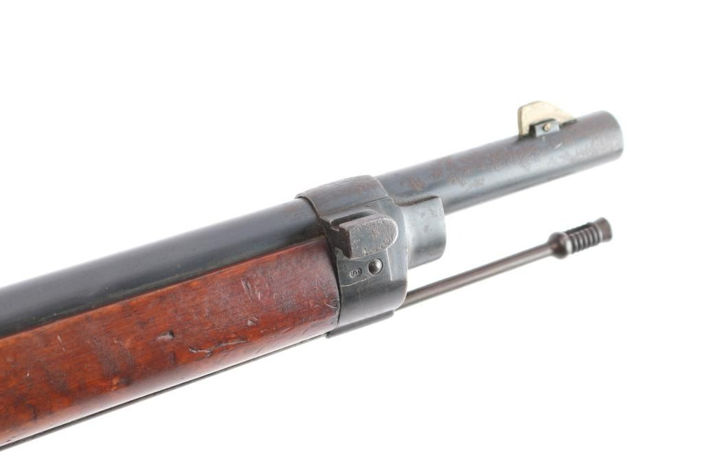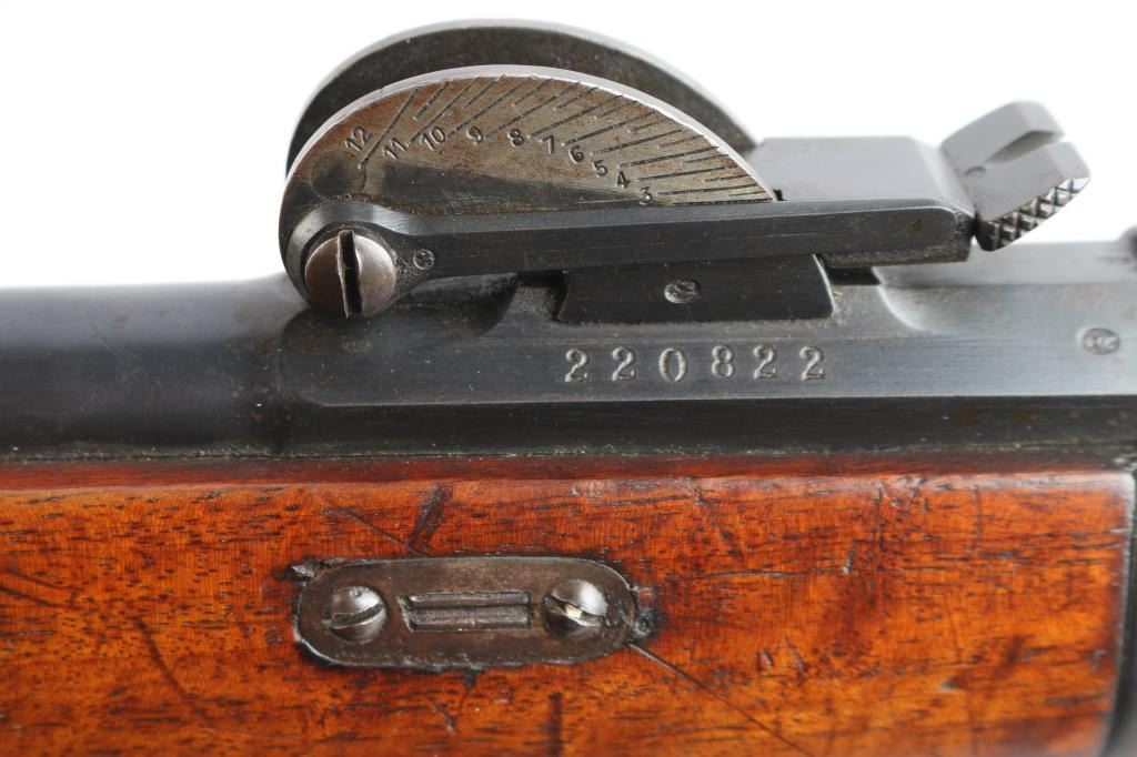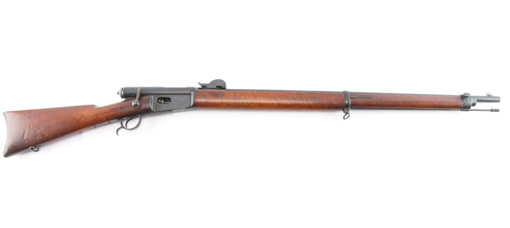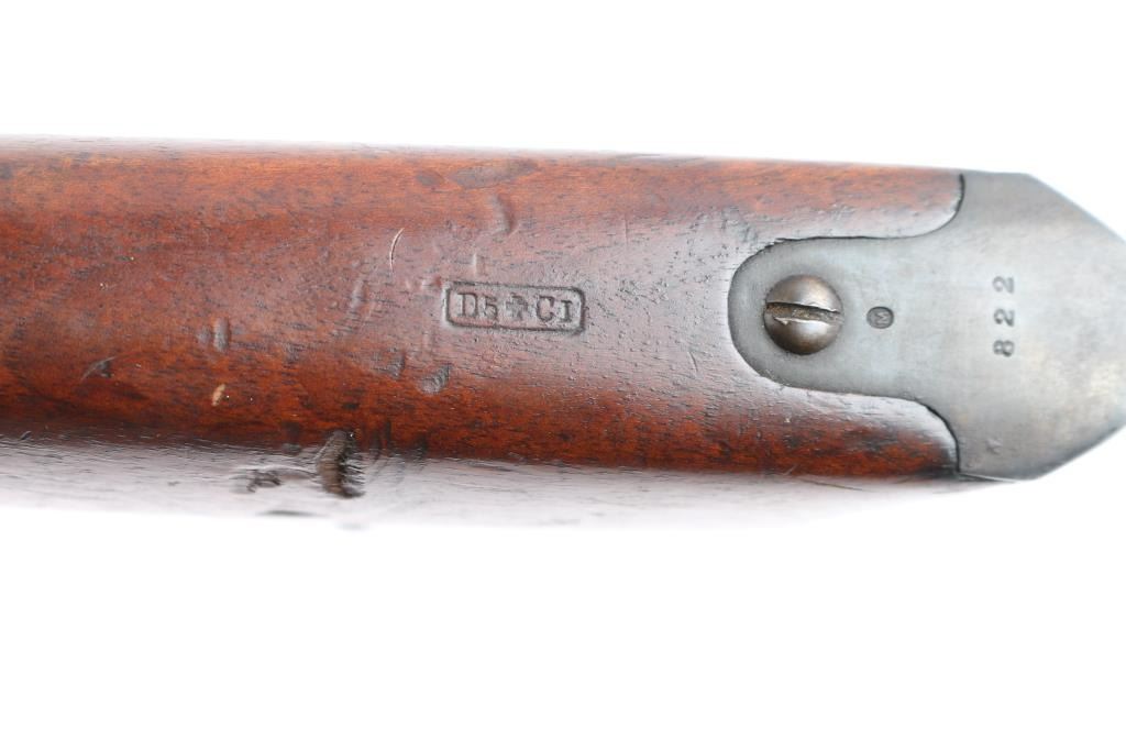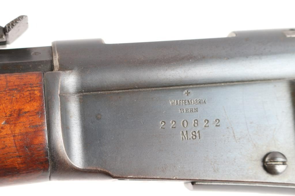 SN: 220822. Antique Swiss military tube-fed bolt action rimfire service rifle. Stamped "Swiss Cross, serial number, Waffenfabrik Bern M81" on left receiver. Features a blued finish, 33" barrel, blade front sight, elevation adjustable rear sight, 13-rd tubular magazine under barrel, smooth trigger, finger rest trigger guard, cocked indicator on the rear if the bolt, cleaning rod, straight grip shoulder stock with smooth metal buttplate and cross hatching on forend. Matching serial numbers are found on the barrel, receiver, butt plate tang, bolt shroud and lifter. Manufacture Dates: 1882-1889. Swiss proof marks, Crown over "R" inspection cartouches on right forearm & butt stock inspection and acceptance marking. (Reymann), "D5 C1 cartouche with Swiss cross in between in comb. Blue is about 85% with handling/edge wear, bore is excellent/bright, action is smooth and the wood is good/sound with some dents, mostly in the butt stock.