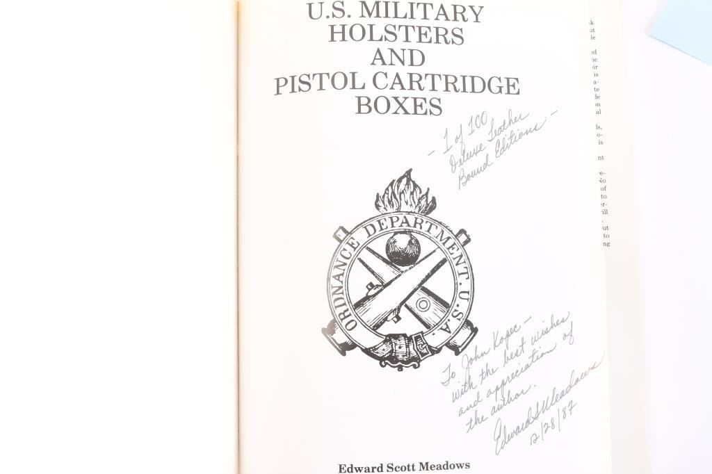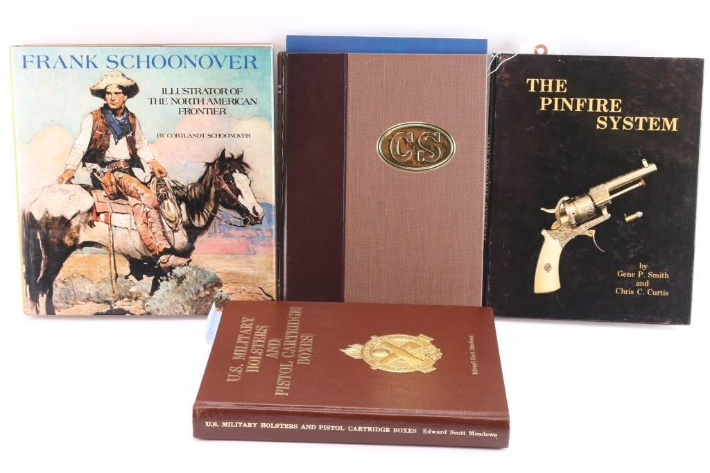 1. Pinfires by Curtis and Smith - 1987 inscribed by Curtis to Kopec. 2. Frank A Schoonover - Illustration of Frontier by Cortlandt Schoonover depicts Tex and Patches on the front used in Colt iconic advertiser. 3. Confederate Revolvers - Bill Gary (of Prescott, AZ) with inscription to John Kopec. 4. U.S. Military holsters and cartridge boxes by Meadows. Inscribed by author to Kopec.