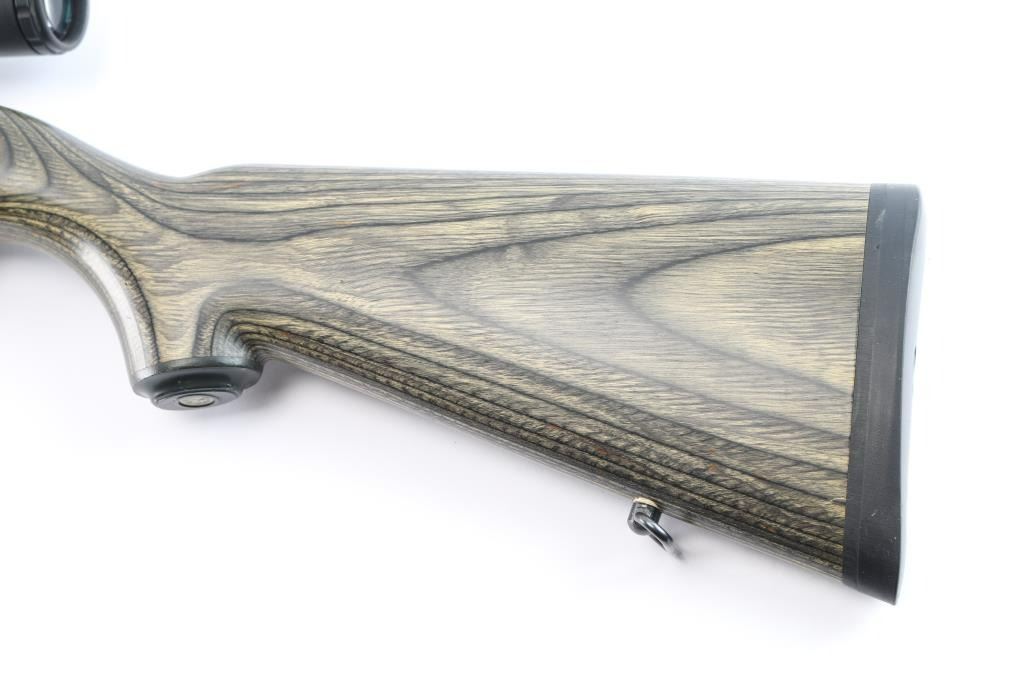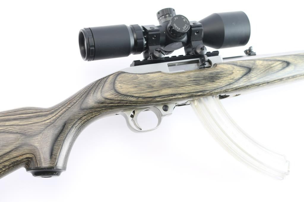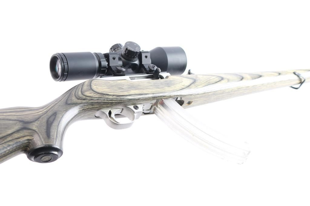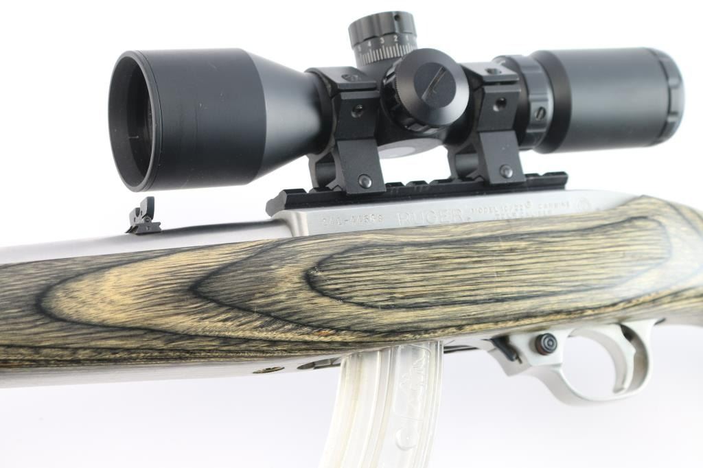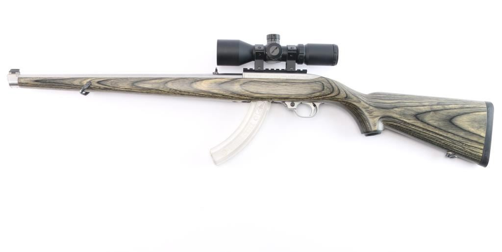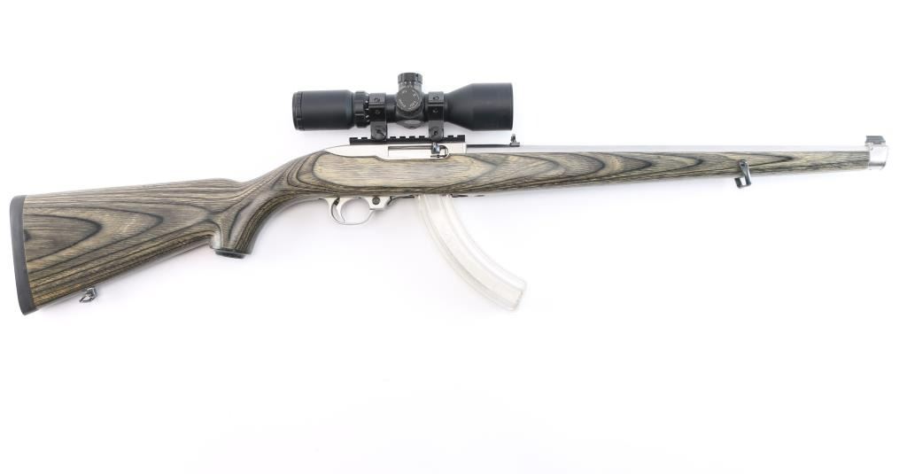 Sturm, Ruger & Co., Inc.10/22 manufactured Southport, CT. chambered in 22 LR. Featuring a stainless 18.5" barrel, and in-the-white receiver with a green/black laminated Mannlicher stock configuration, rubber recoil pad, blade/brass bead front, and flip white diamond rear sights, metal trigger housing and parts, smooth curved trigger, Ruger grip cap, sling swivels, and the receiver drilled/tapped for optics. Includes Butler Creek 25 round magazine. Bore is bright with good rifling. Wood is very good with light handling marks. Stainless steel finish is very good condition at 98%, and there are some light scratches on the barrel. The receiver also displays some light scratches. It also features a picatinney rail fitted with rings and a 3x-9x scope (manufacturer cannot be identified) with duplex reticle having bullet drop compensation, and windage.