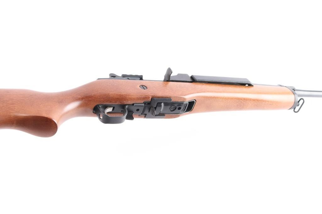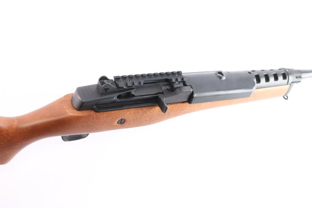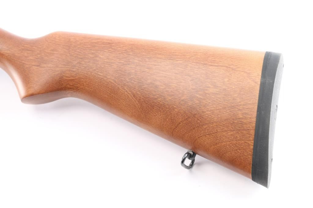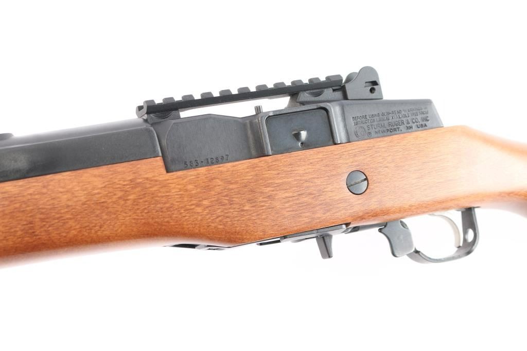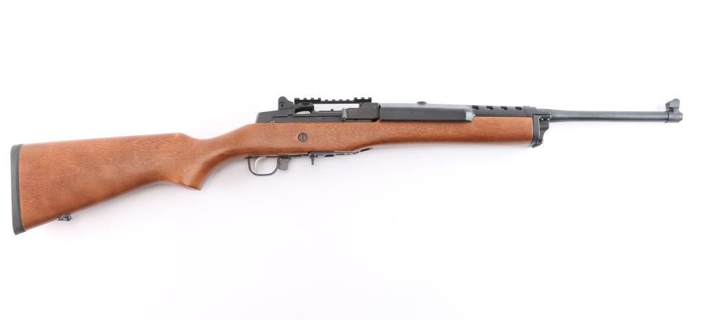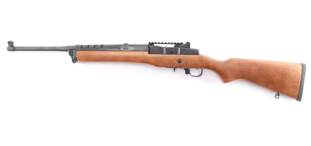 Semi-automatic rifle chambered in 5.56 NATO ammunition. Features parkerized finish, smooth wood stock, black polymer vented handguard, 18" barrel with a winged blade front sight and an adjustable peep rear sight, manual safety, silver colored smooth curved trigger, sling swivels and Picatinny top rail attached for optics. Bolt stop button on left receiver rail. Bore is very good/bright. Retains approx. 98% parkerized finish with no visible handling marks and or edge wear. Stock is excellent. Includes (1) Ruger 5 round magazine. Condition is NRA Excellent. ***Modern Firearm***.