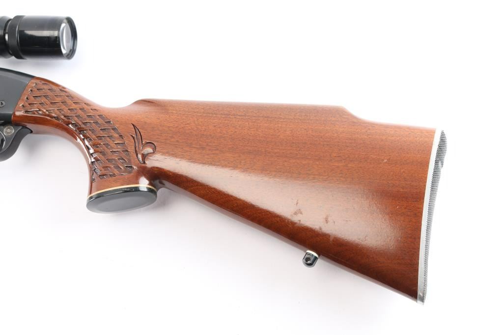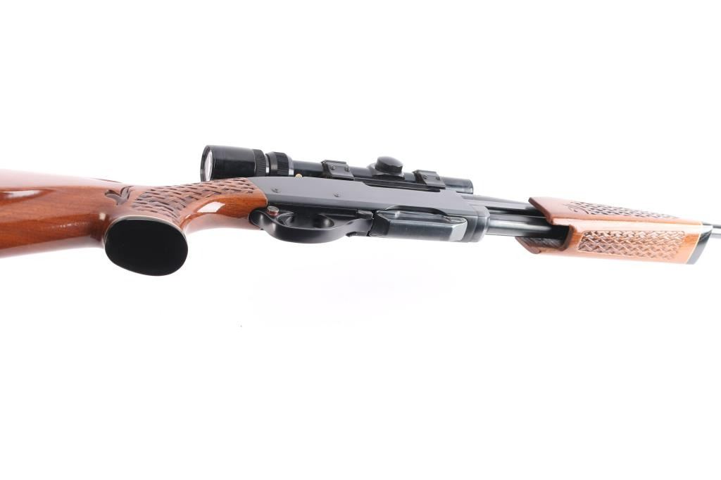 The 'Gamemaster'. Pump action rifle chambered in .308 Win., circa 1958. Features blued finish, 22" barrel with a serrated ramp blade/bead front sight and sporting adjustable rear sight, checkered "weave' pattern wood pump handle and wood stock with curved grip, checkered black plastic buttplate and black grip cap with a white spacer. Detachable four round box magazine, sling swivel studs, curved beveled trigger and push button safety. Dual action bars. Mounts a Bushnell Banner II, 1.5 - 4X scope with a fine cross hair reticle. Bore is very good with strong rifling. Retains approx. 95% finish with no noticeable wear, except for small action wear under the barrel and action bars. Wood is very good with a couple of tiny dents and marring on the butt stock. Action is smooth and scope is clear. Condition is NRA Very Good. ***C&R Firearm***.