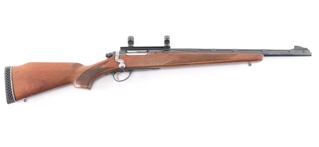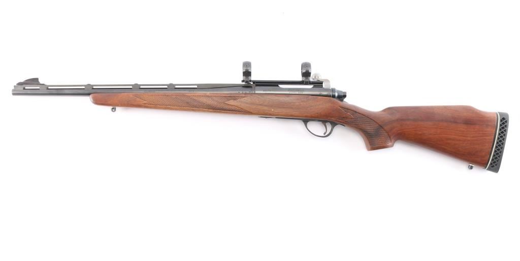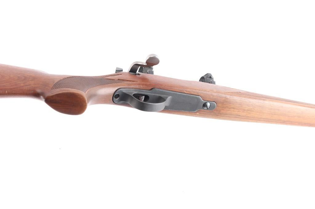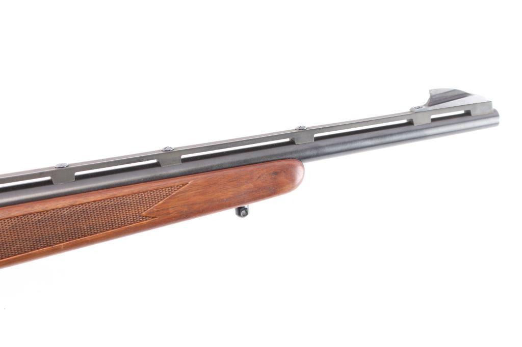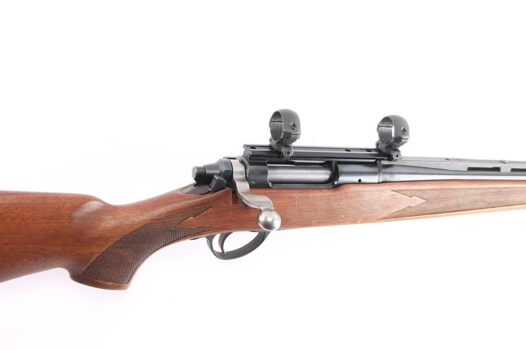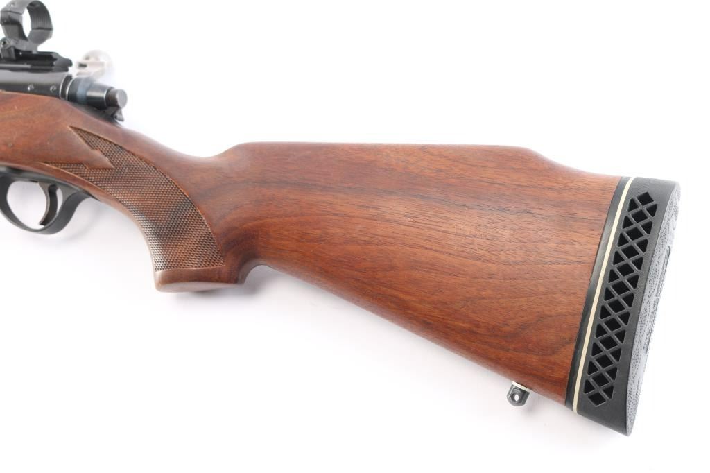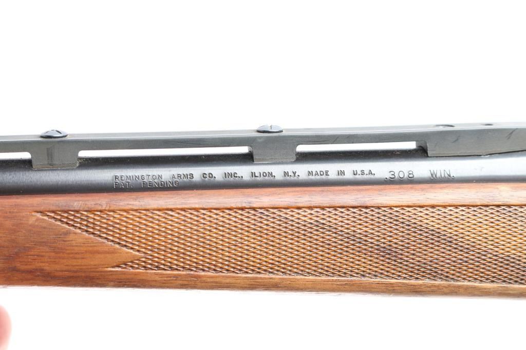 Bolt action rifle chambered in .308 Win., circa with 1964- 1968. Features blued finish, vent ribbed 18.5" barrel with ramped blade front sight and no rear sight, mounted 1" scope rings on single piece Weaver scope base, wood stock checkered at wrist and forearm, manual safety, "dogleg" bolt handle with serrated flat on bottom of knob, internal magazine, aluminum triggerguard, serrated wide trigger. Bore is excellent condition. Retains 95% finish with some edge losses, handling marks. Polymer barrel rib has faded to a dark gray color. Wood is good with some scattered scratches and dents. Condition is NRA Good++. ***C&R Firearm***.