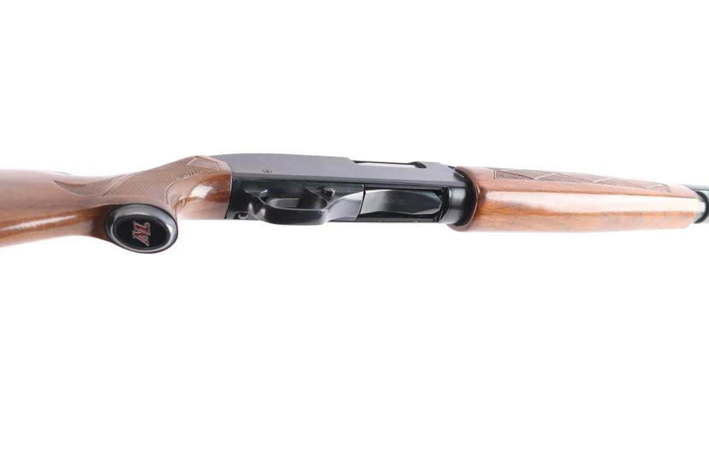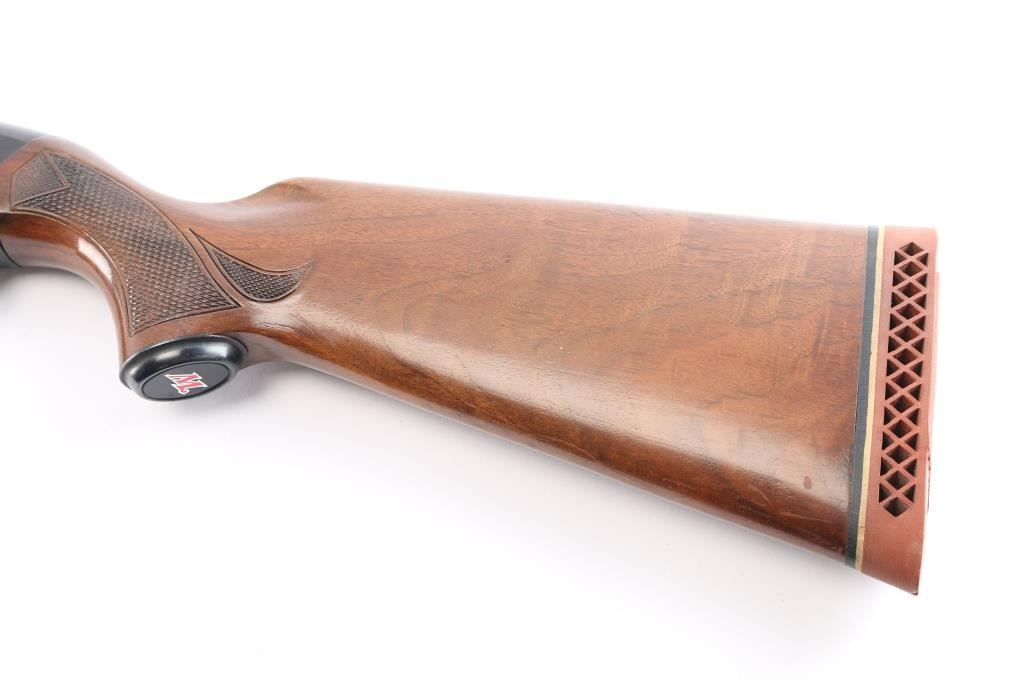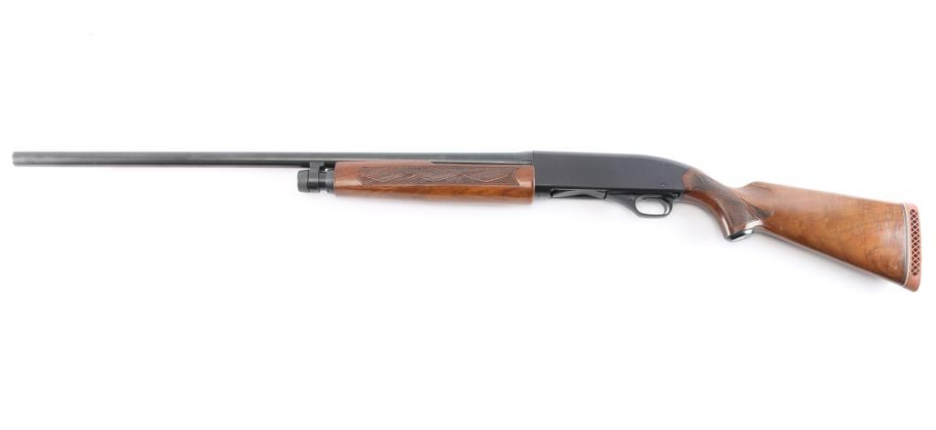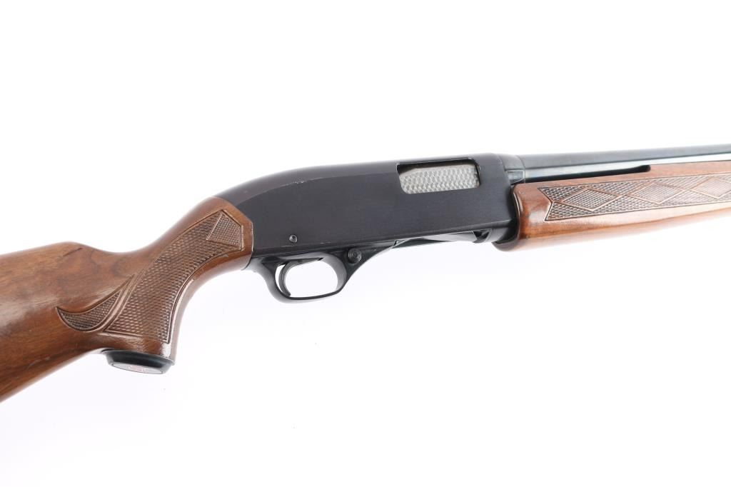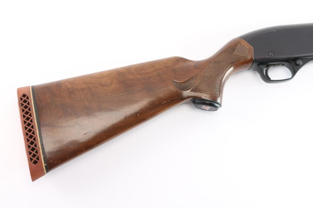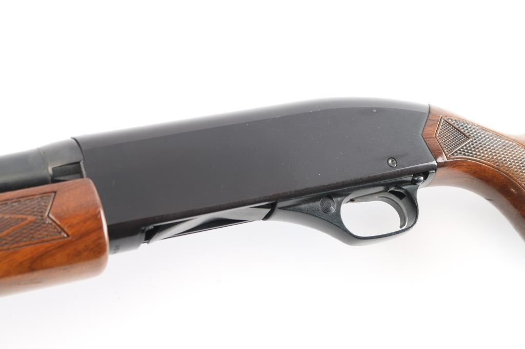 Pump action shotgun chambered in 12 Gauge for 2 3/4" shotshells, circa 1964 to 1972. Features blued finish, black anodized aluminum alloy receiver, black polymer trigger guard, 28" barrel MOD fixed choke, aluminum bead front sight, push button safety, 'jeweled bolt', checkered wood pump handle, smooth wood semi-pistol grip shoulder stock, checkered at wrist, with factory ventilated rubber recoil pad and black grip cap. Bore is very good/bright. Retains 94% finish with dings and scratches, edge wear, and handling marks. Wood is very good with some minor scratches.