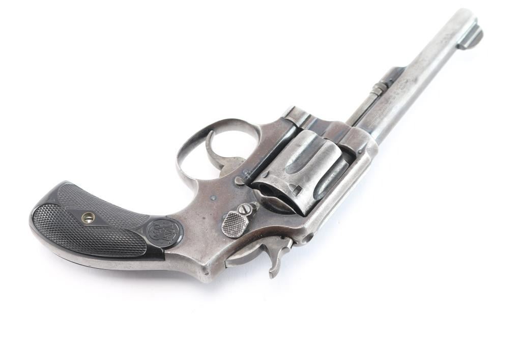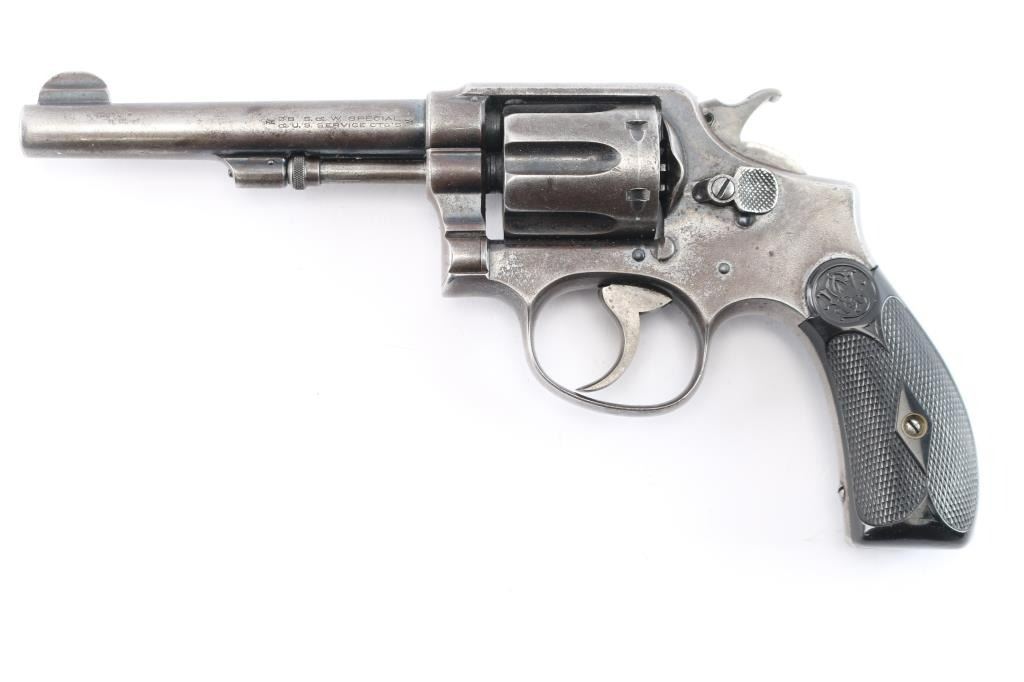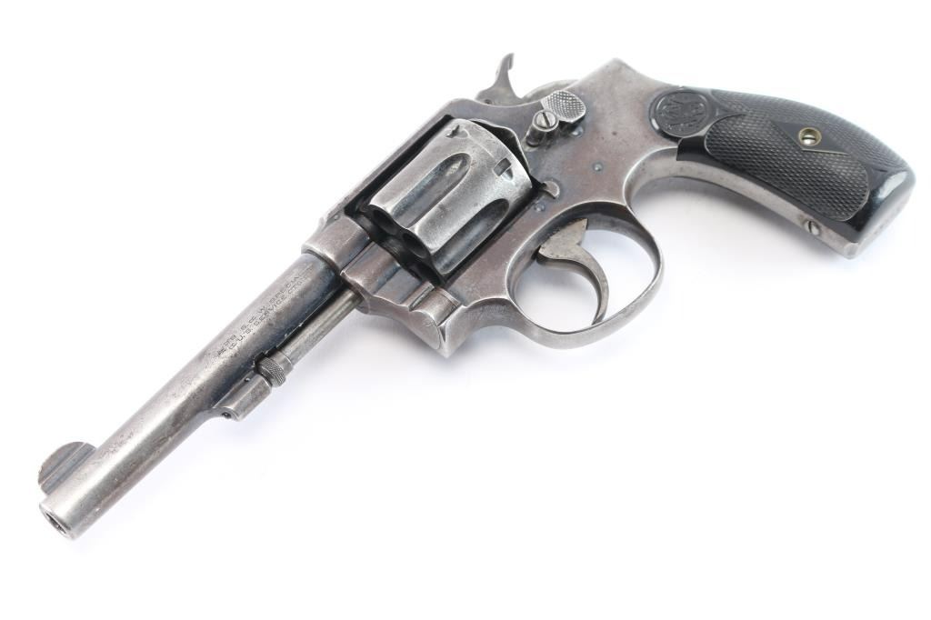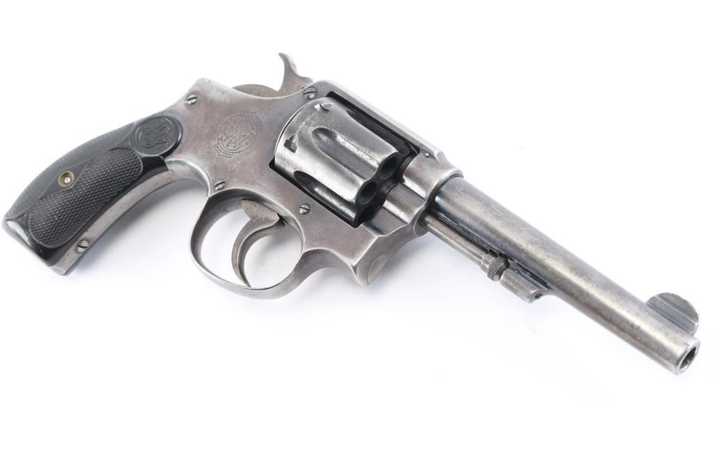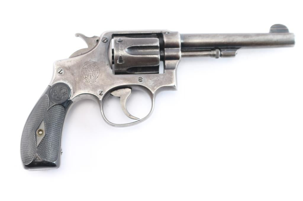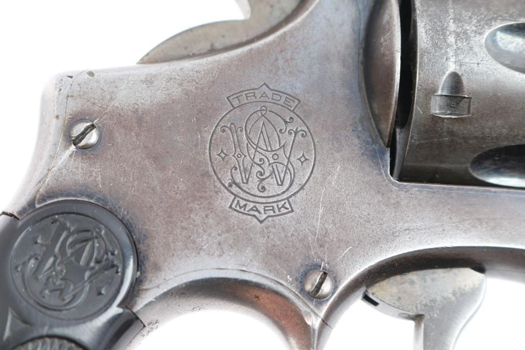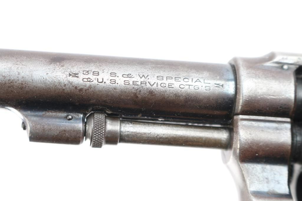 Smith & Wesson 2nd model ( Model of 1902) M&P .38 Special. Circa 1902-1903. 5" tapered, pinned barrel, half moon front blade, small integral u-notch rear sights, round butt K frame with four screws, checkered hard rubber grips with S&W motifs, blued finish, exposed extractor rod. Large S&W trade mark on right sideplate, two line address/patent dates on top of barrel, cartridge info on left barrel. Markings are clear/readable. Serial number matched on heel, cylinder and barrel. Bore is bright, strong rifling with some scattered light pitting, the grips are very good, action is smooth with tight lock-up and the blue is about 10% in protected areas with a rest a brown/gray patina.