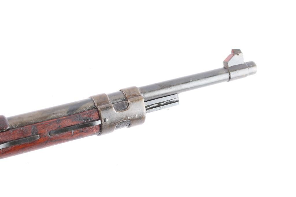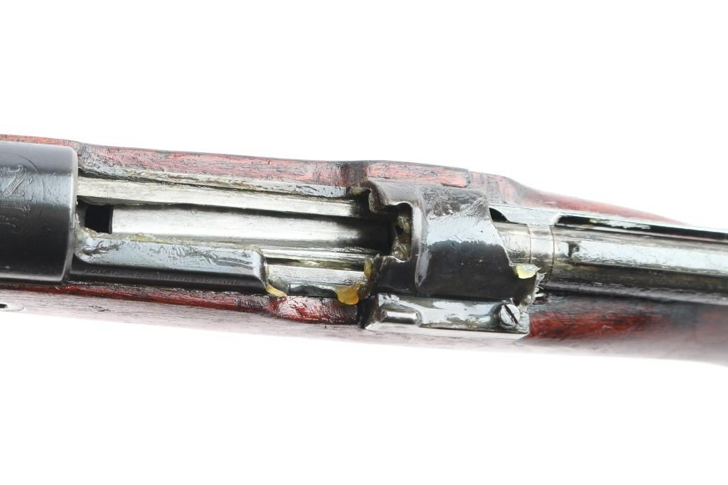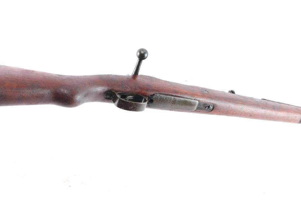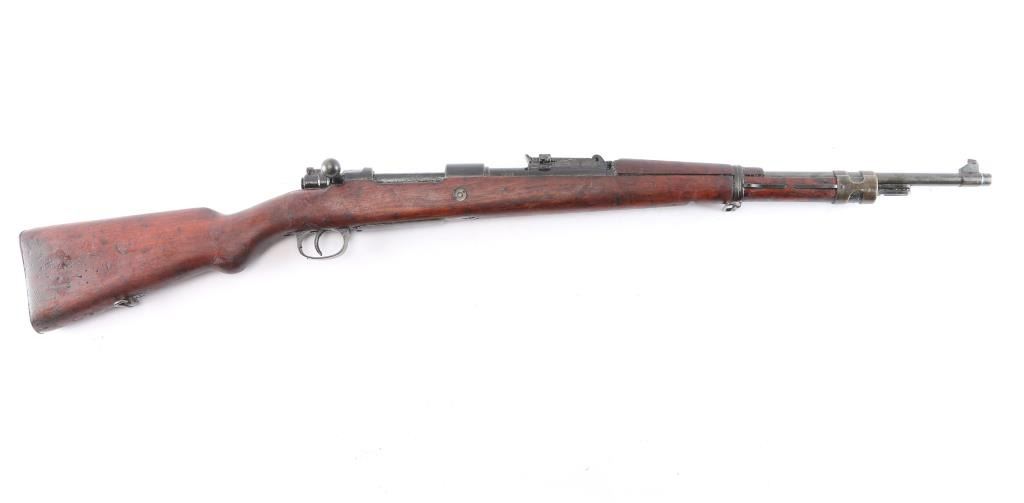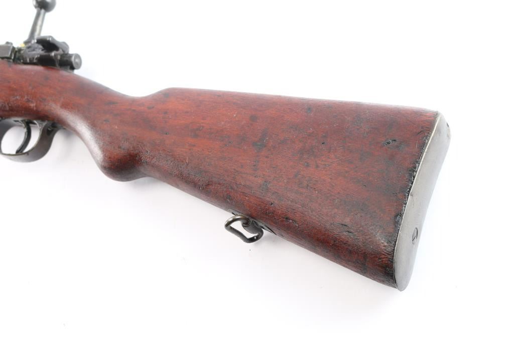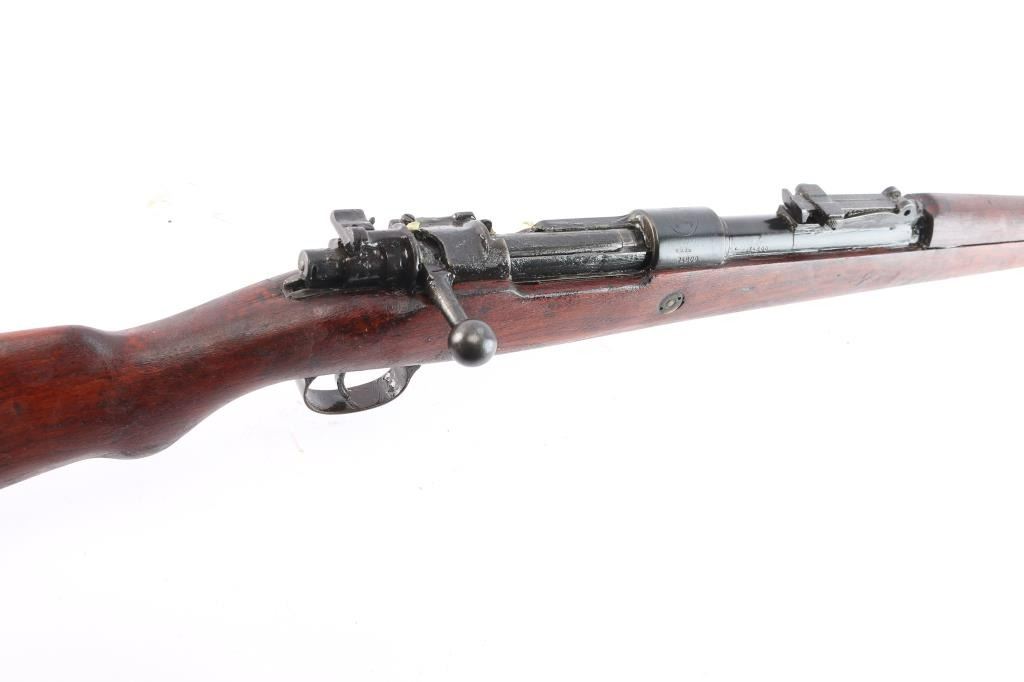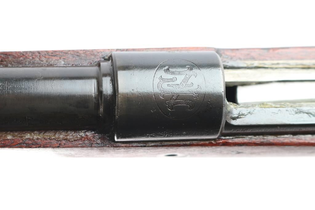 FN produced WW2 military style infantry bolt action rifle. It appears to be a Model 1930. Featuring a 24" barrel with inverted 'V" ramped front sight (painted), and tangent rear sight graduated to 2000 meters. Manufacture date not found. Serial numbers don't match. Blued flat buttplate showing patina, no cleaning rod, smooth curved trigger, no bolt disassembly disc in stock, semi-pistol grip stock, smooth handguard, smooth forend, straight bolt handle, five round internal box magazine,early style 'H' type front barrel band, a sling swivel on the rear barrel band, and a sling swivel in the stock. Bore is full of cosmoline and rifling cannot be determined. Stock and handguard are good with minimal handling wear, although, there's a dent in the stock behind the barrel band. Blued finish is about 80% with minor handling/edge wear. Barrel bands, floorplate, trigger guard and trigger show a brown patina. Action is crisp/tight.