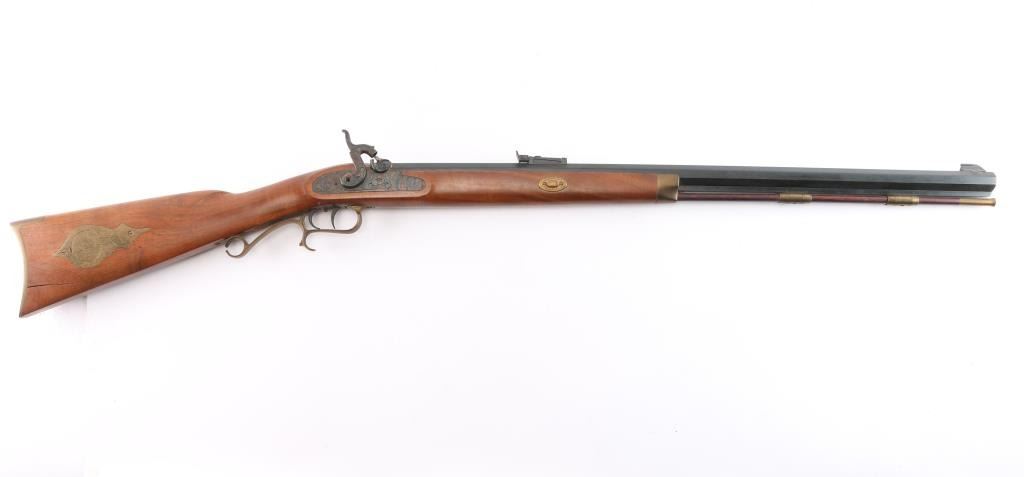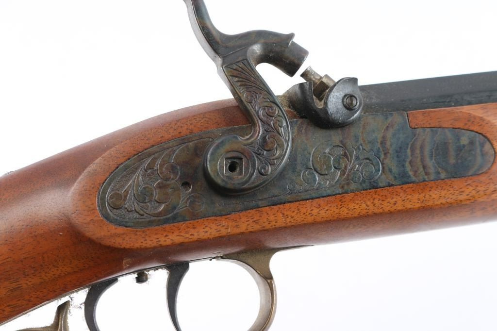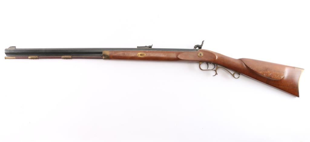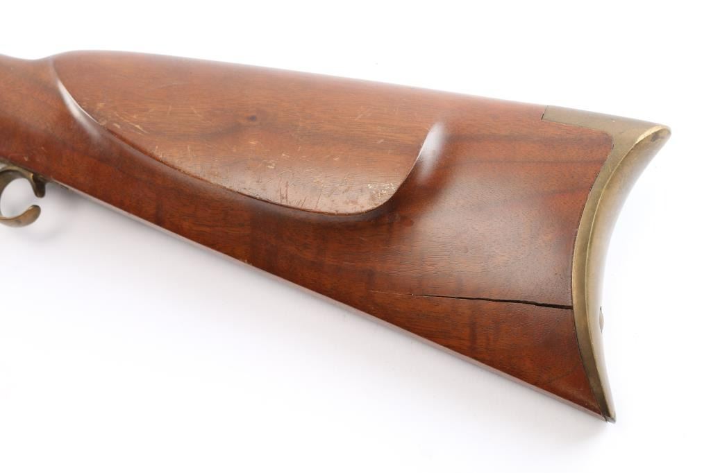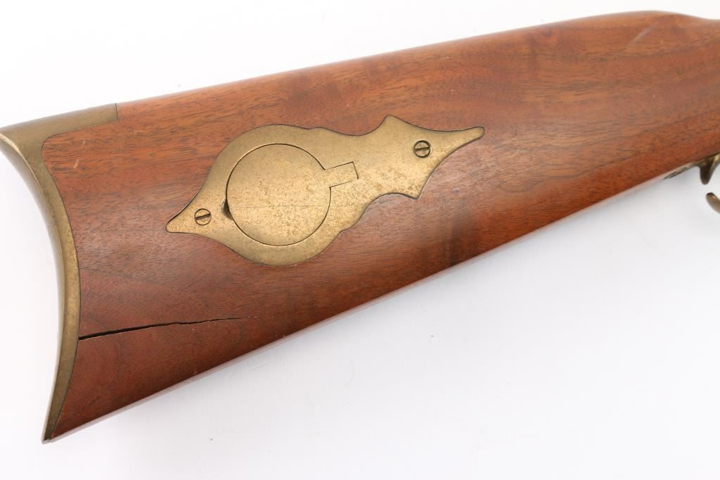 Sn: 111485. Single shot muzzle loading percussion plains rifle uses Black Powder (or Pyrodex or similar powder) only. Features blued 29" octagon barrel, with a blade/bead front & adjustable barrel mounted rear sight, wood ramrod under barrel, stock with brass plated fittings, right hand cheek rest, crescent buttplate, patch box, double set triggers, case colored lock and hammer. one piece smooth wood stock. Bore is very good/dirty. Wood is good with a large crack at the toe of the buttstock, minor dents and scratches on the left side of the stock. Needs cleaning. Condition is NRA good.*** Antique Firearm***.