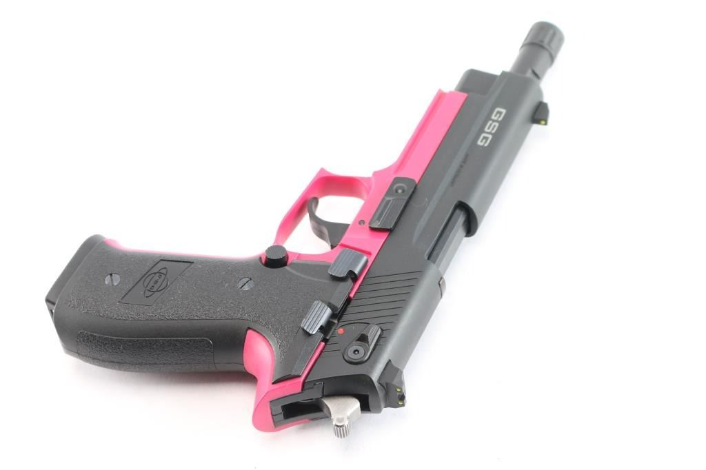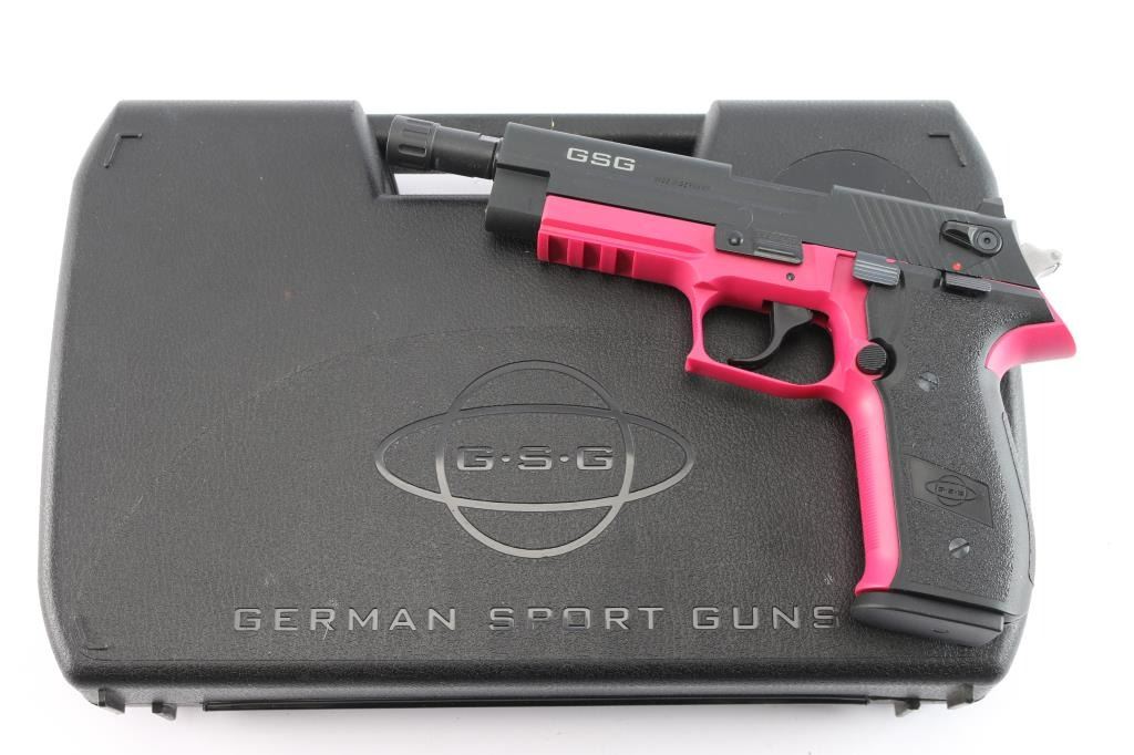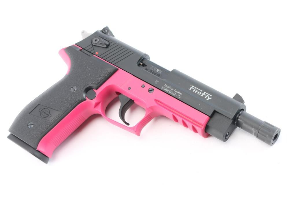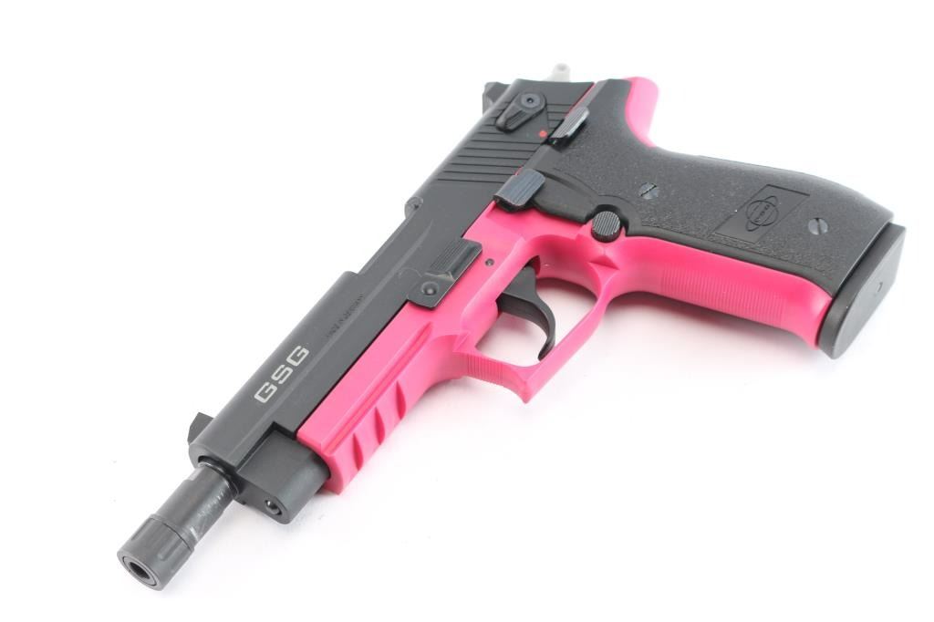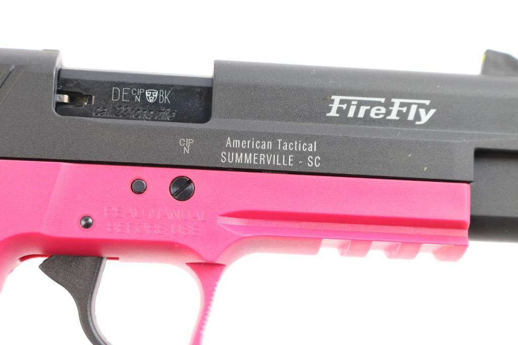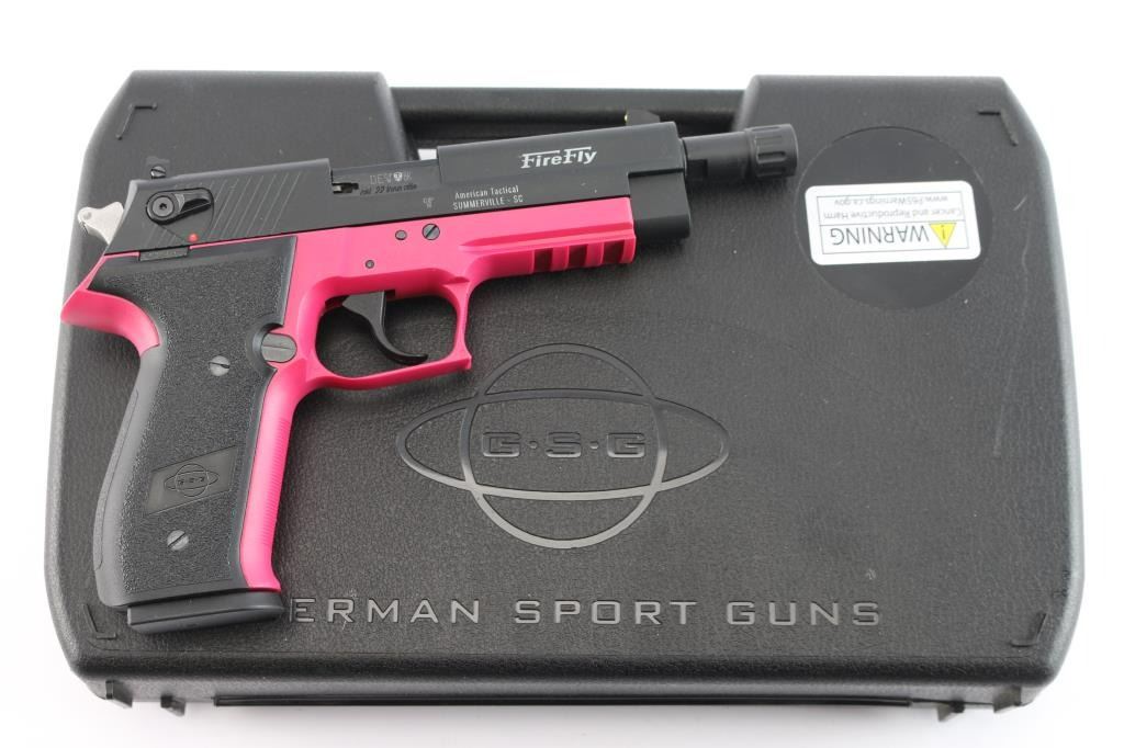 German made American Tactical GSG Firefly 22 LR blowback pistol. 51/2" threaded barrel with thread protector. Features a wear-resistant polymer pink frame, integrated accessory rail, Black Zinc Alloy Slide, fixed 3-dot sights, textured black polymer grip, slide mounted ambidextrous safety, smooth wide trigger, push button mag release. Comes in factory hard case with 3 ten-rd magazines, manual, cable lock, spare thread protector, tools, sights. Pistol is like new, appears unfired.