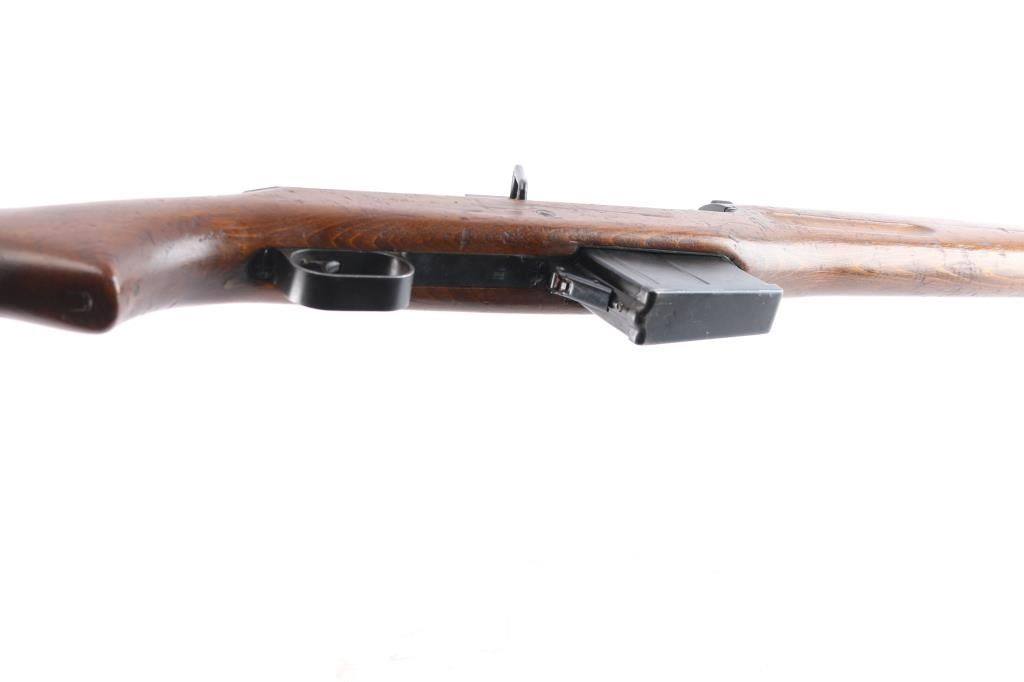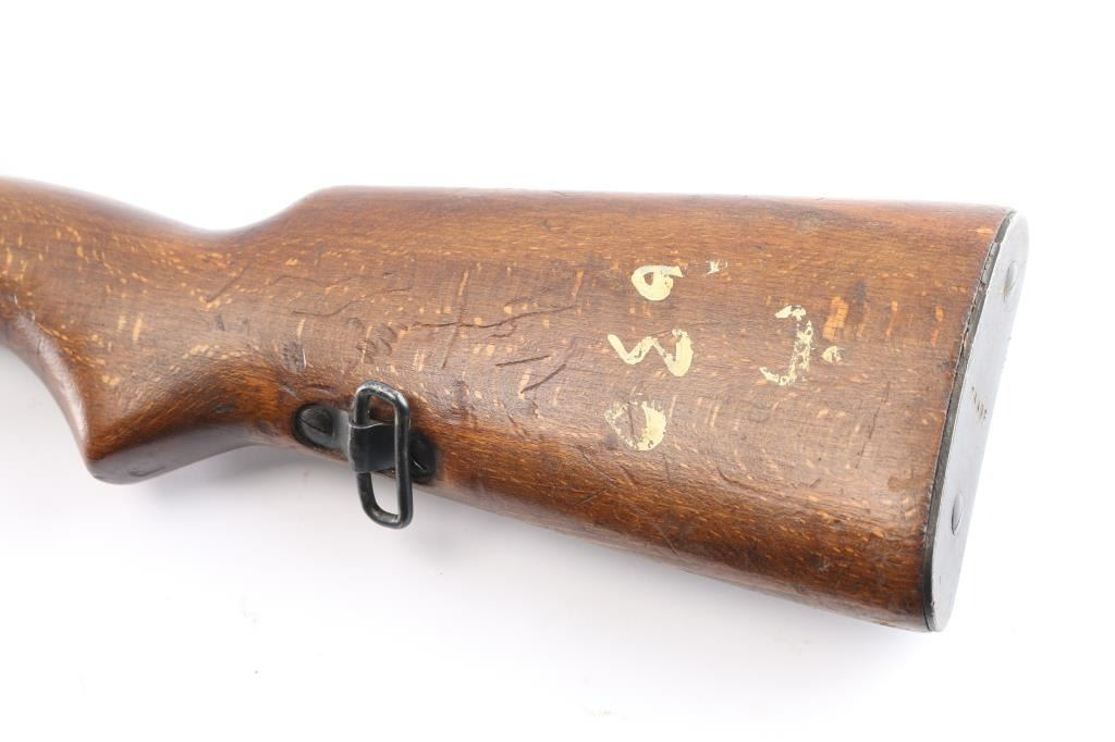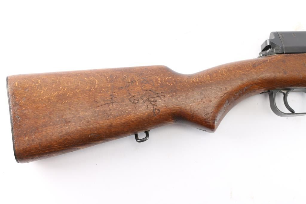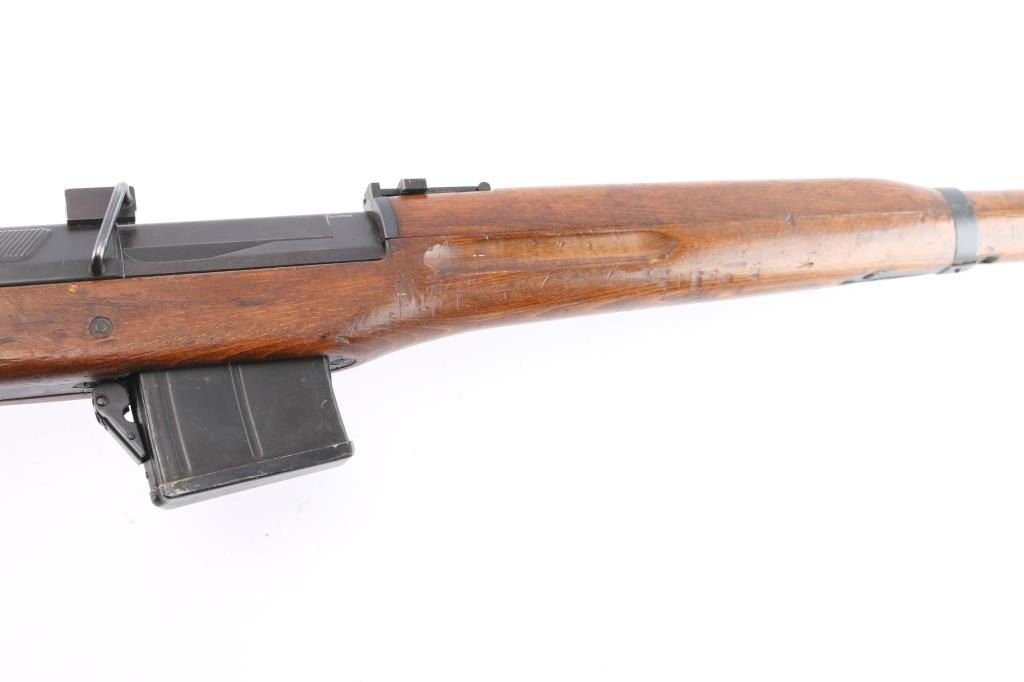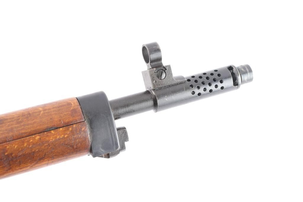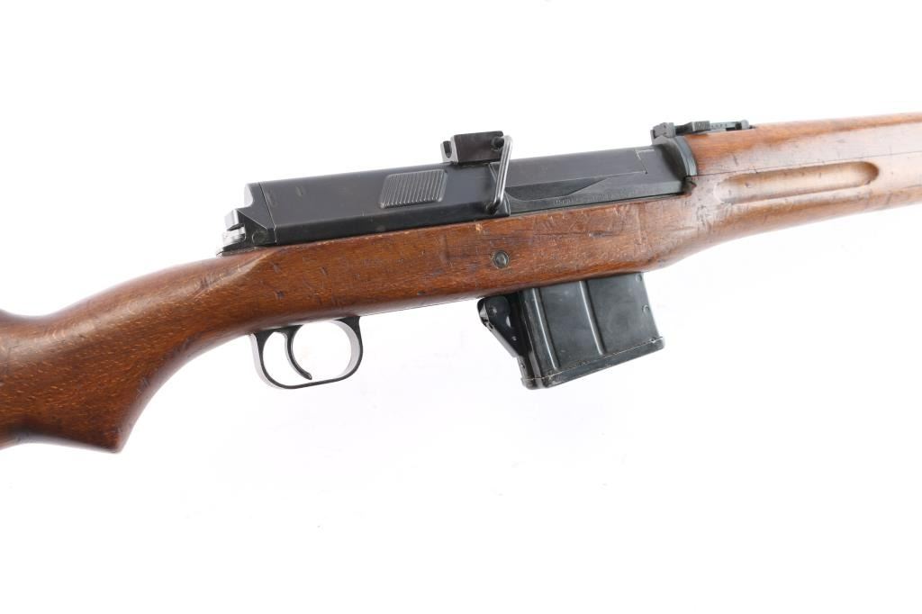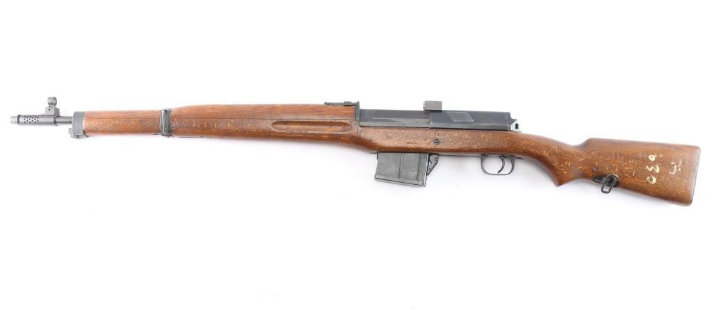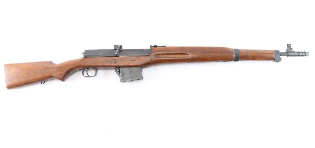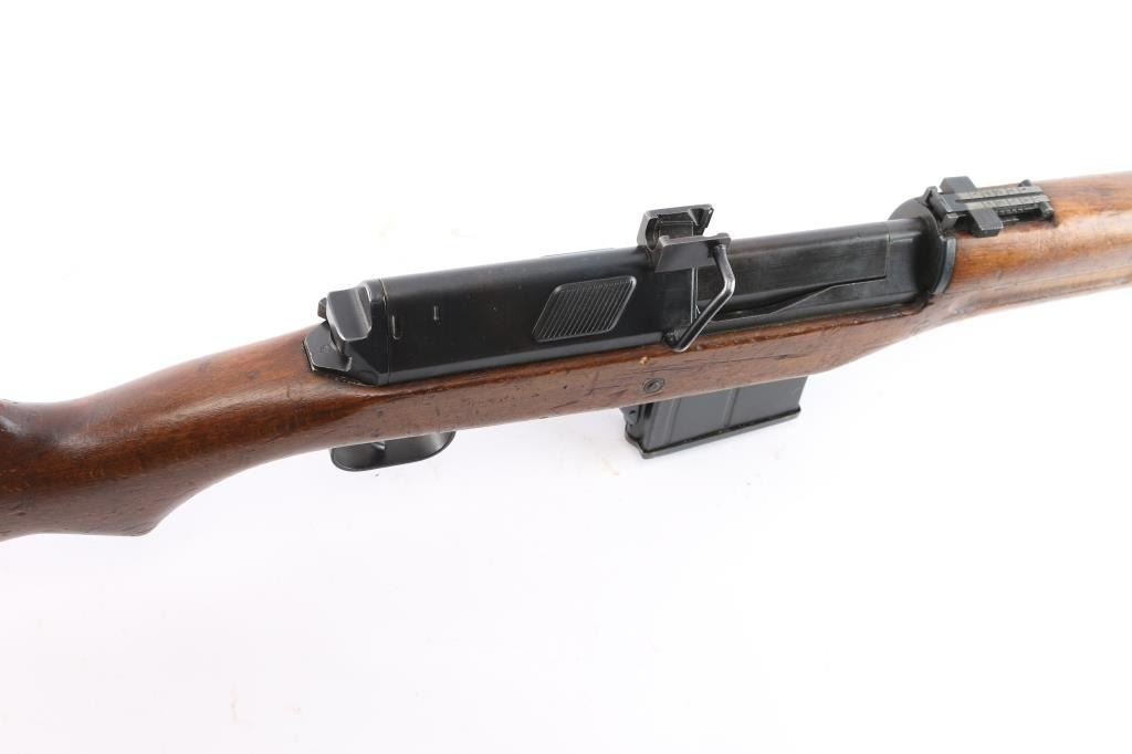 Egyptian military gas impingement semi-automatic service rifle based on the Swedish "Ljungman" chambered in 7.92x57mm Mauser, manufactured by Maadi circa 1950's. Imported by SAMCO of Miami, F.L. with importer marks on the barrel and receiver. Features a blued finish, 24" barrel with integral compensator, hooded post front sight, tangent rear sight graduated to 1000 meters, bayonet lug, adjustable gas valve, detachable 10 round magazine, smooth curved trigger, manual safety, sling swivels, smooth wood handguard and a semi-pistol grip shoulder stock with smooth metal buttplate. Rifle exhibits approximately 85% of it's blued finish showing minor handling/edge wear, and bolt turning a little plum. Action is strong, bore very good, strong rifling, and wood stocks are good with mild blemishes and Egyptian trench art. Produced 1950's-1960's. Arsenal refinished.
