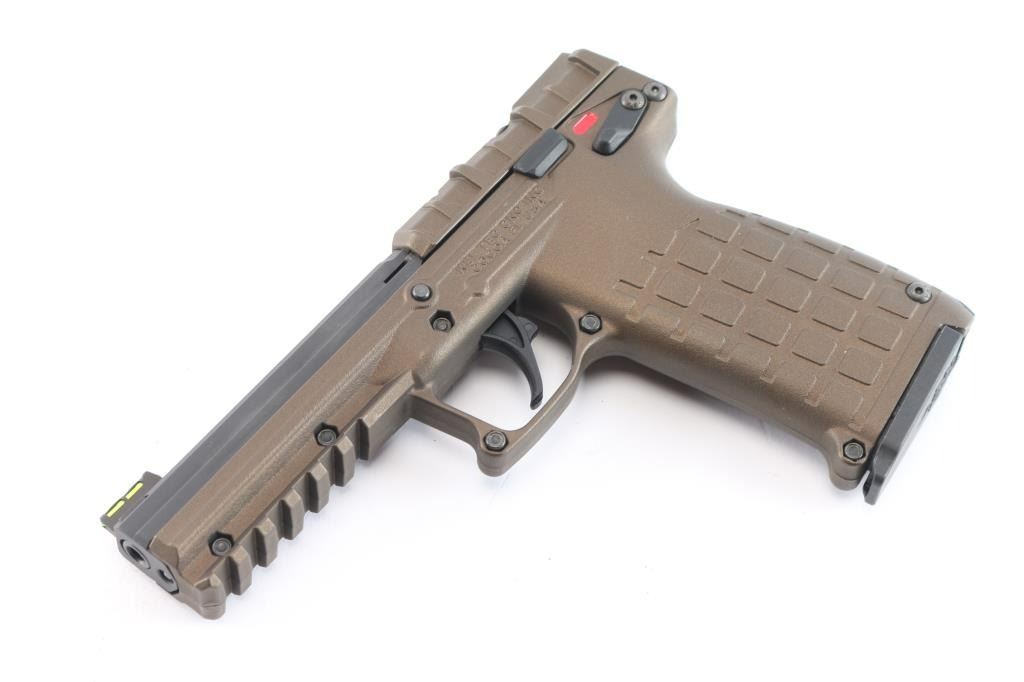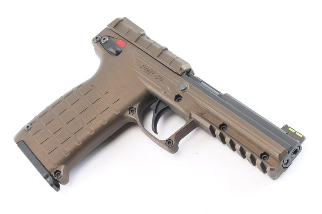 American made lightweight semi-automatic pistol, SA, hybrid blowback/locked-breech system lets you use a wide variety of ammunition and switches between them depending on the pressure of the cartridge, and the slide locks back after the last shot. It features an approximately 4 1/4" barrel with blued finish, high visibility fiber optic sights - single green in front sight and double orange in the rear, no exposed hammer, smooth curved trigger, 'midnight bronze' polymer frame with textured grips, accessory rail, heel magazine release, ambidextrous manual safety, 30-round double-stack magazine that fits flush in the grip. Bore is excellent/bright, overall excellent condition with 99% of finish remaining. Includes a black plastic case with instruction manual, four extra 30rd magazines, Hi Viz sight tool, and sticker.