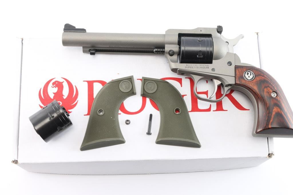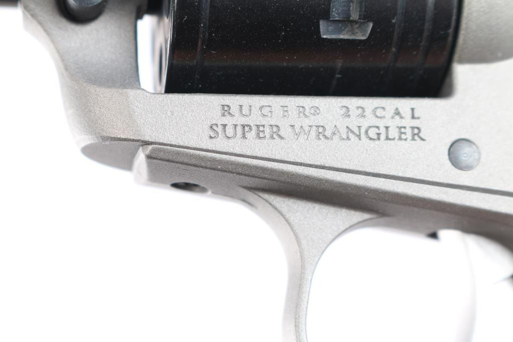 American made 6 shot revolver, chambered for .22 LR. Super Wrangler has a stronger steel frame and extra .22 Magnum cylinder, Features a 5 1/2" barrel, blade front and adjustable notch rear sights, transfer safety bar and loading gate, smooth curved trigger and knurled hammer spur. Silver cerakote finish, blued non-fluted cylinder and knurled hammer spur. Two piece smooth laminated wood grips with Ruger medallions. Bore is excellent. Retains approx. 98% finish with a faint drag line on the cylinder. Revolver is like new. Comes in factory box with matching label, .22 mag. Cylinder, manual, cable lock, and spare two piece checkered green synthetic grips with Ruger logo.
