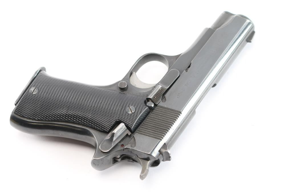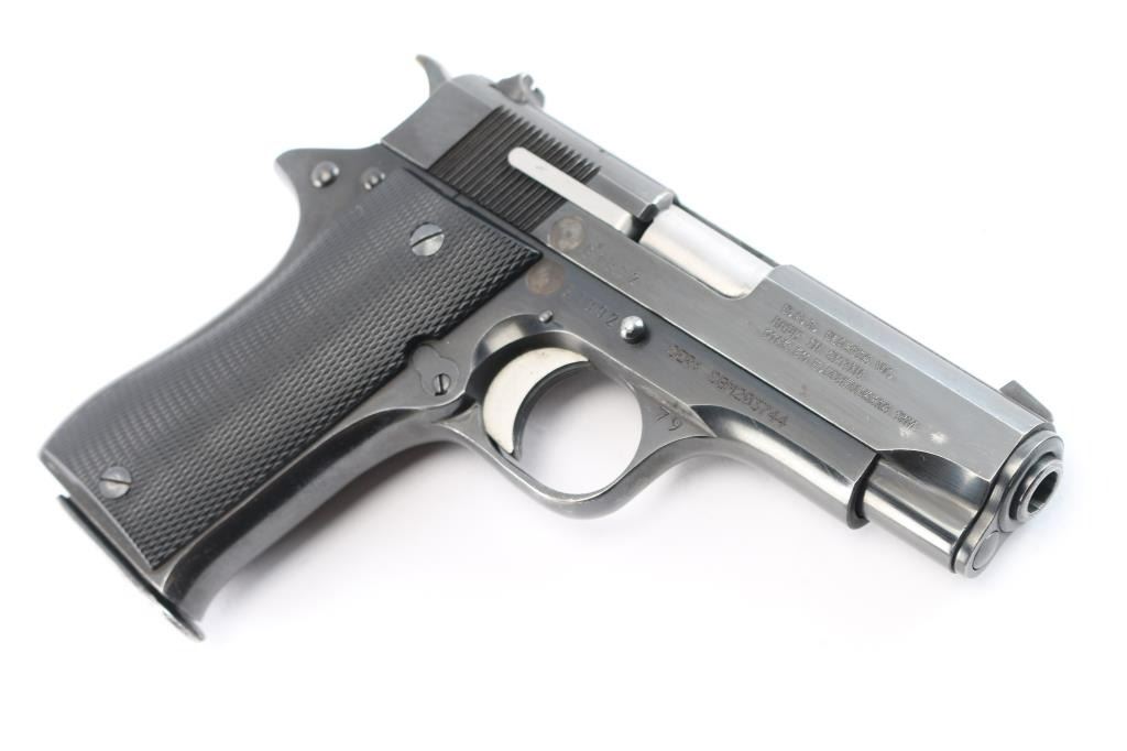 Spanish made single action semi-automatic compact pistol chambered in 9x19mm. Imported by C.A.I. of Georgia, V.T. with import marks on the right side of the slide & frame. Features a blued finish, 3.9" barrel, blade front sight, dovetailed square notch rear sight, serrated trigger, knurled hammer spur, manual safety on the left side of the frame, push button magazine release, 8 round magazine, steel frame and two-piece checkered black synthetic grips. Includes a factory cardboard box with extra magazine & manual (In Spanish). Pistol exhibits approximately 96% of it's blued finish showing some slight edge wear/rubs. Action is smooth, the bore is excellent and the plastic grips are excellent. Manufactured 1979.