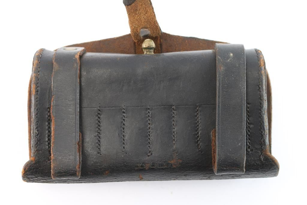 Rare early Indian War Era M1872 US Army Cavalry No. 2 Hagner Leather Cartridge box. Early 1870's Holds 24 .50-70 rounds. Embossed on the cover with US in oval, and having the swell in the side for a combination tool. Marked on the top section of box, “No.2,” and " A.R.S.” (the later for A.R. Smith, inspector) on the closure strap. Makings are feint from use. Has the Original Model 1879 Combination Tool for the 45-70 Trapdoor. Stamped "US Mod 1879". Complete with all stitching intact.