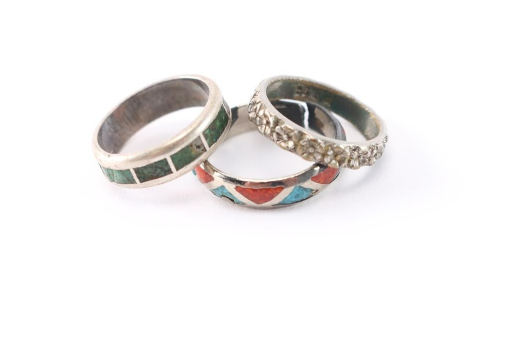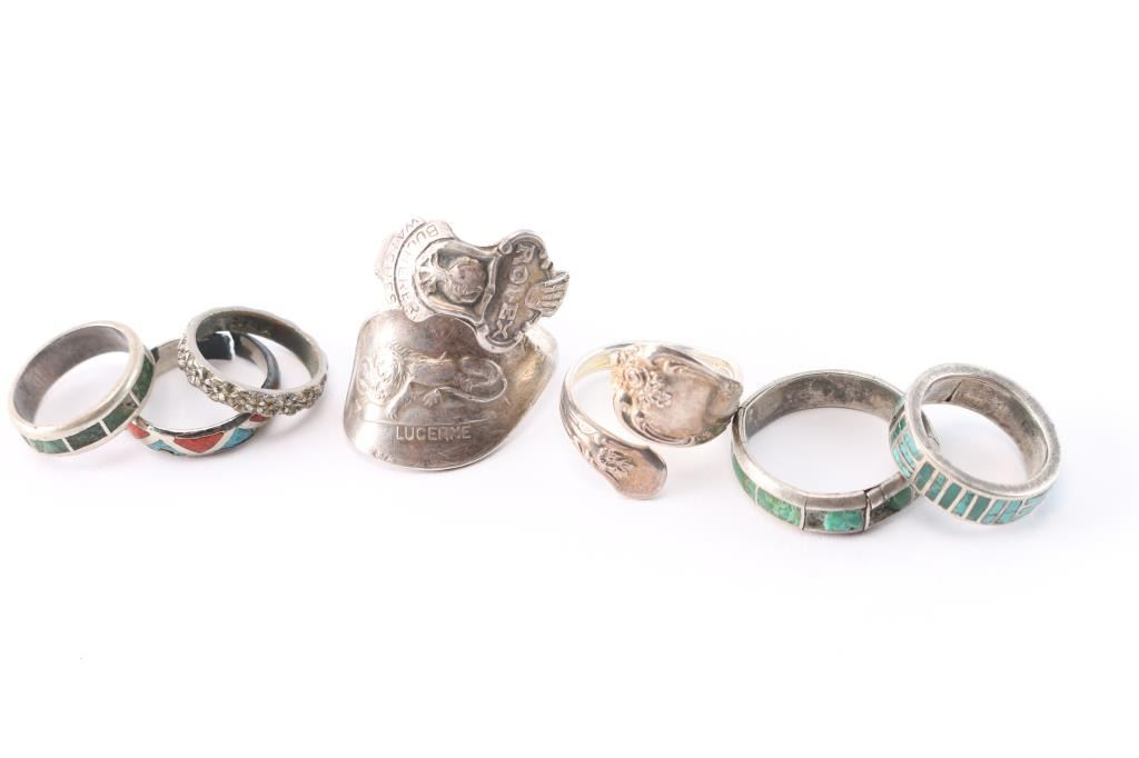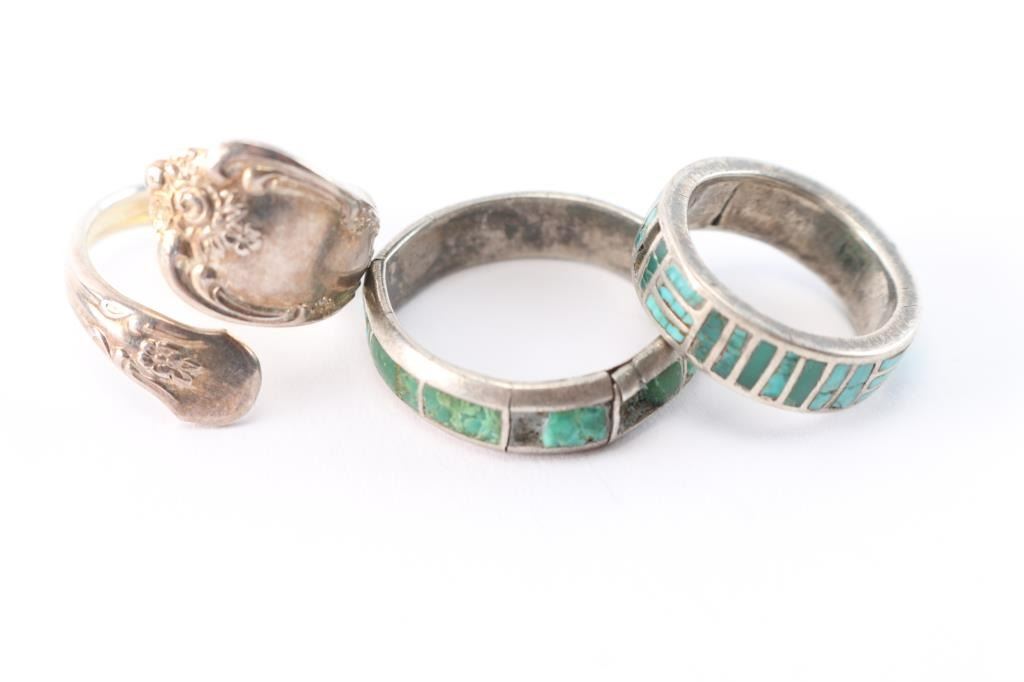 Most are sterling silver, three have green turquoise inlay, sizes 11 1/2 (missing stones), 6 1/4 (perfect condition), 6 1/4 (missing one stone). The rest are sizes 6, 7 1/2, 9, and 10.
