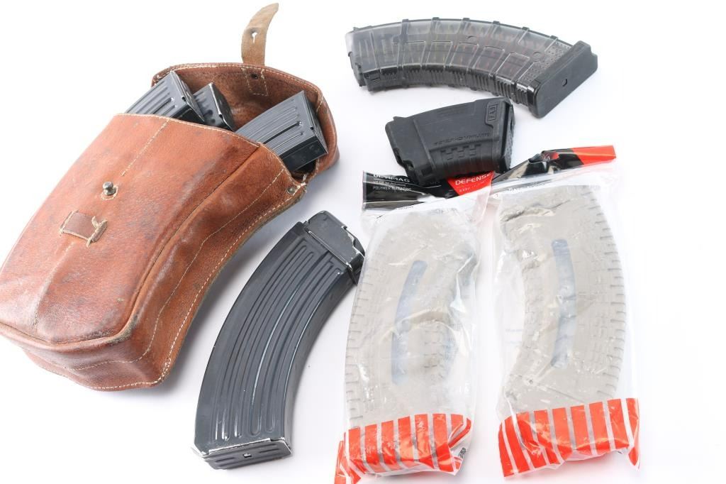 Original Czech VZ58 30 Round Magazines, Set of Four in Czech military brown leather four- magazine Pouch, 7.62x39, for use in the Czech vz 58 'AK-47 style assault rifle. Magazines and pouch show wear but very good condition. Two FAB Defense tan polymer 30-rd magazines, one Czech Small Arms clear 30-rd magazine and one FAB black polymer 10-rd magazine. 8 magazines total.