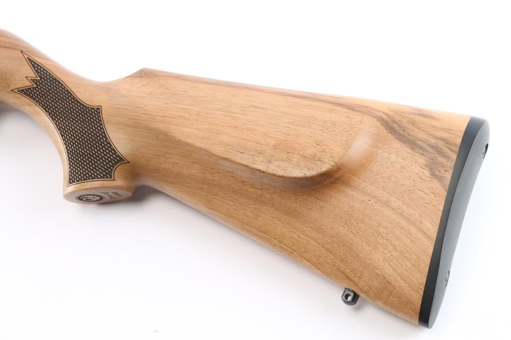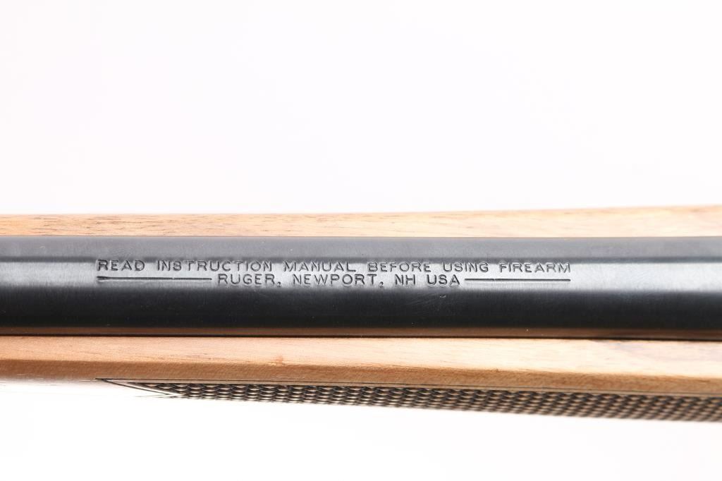 Number one of 1000.TALO Distributor Exclusive. Limited Availability. 18.5" blue barrel, brass bead front, white diamond u-notch adjustable rear sights, black alloy receiver with installed scope rail, French walnut one piece stock with schnabel fore end, checkered panels at wrist and forearm, sling studs. Bottom of grip marked "One of 1000" with Ruger logo. 10-rd rotary magazine. Bore is pristine, rifle is in new condition. Comes in factory box with matching label, cable lock and manual.