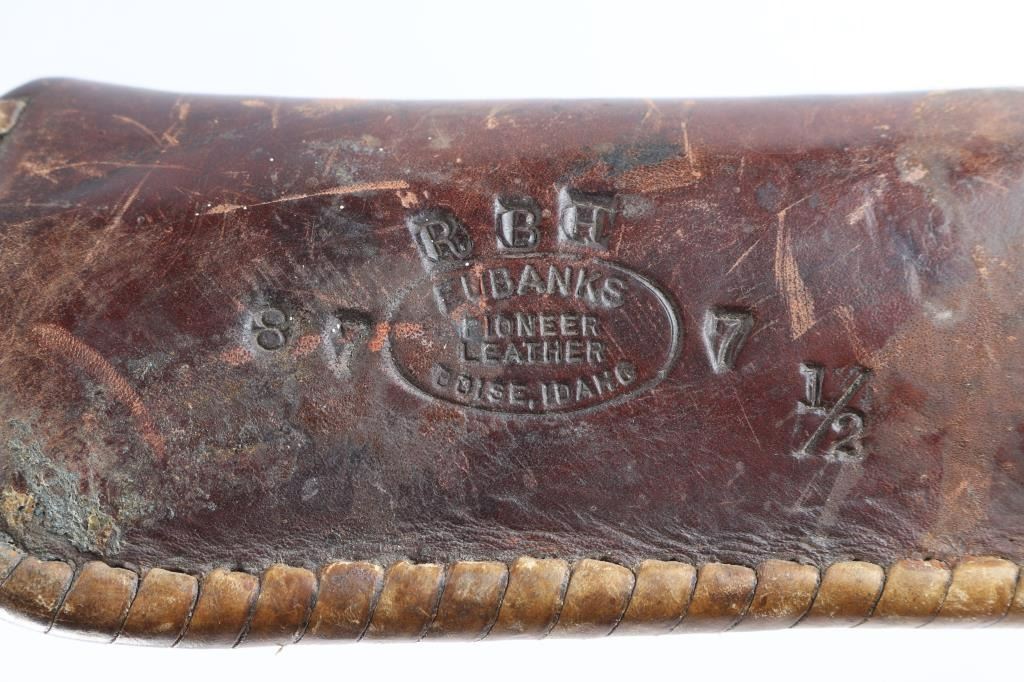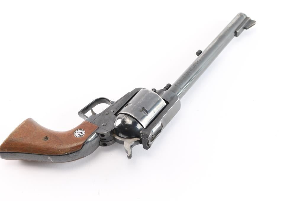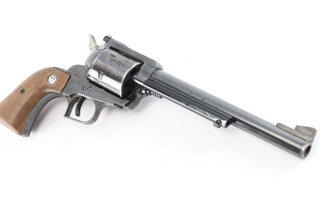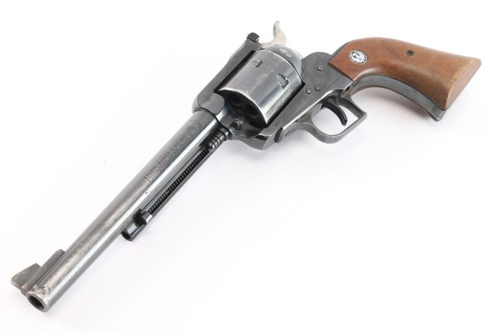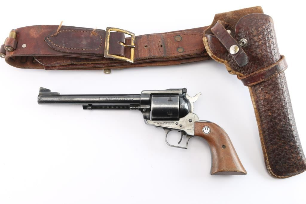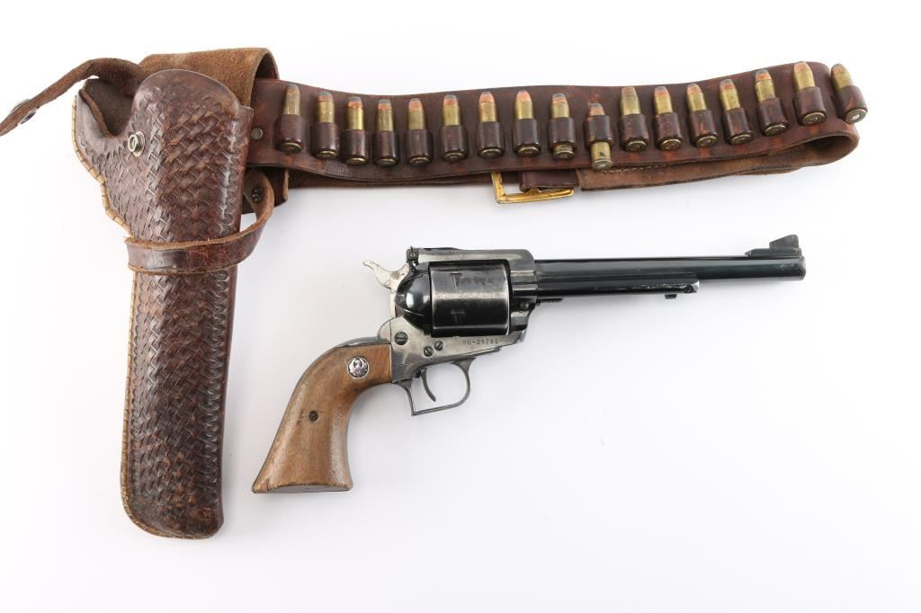 Single-action revolver manufactured circa 1971. Features blued finish, 7 1/2" barrel, serrated ramp front sight, pinned and adjustable square notch rear sight, non-fluted 6 shot cylinder, serrated hammer spur and serrated wide trigger. Bore is bright with strong rifling. Two piece wood grips with Ruger medallions have handling loss to the finish, some minor chips at the bottom of the panels. Retains approx. 75% finish with scratches, finish loss from holster/handling wear. Action is smooth. Come with a vintage Eubanks, Boise, Idaho basket weave snap holster and 19 loop brown leather cartridge belt