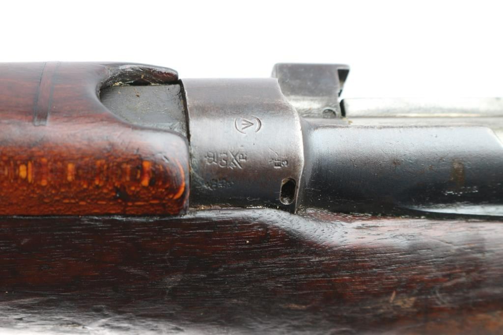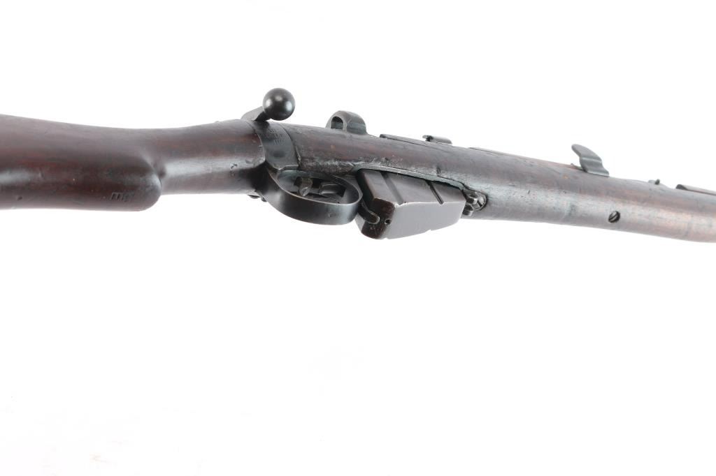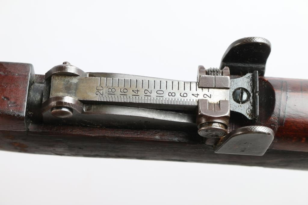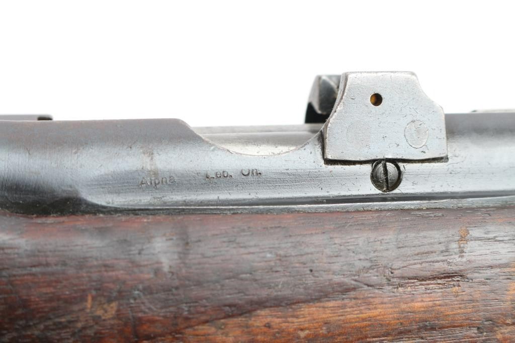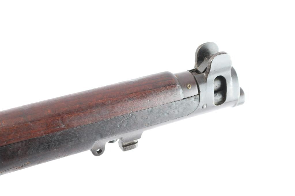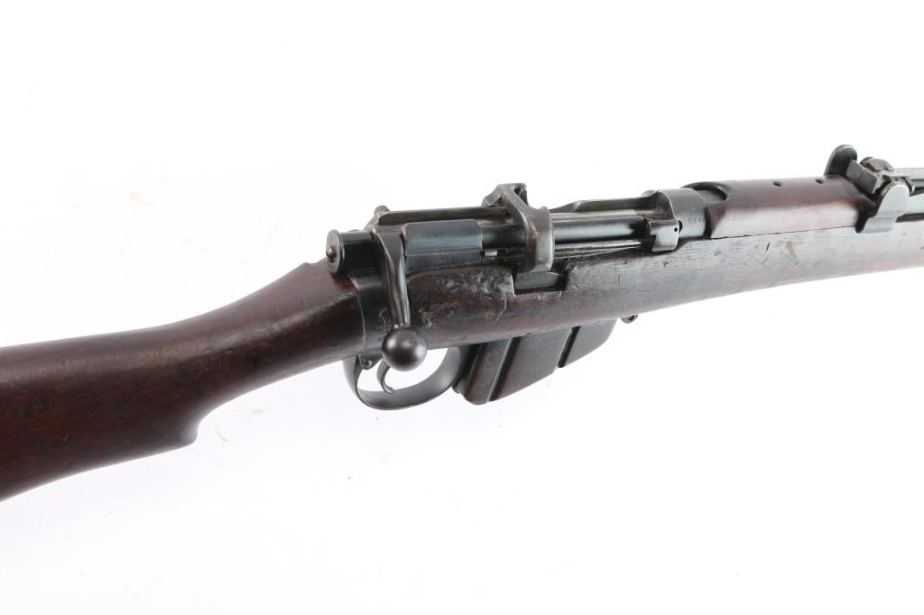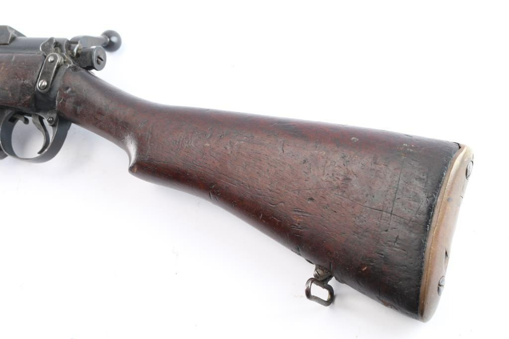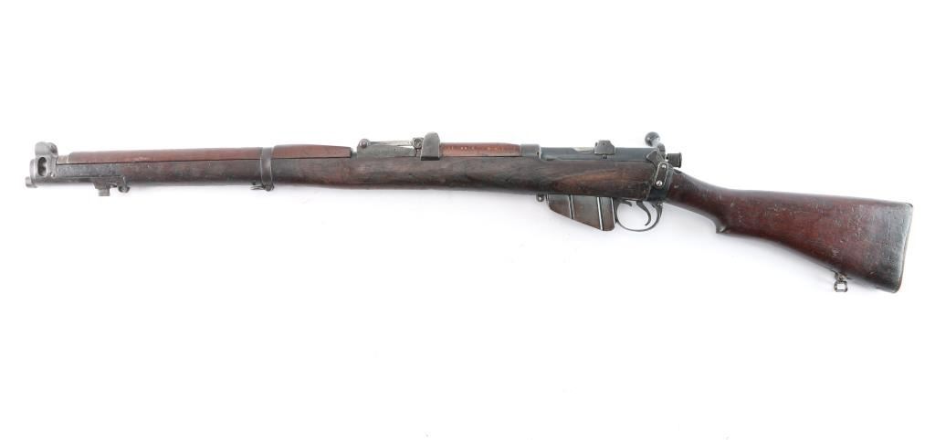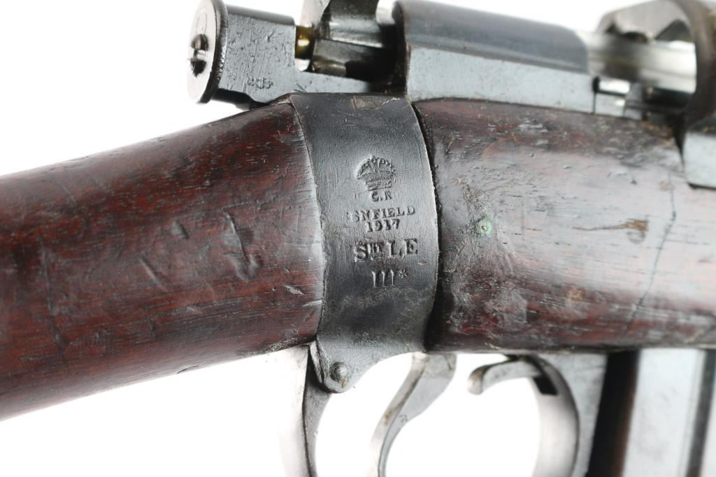 British manufactured military issue bolt action "Lee Enfield" ShtLE short rifle, manufactured circa 1917. Imported by Alpha Imports, Inc., Lebanon, OH, marked on left receiver rail. Featuring a 25.2" barrel with tangent rear sight graduated to 2000 meters and adjustable for windage, fixed blade front sight with curved protectors, curved grooved trigger, and bayonet lug. Fed from detachable 10-rd box magazine and does not have a magazine cutoff slot on the receiver. Four piece hardwood stock with brass trapdoor buttplate. The metal is blued with 95% remaining but taking on a brown patina. Bore is bright, and rifling seems good. Action is smooth/tight. Wood is serviceable with normal handling wear, a repair on the last inch of buttstock, a small crack under the action on the right side, hand guards missing/modified around rear sight, and a repair where a stock disc may have been. The metal is good with minor handling/edge wear. Serial numbers match on receiver, bolt. Receiver is marked with a crown and "Enfield 1917" stamped on the buttsocket. Includes (1) Magazine.
