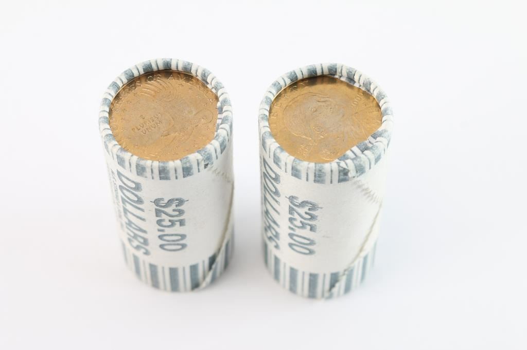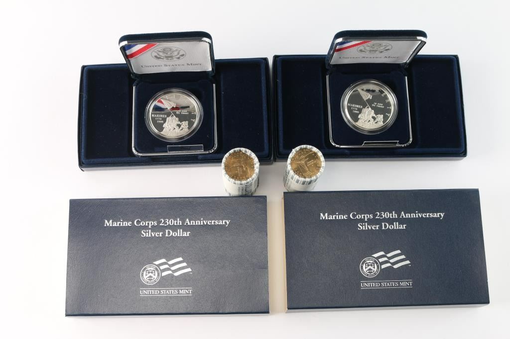 Includes: 2 each Marine 230th anniversary silver $1; 2 mint rolls 2000P Sacagawea dollars (50 per roll).