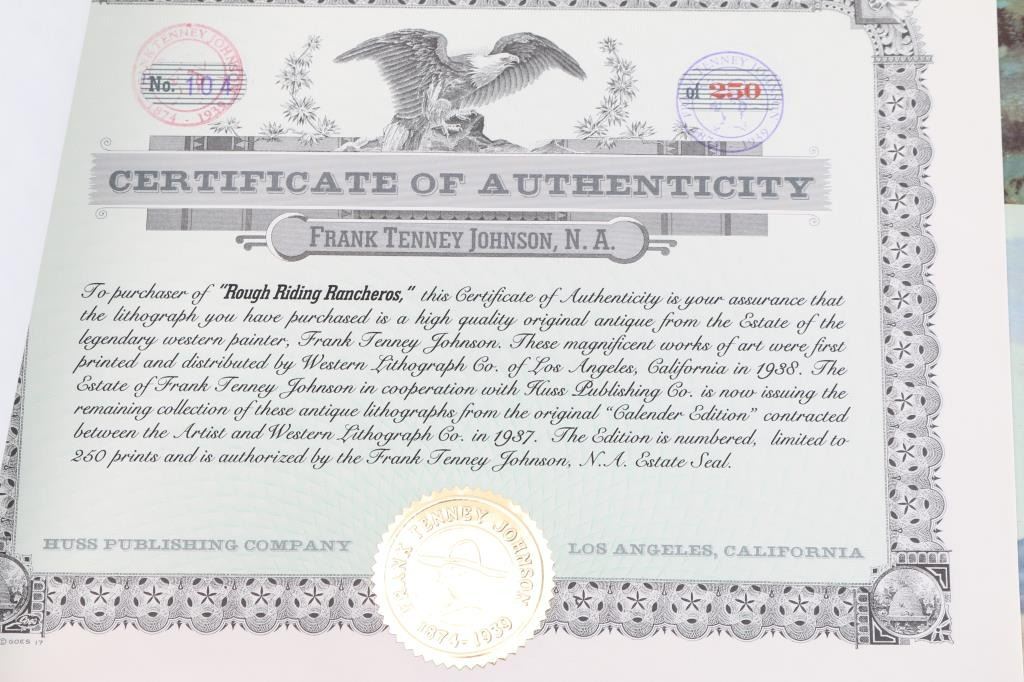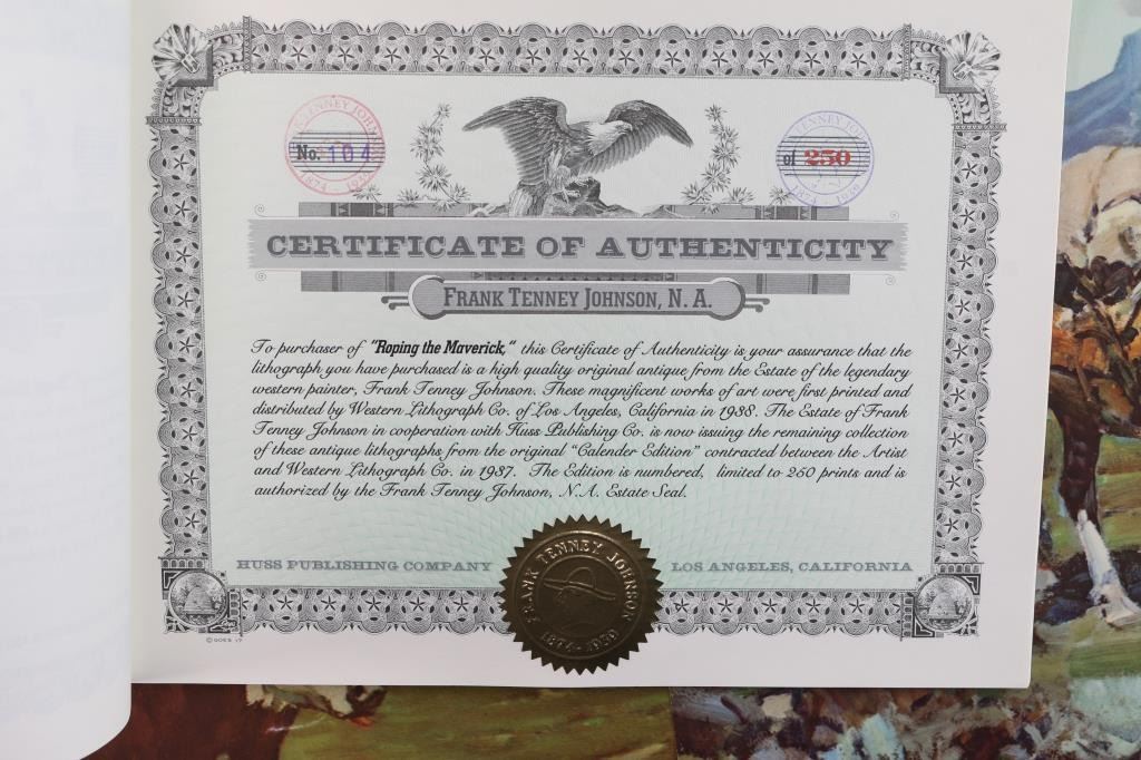 Includes: 13 prints all numbered 104 of 250. Comes with book with the certificate of authenticity of each print. Titles include: "The Guardian Of The Herd", "Rough Riding Rancheros", "Roping The Maverick", "Lengthening Shadows", "Somewhere On The Range", "Contemplation", "Shoshone Pinnacles", "A Fight In A Frontier Town", "When Day Is Done", " A Running Fight", "A Party Of Immigrants", "A Fresh Mount On The Pony Express", and "Life On The Trail".