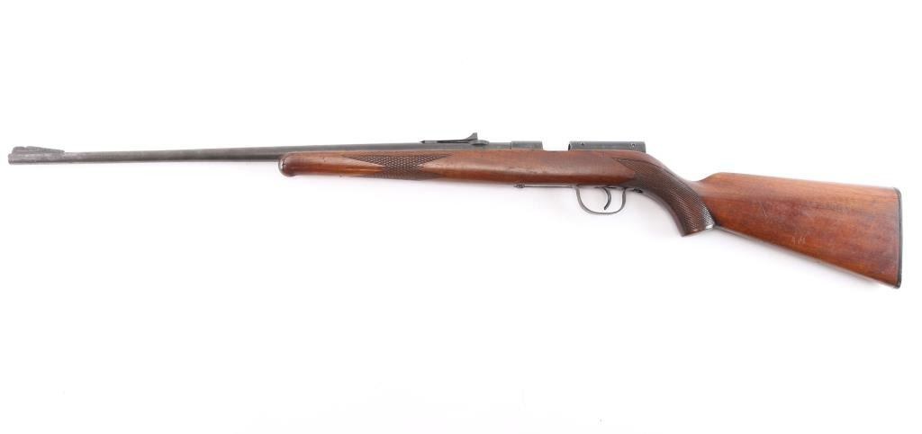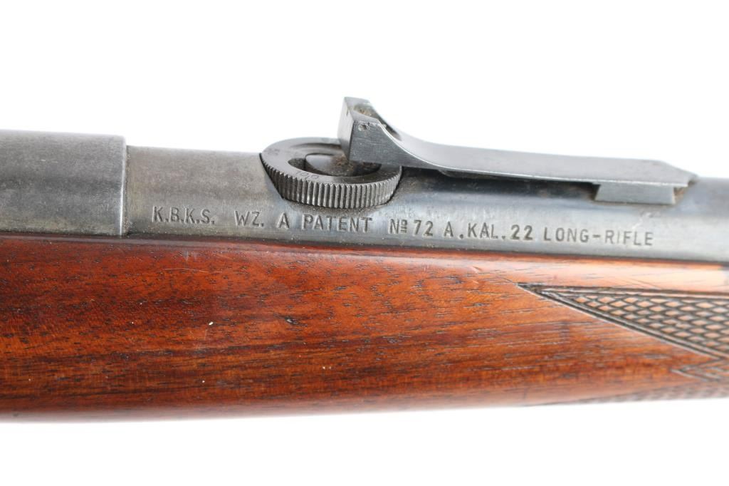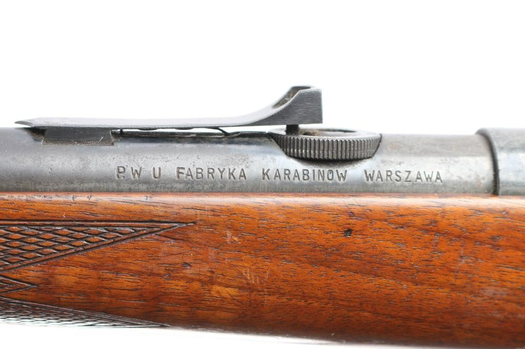 SN: 3360. NOTE*-Parts/Repair gun, missing bolt and front sight. Rare Polish Fabryka Karabinow Sporting Rifle. Left side barrel stamped P.W.U. Fabryka Karabinow, Warszawa , right side K.B.K.S. Wz. A Patent No. 72A single shot rifle with 25 1/2” barrel, raised serrated front sight base, v-notch rear sight with adjustable disk marked 25, 50 &100. original blue barrel with handling wear, scattered patina, stock with checkered panels at wrist & forearm, schnabel fore tip, original factory buttplate. Manual thumb safety. Left receiver drilled/tapped for optics, no filler screws. Bore is very good/bright. Manufactured in the interwar period in Poland (1919–1939).