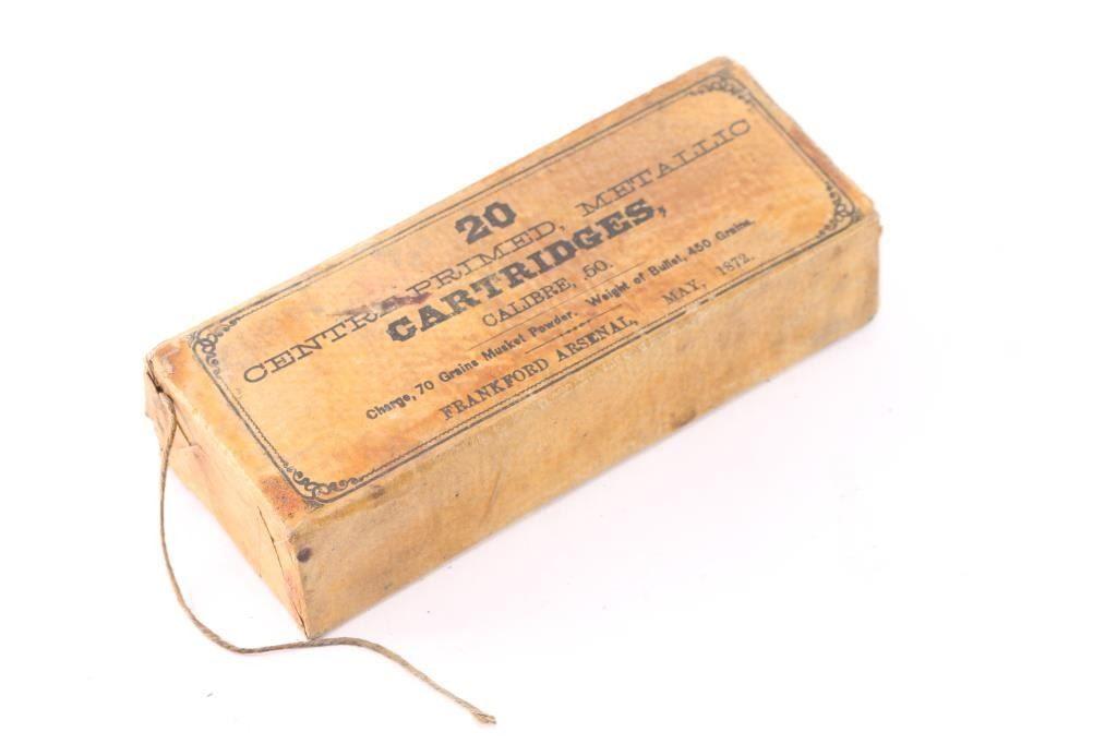 This original 20 Round “CENTRE PRIMED METALLIC CARTRIDGES CALIBRE .50” packet was produced at the Frankford Arsenal in May of 1872, and is complete with all twenty of the original internally primed copper cartridges.