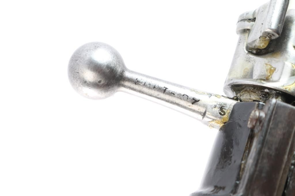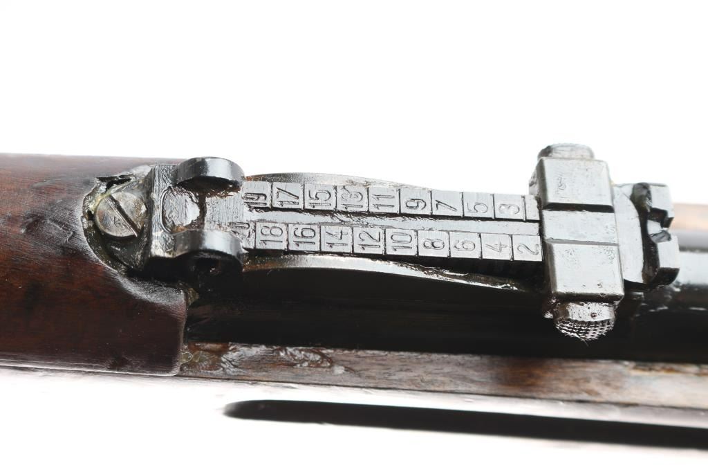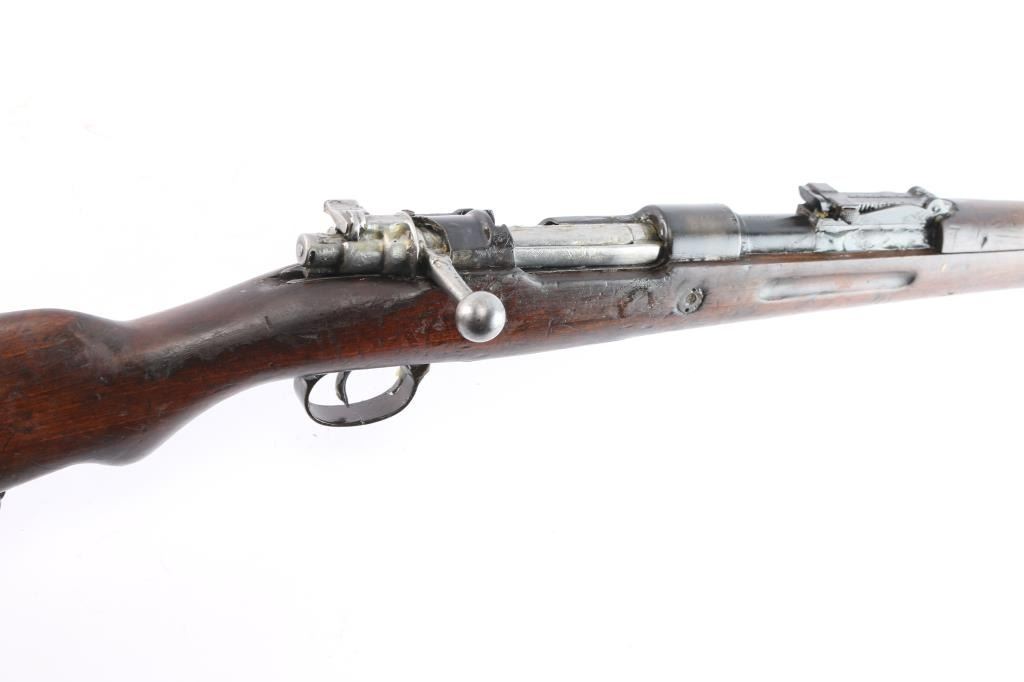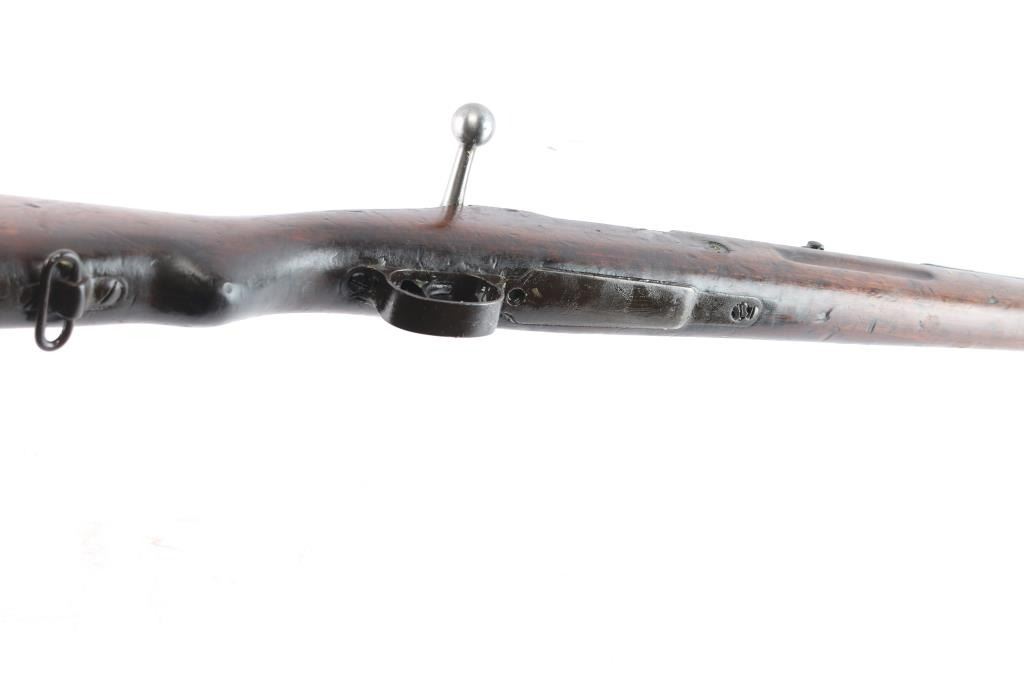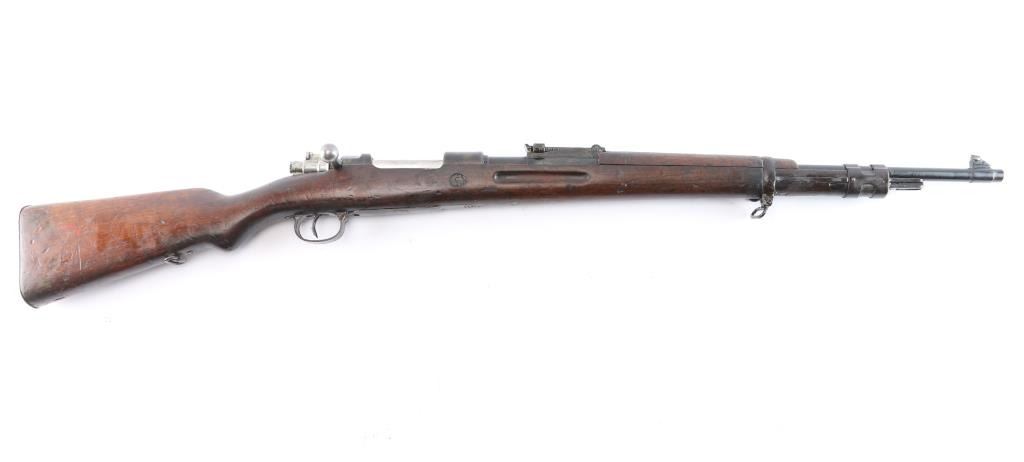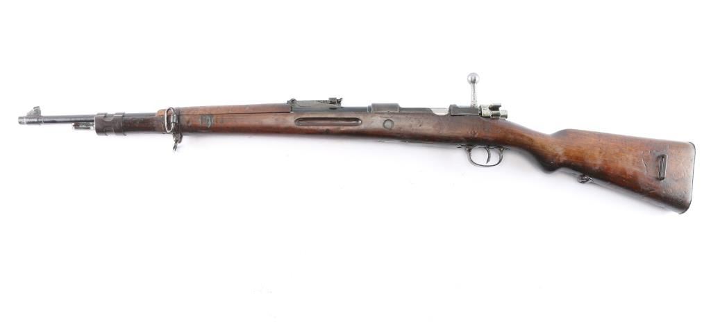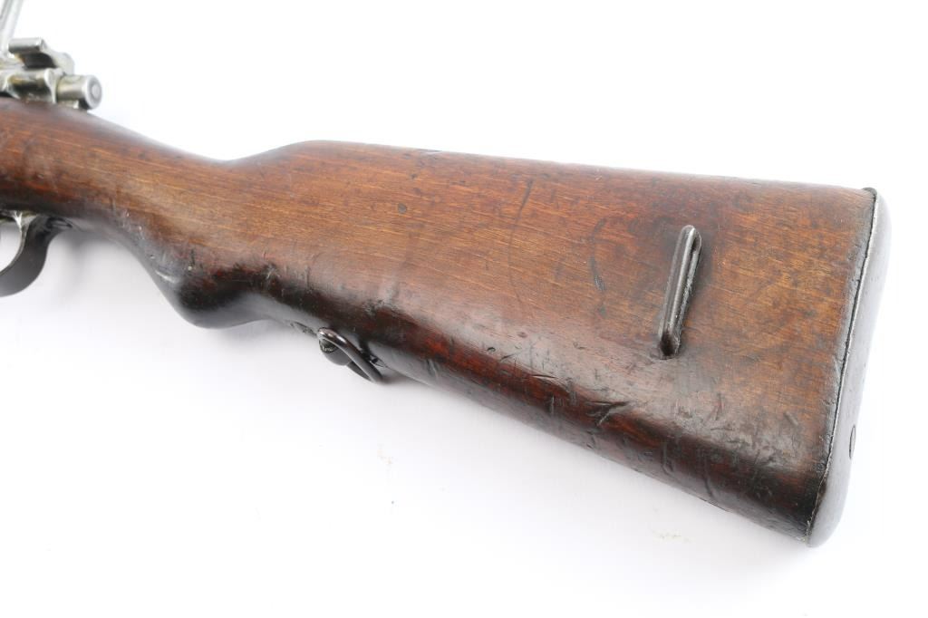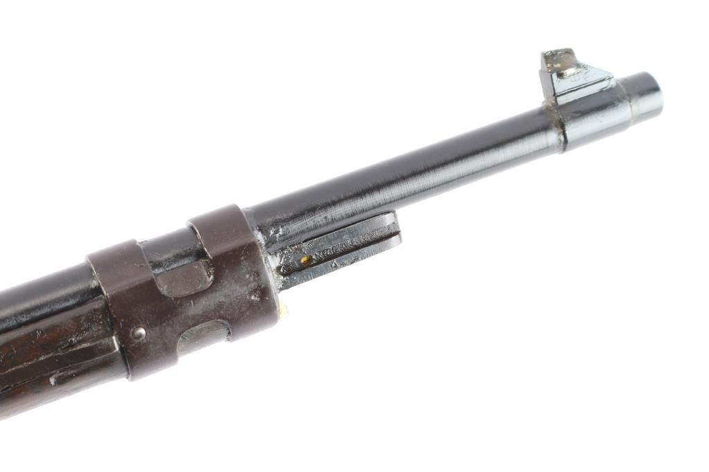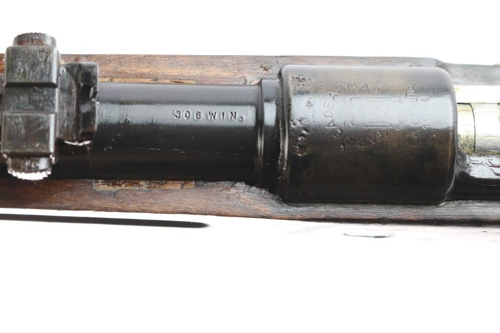 Spanish military M43 rifle, date not observed, shortened to carbine configuration with a 3/4-length semi-pistol grip stock, smooth curved trigger, smooth buttplate, smooth handguard, inverted "V" front sight, tangent rear sight graduated to 2000 meters, three sling swivels, and finger grooved forend. Chambered for the .308 win. cartridge as marked on the barrel (7.92 marked on receiver). Barrel length is approx. 23.6 inches. Bolt is in the white, and the barrel, and receiver are blued. The trigger, trigger guard, floor plate, buttplate have a brown look to their finish. The metal surfaces show minimal handling marks and thinning at edges. There is some pitting on the receiver, and the bore is dark and dirty, rifling cannot be determined. Stock is overall fair condition with heavy scratches and handling marks. Numbers may match on receiver, and bolt "1493," but is worn on the handle. No cleaning rod, and no import marks found.