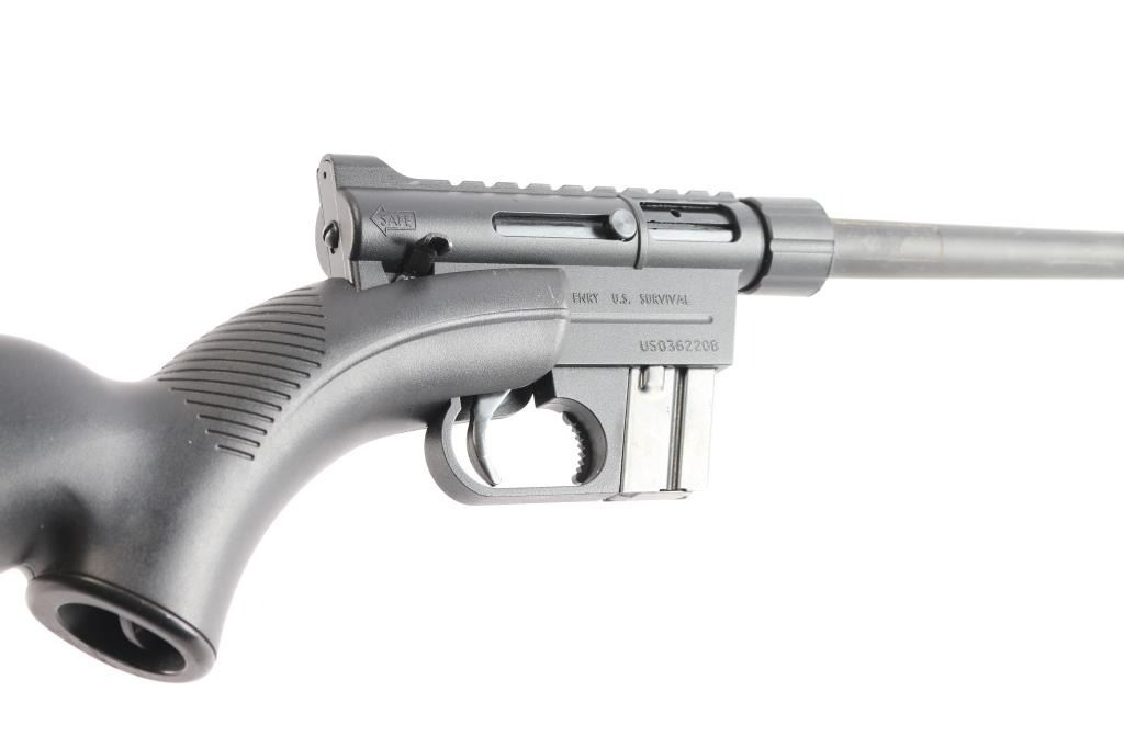 #US036220B. Semiautomatic rimfire rifle chambered for 22LR. Rifle is a close copy of the AR-7 survival rifle designed by Eugene Stoner, and disassembles into smaller components that can be stored inside the hollow floating buttstock. Features 16" barrel with plastic orange front sight, rear peep sight, integral scope rail, manual thumb safety, detachable 10-rd magazine, black plastic butt. Overall condition is like new. Bore is excellent/bright