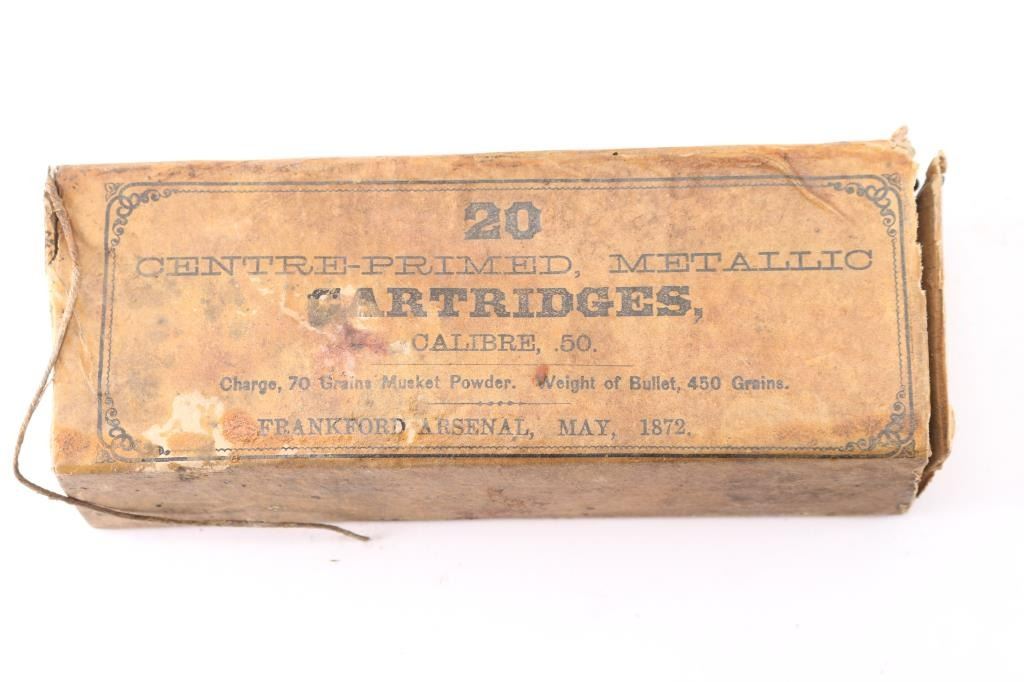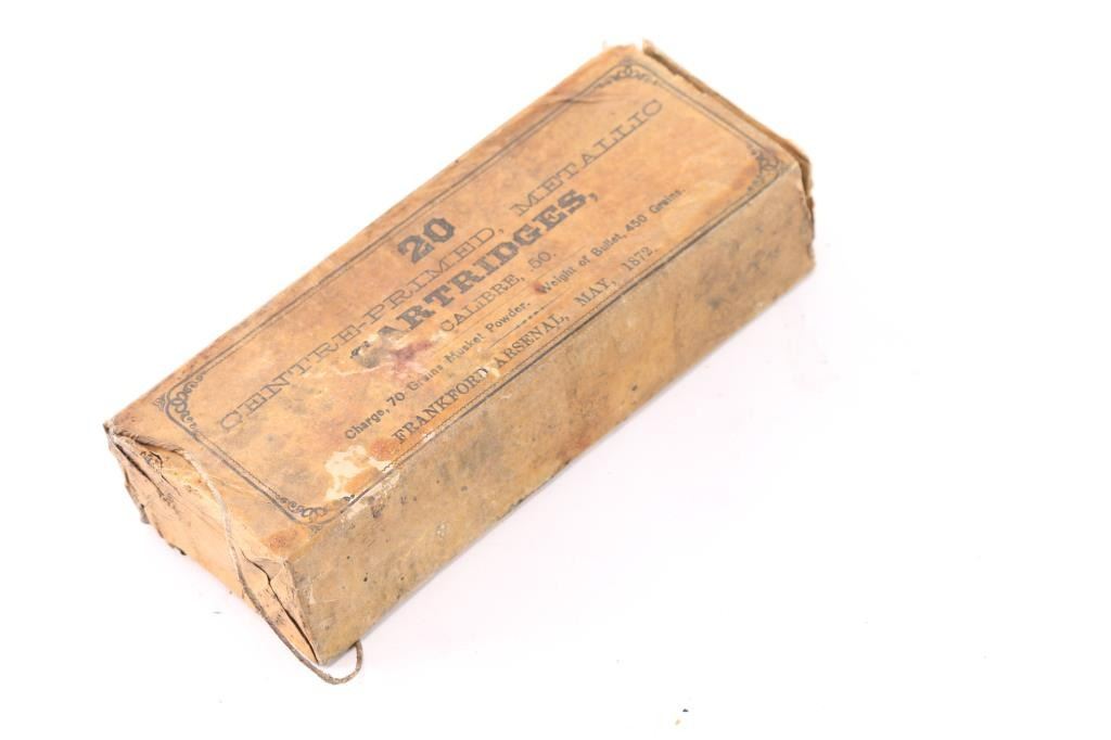This original 20 Round “CENTRE PRIMED METALLIC CARTRIDGES CALIBRE .50” packet was produced at the Frankford Arsenal in May of 1872, and is complete with all twenty of the original internally primed copper cartridges.