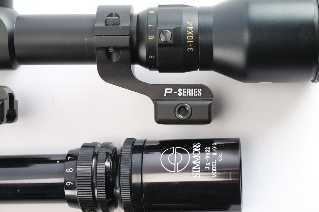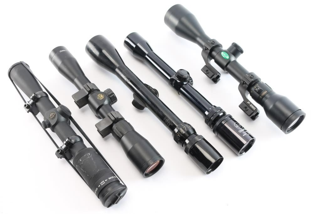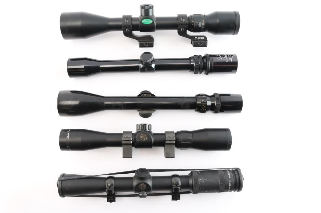 (1) Burris 1.75x-5x-32mm, duplex, with rings (1) Mueller 3-10x44mm, mil-dot, with rings, (1) Cabela's Pine Ridge 2-7x32mm, duplex, with rings. (1) Simmons 3x-9x32mm, model #1010, duplex, (1) Bushnell 3x-9x40mm Banner, duplex.