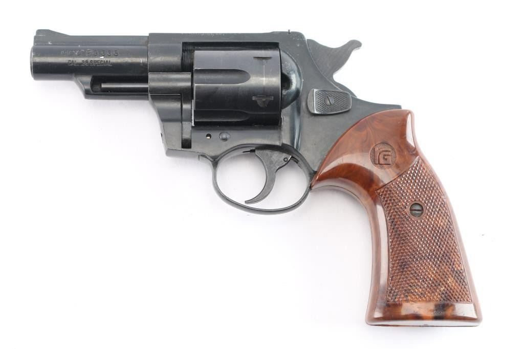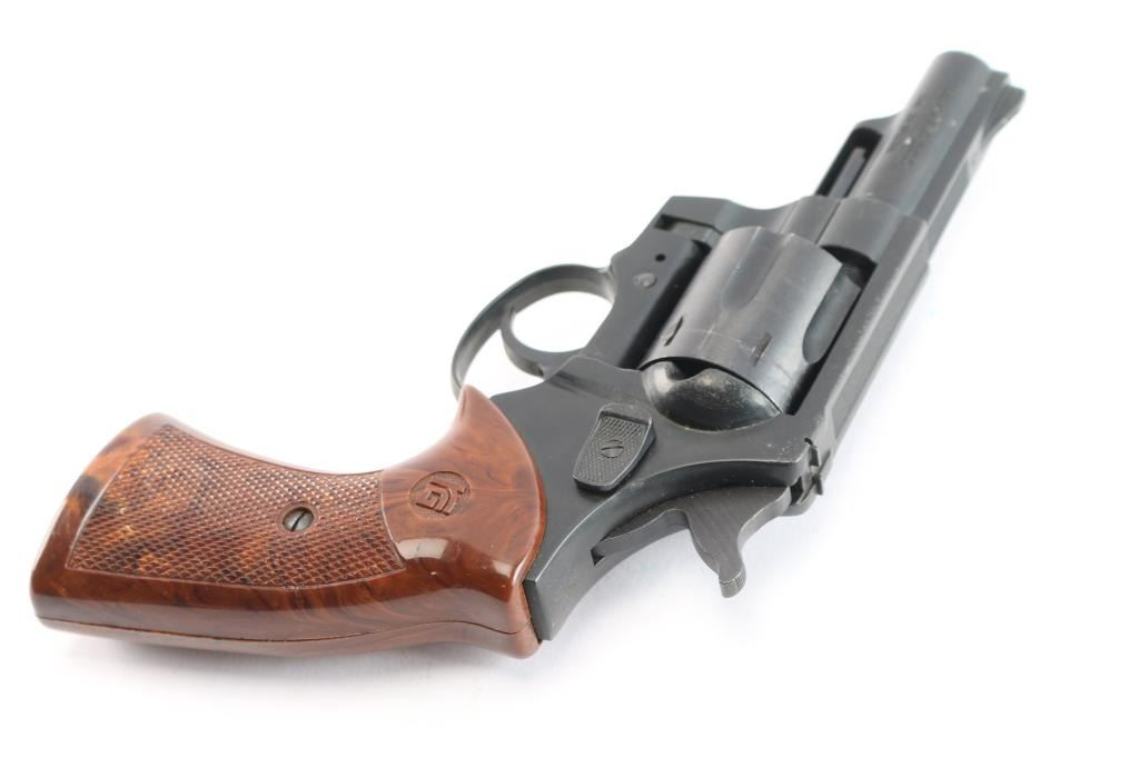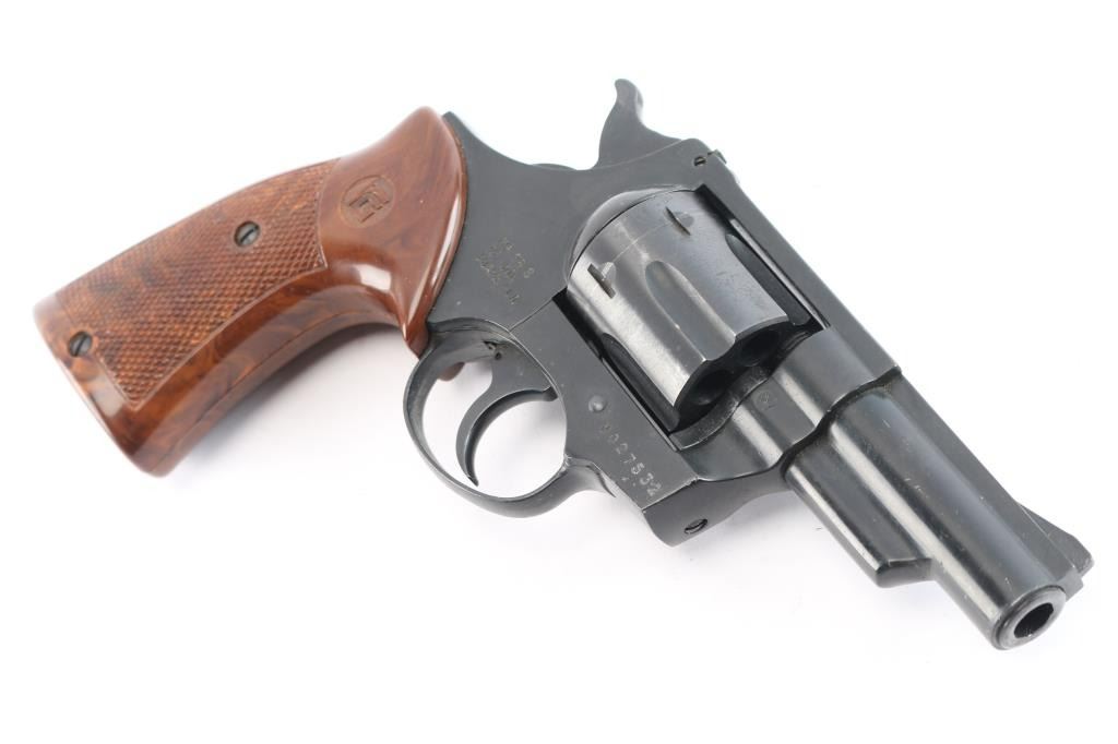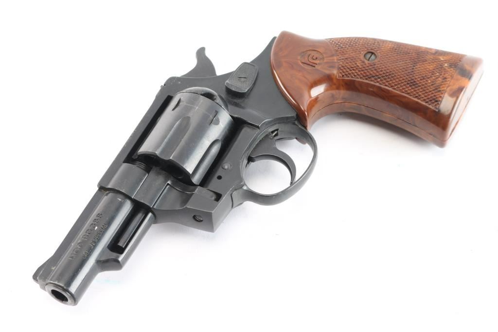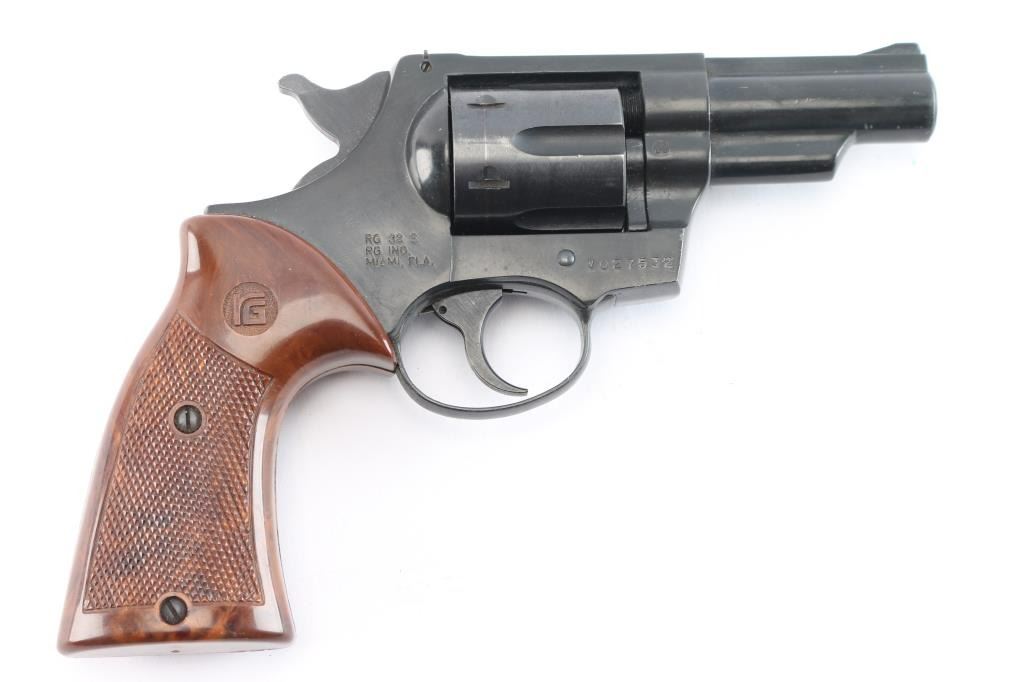 Röhm Gesellschaft German made D.A. revolver. Blued/black finish, 3" ribbed barrel, ramp front sight, rear window sight, fluted six-shot cylinder, smooth trigger, alloy frame and two-piece checkered faux wood grips w/ RG monograms. Revolver exhibits light edge wear and moderate handling wear. Action is smooth with tight lock-up, bore is excellent and plastic grips are very good. NRA Condition-Very Good. Modern Firearm.