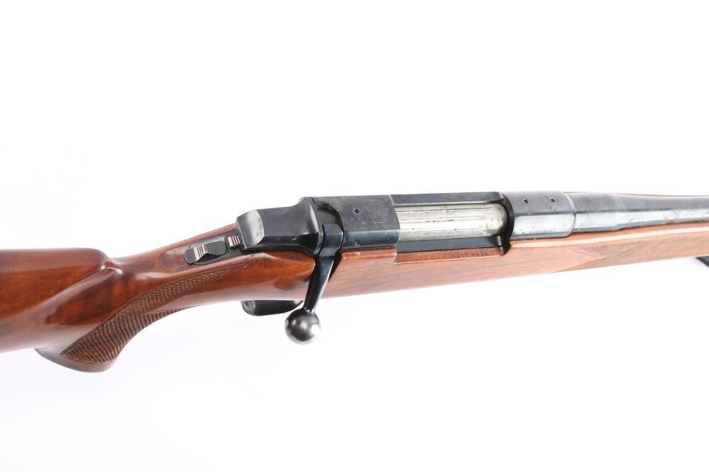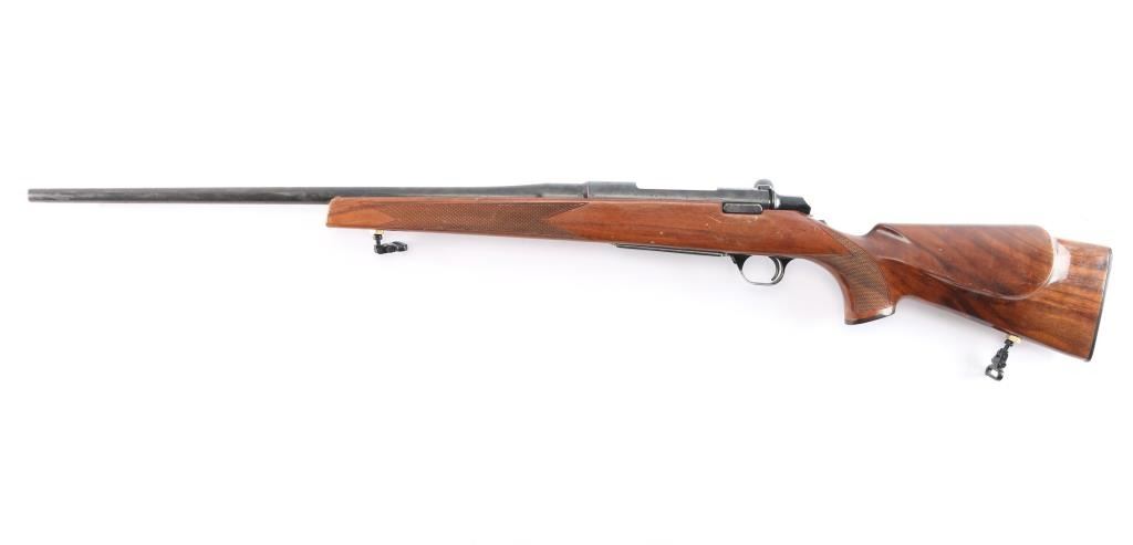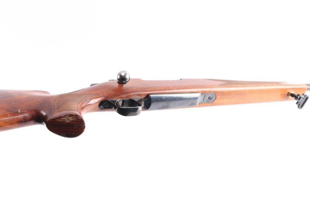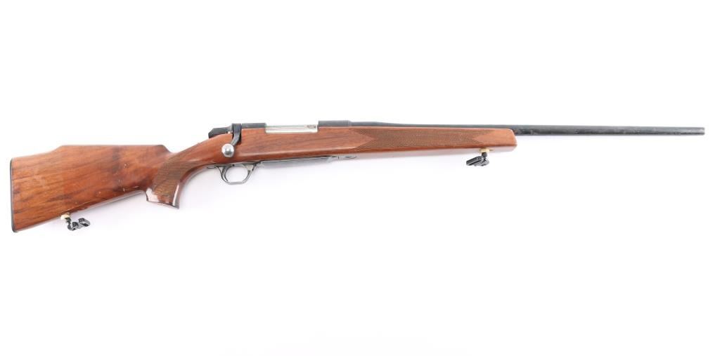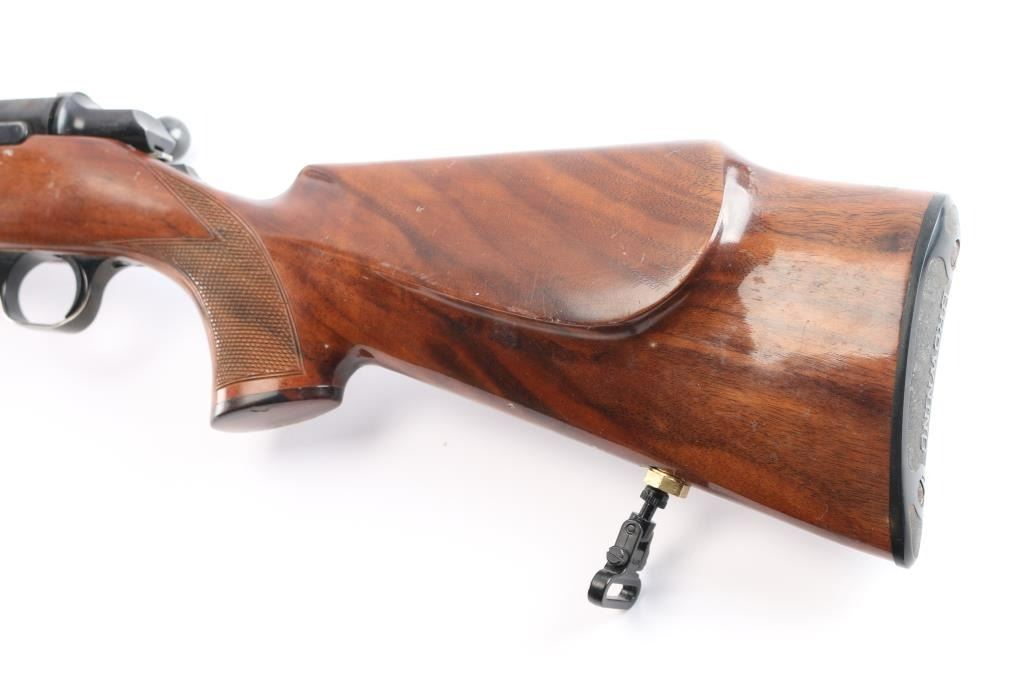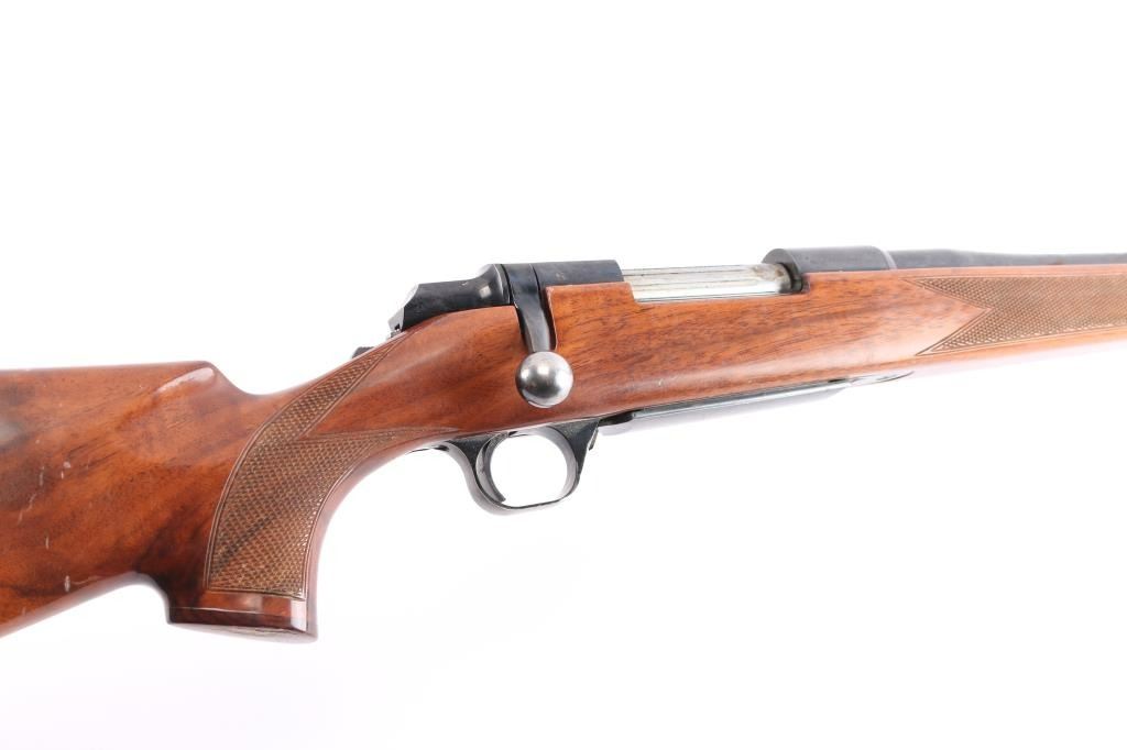 BBR-Bolt-Action Box Magazine Rifle. Manufactured by Miroku (Japan) in 1979. 24" barrel with no provisions for sights, wide serrated trigger, cocking indicator, tang safety, hinged floorplate, 3 lug bolt, blued finish, Monte-Carlo style stock with checkered panel at wrist, & forearm, sling swivel inserts, right-handed shadow-line cheek rest, contrasting grip cap, factory buttplate. Receiver drilled/tapped for optics. Blue is about 75% with scattered patches of light pitting and surface rust, handling wear on the bolt knob, action is smooth, the bore is very good/bright, wood is good/sound with some minor scratches/scuffs, the sling swivels are installed with brass hexagon nuts with some slight chips around them.