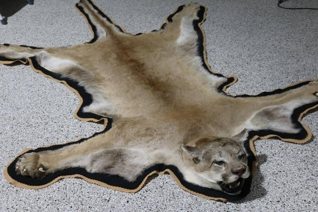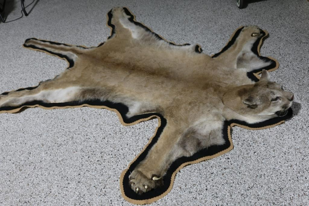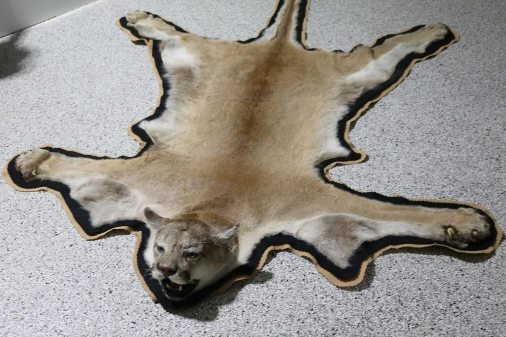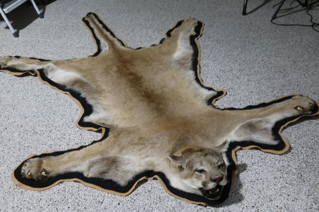 Measures: 92"L x 67"W. Full body mountain lion rug with white fabric backing and clips to hang. Additional mountain lion skull.