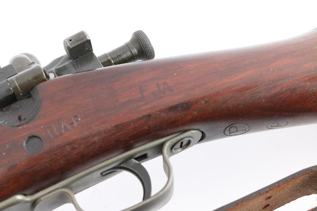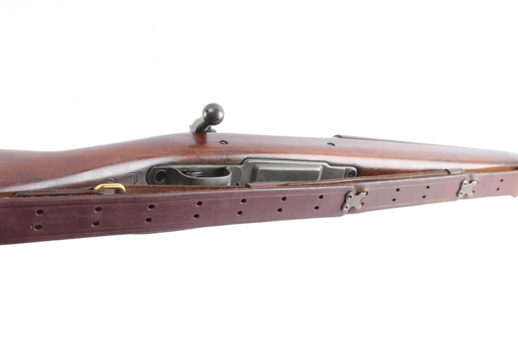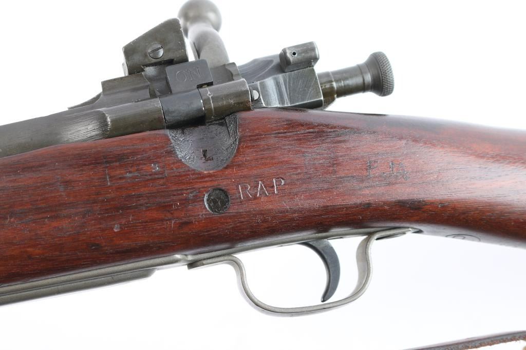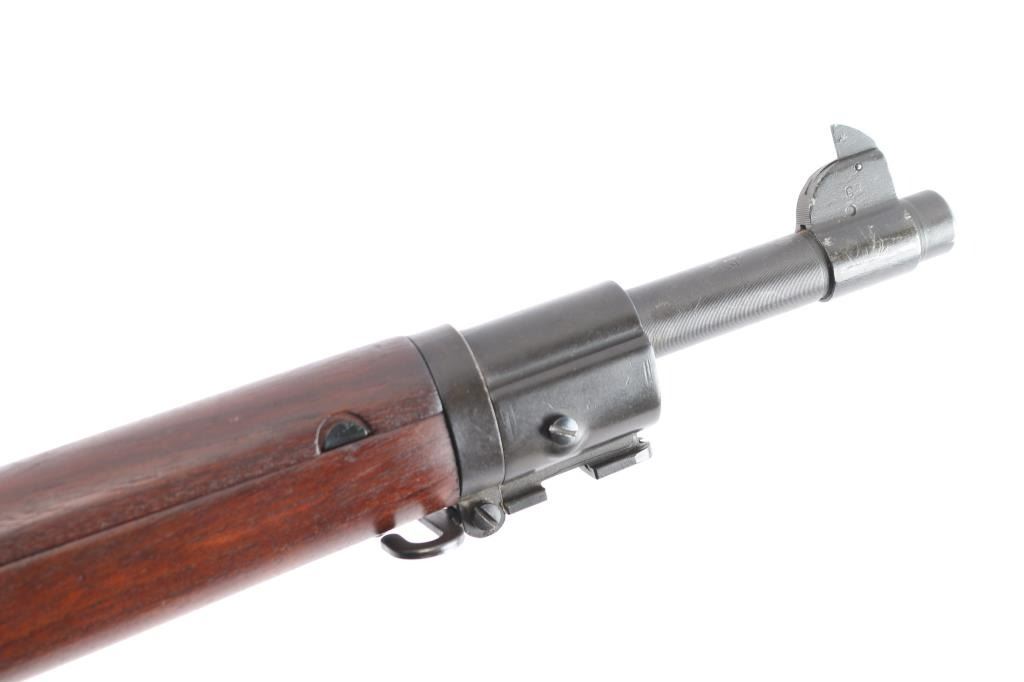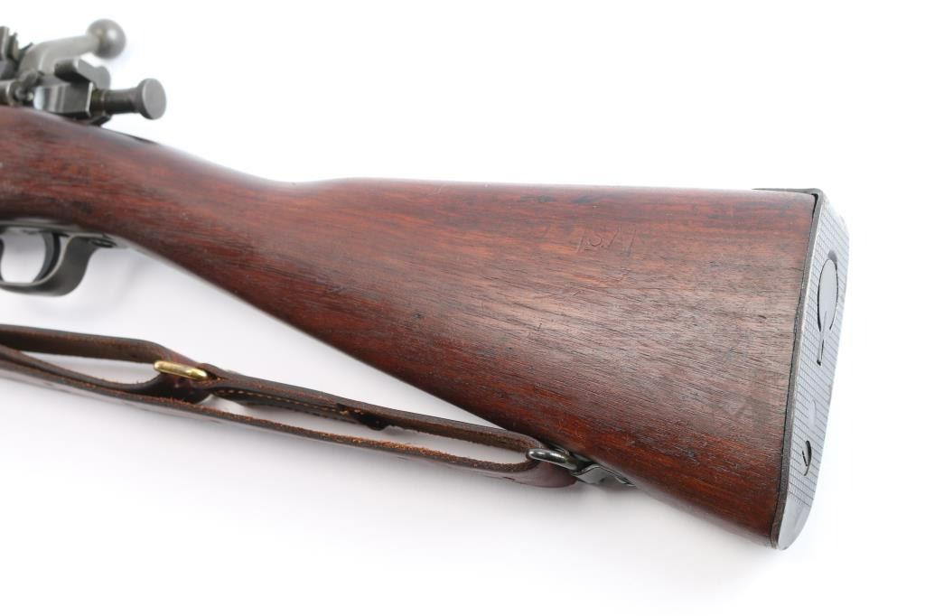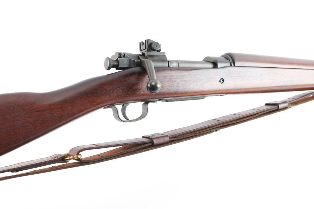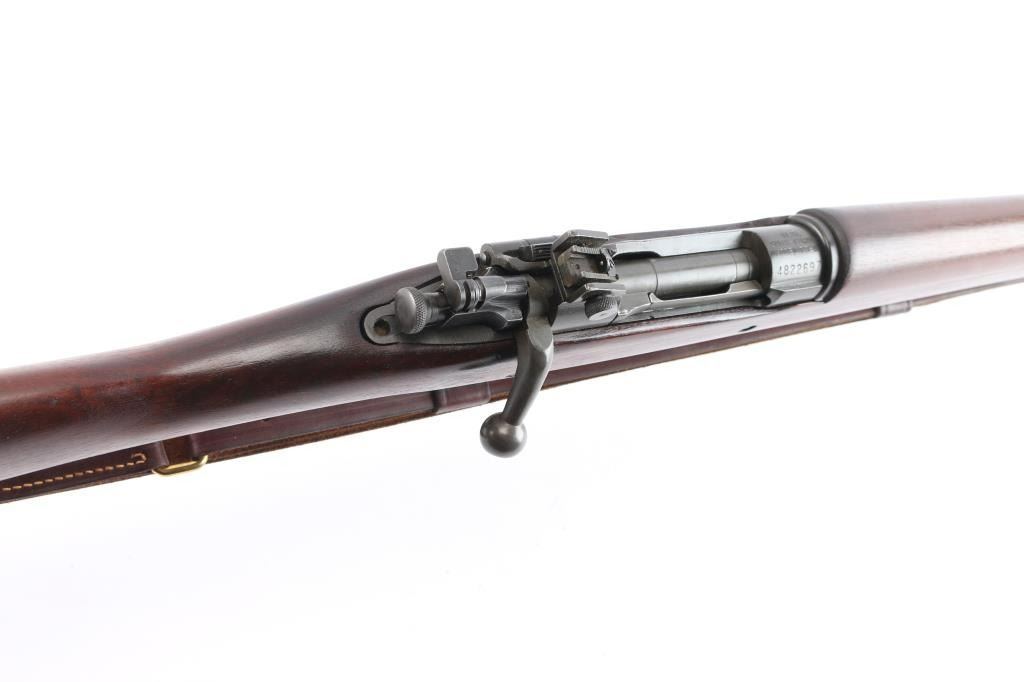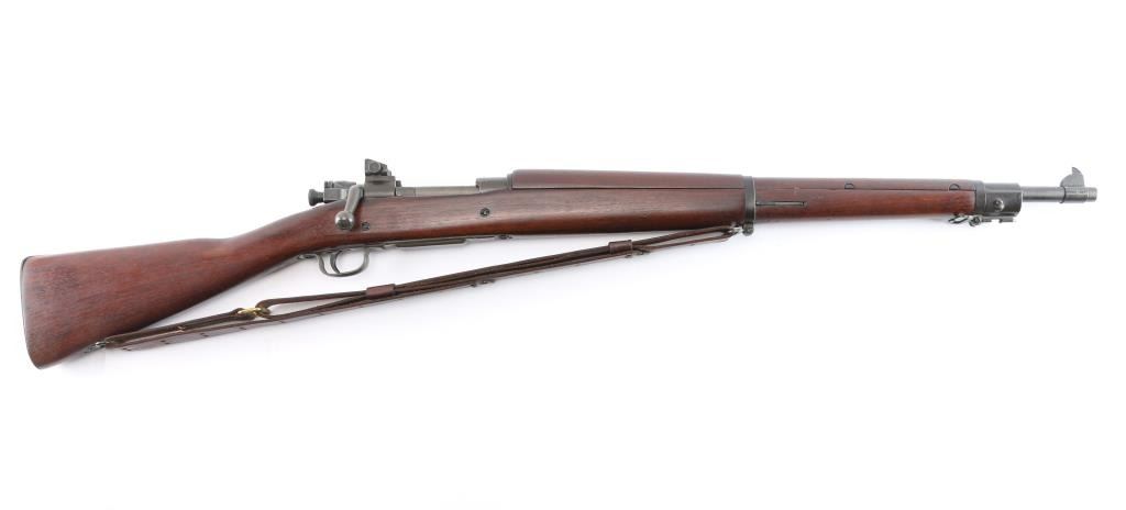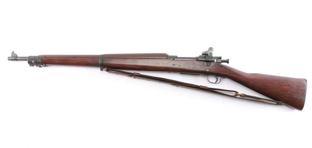 US Military WWII era bolt action rifle manufactured circa 1944. Features parkerized finish, wood handguard & straight grip stock, blade front sight, peep rear sight, bayonet lug, 24" barrel, three position safety, magazine cut-off, sling swivels, stacking swivel. Stamped trigger guard & bands. Bore is very good condition. Retains 95% of the parkerized finish with handling marks. Barrel marked "SC / (flaming bomb) / 7-43". Wood is very good condition, with small dents and other evidence of service use. Visible stock cartouches include: "RAP", "SA", "P" in circle. Includes leather two hook sling.