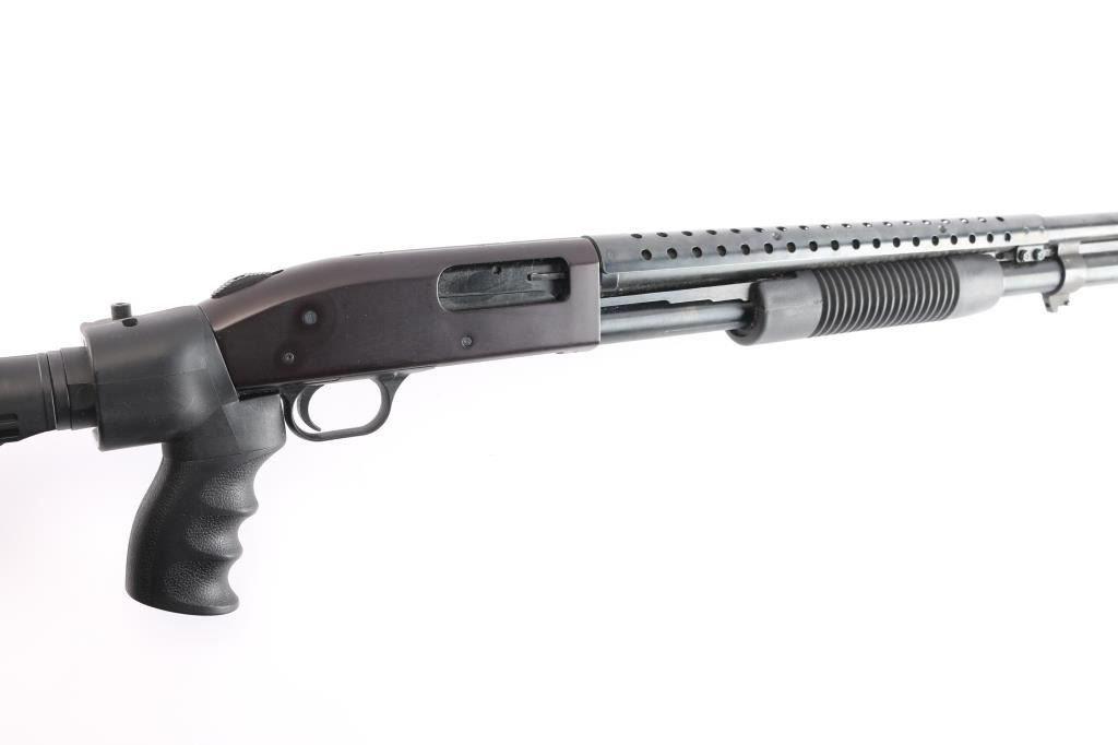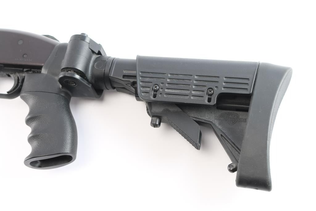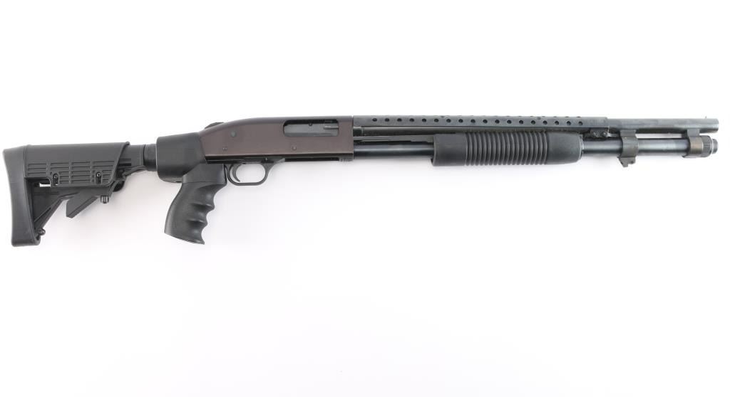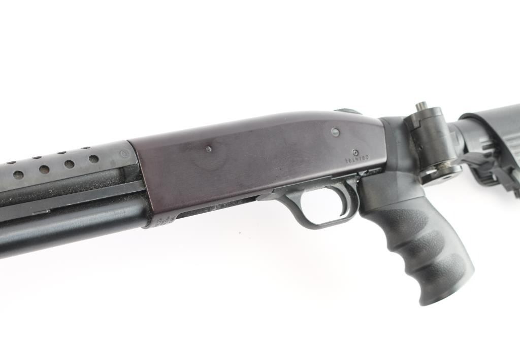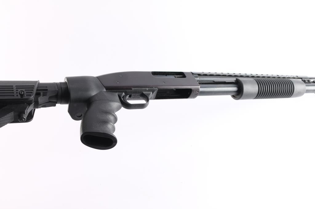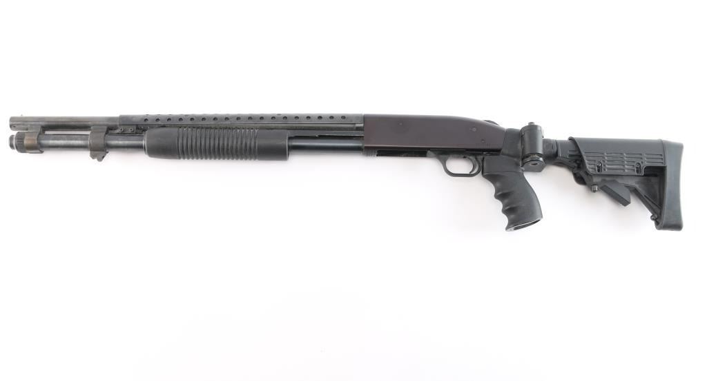 Slide-Action custom tactical shotgun. Mossberg Model 590 21" Cylinder bore round barrel with perforated steel heat shield, bayonet lug. Chambered for 2 3/4" and 3' in shells. Brass bead front sight. Full length tube magazine. Black textured polymer pistol grip. Grooved black polymer forearm. Tang safety. ATI black polymer folding adjustable shoulder stock. Receiver drilled/tapped for optics. Action is smooth/tight. Bore is very good/bright. Furniture is very good. Matte finish is very good with minor scratches. LOP is adjustable.