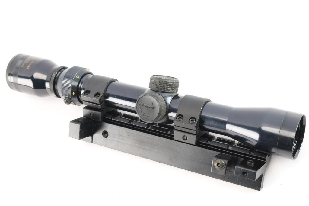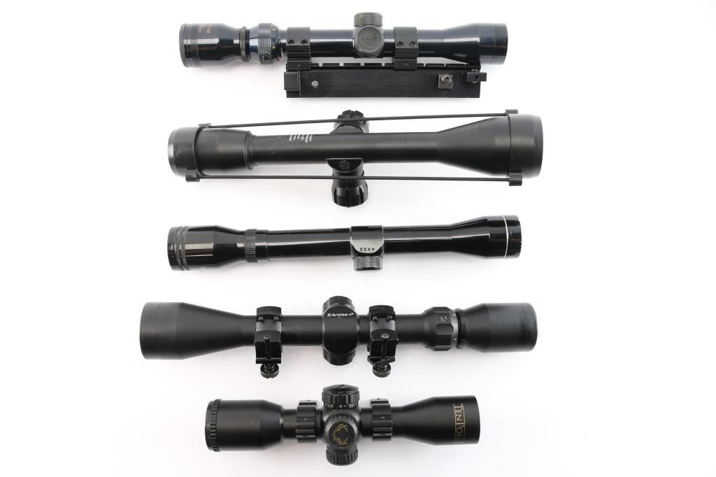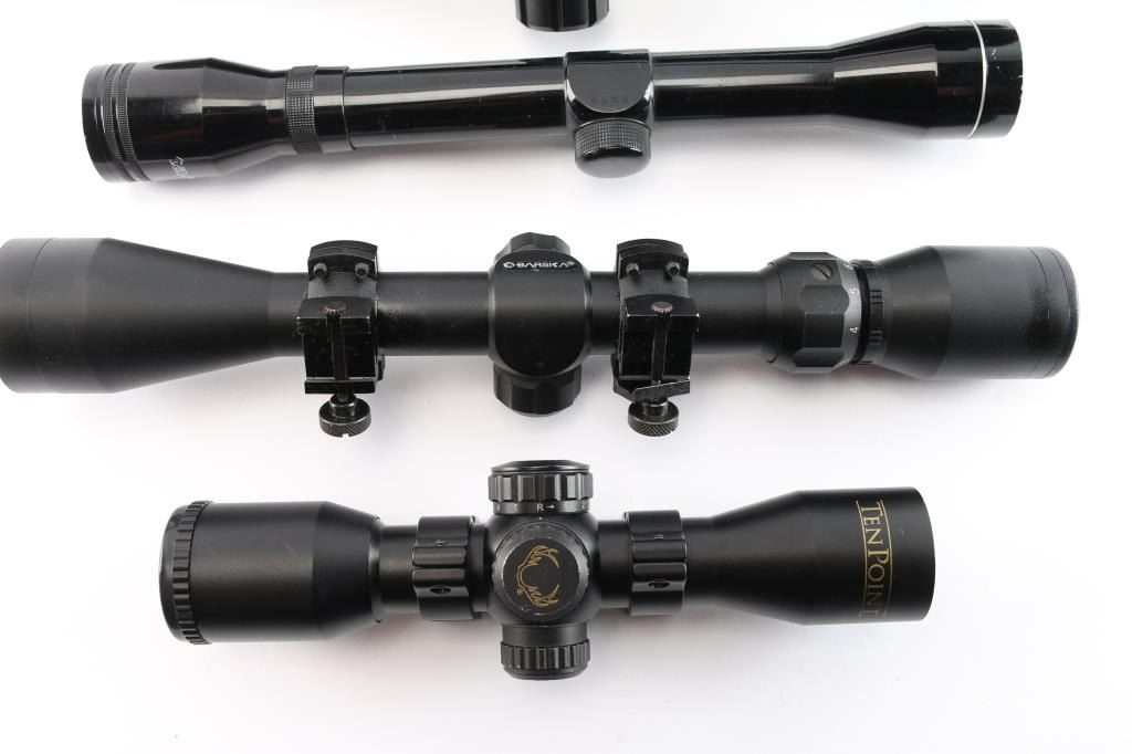 (1) Barska 3-9x40mm with rail mount, duplex, (1) 10x40mm scope, mil-dot, (1) Tasco 4x32mm, duplex, (1) Tasco 2-7x32mm, with rings and side-mount adapter, duplex, (1) TenPoint illuniated reticle, with rings