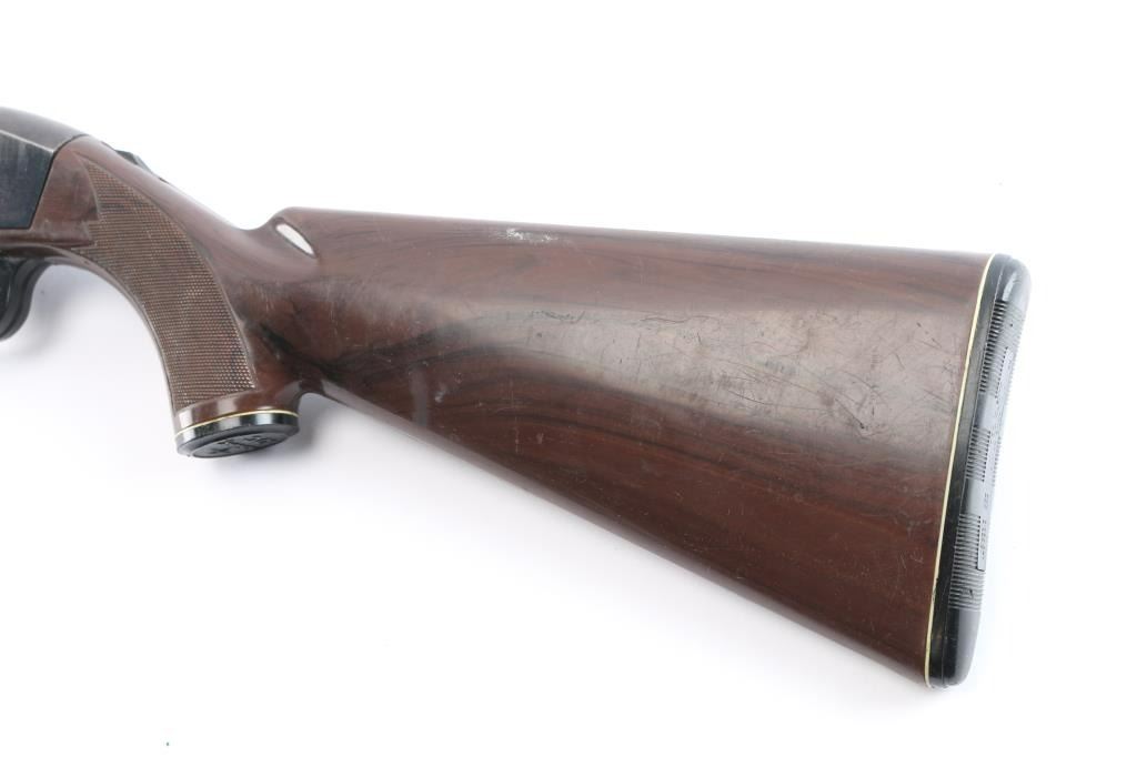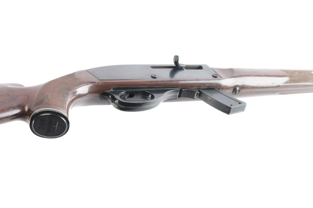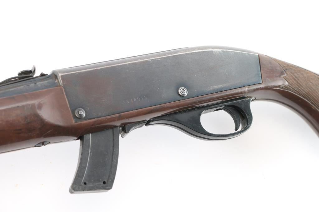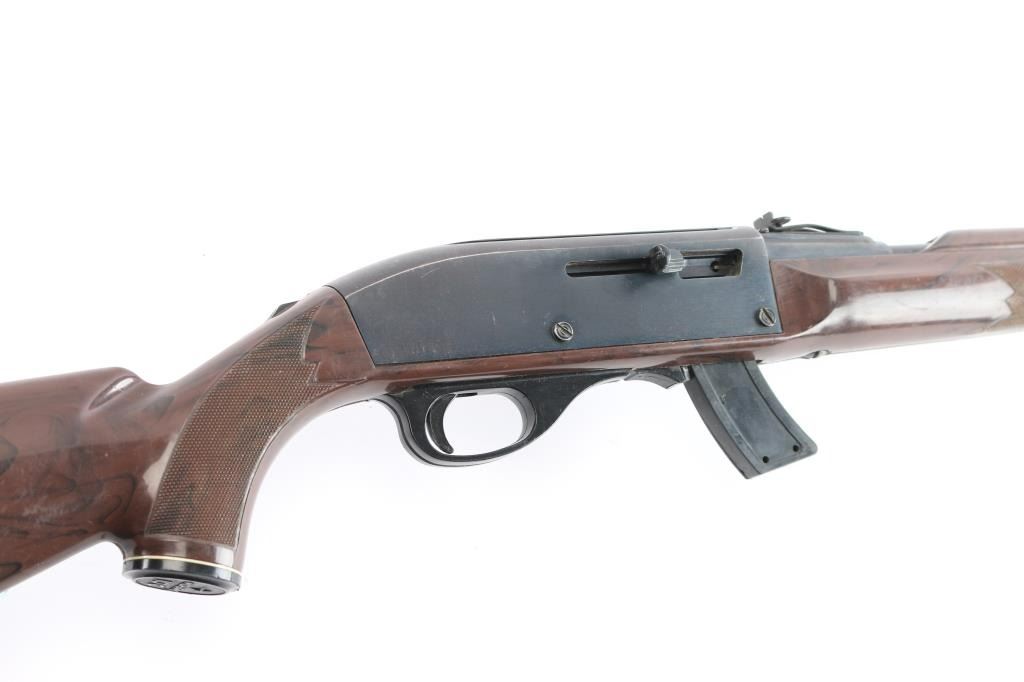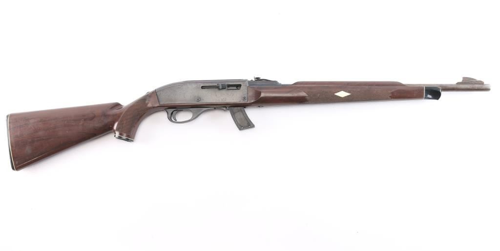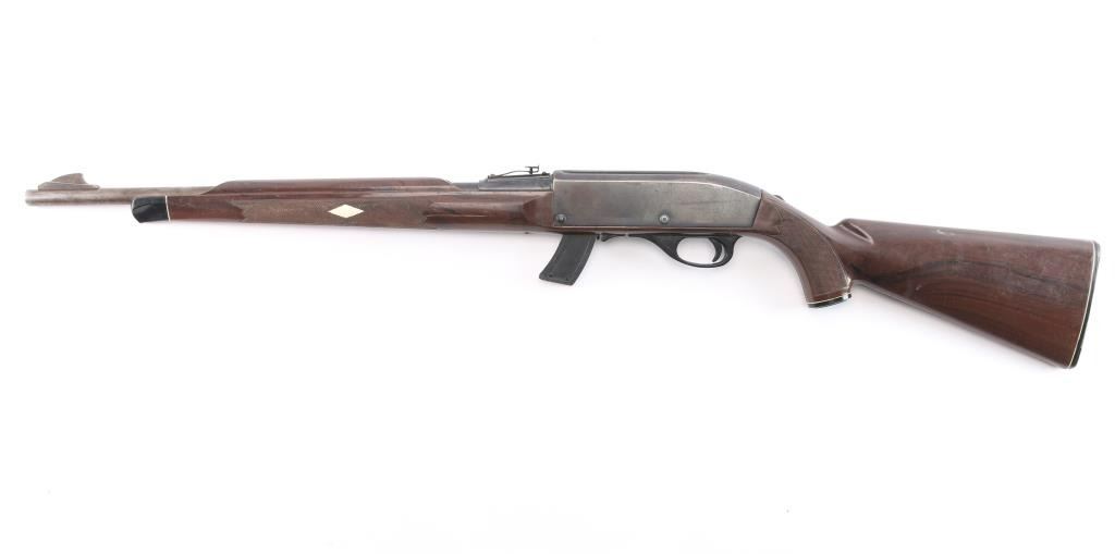 Magazine fed semi-Automatic. "Mohawk" from the Remington 'Nylon' series. Produced 1971-1978. 'EZ' date code, Oct, 1975. Blued finish, brown polymer stock with white diamond, factory buttplate and grip cap. 19.5" barrel with adjustable rear sight, large blade front sight. Receiver grooved for scope mount. Fed from a 10 rd box magazine, (Included). Bore is excellent/bright, action is smooth, stock is overall good/sound with scratches/scuffs and the blue is about 70% with edge wear, scratches, wear on the upper barrel and some scattered patina. Comes with a spare 5-rd magazine.