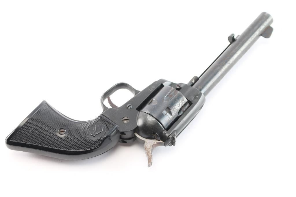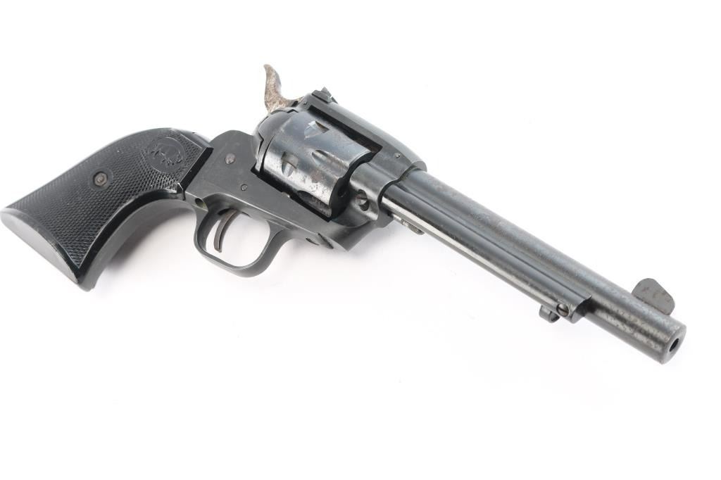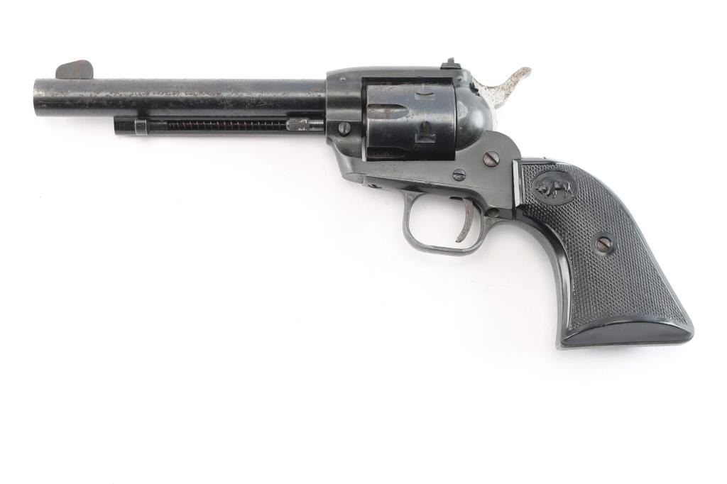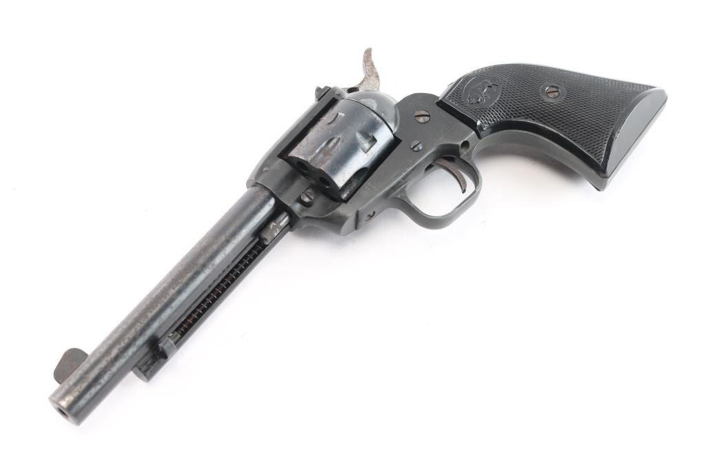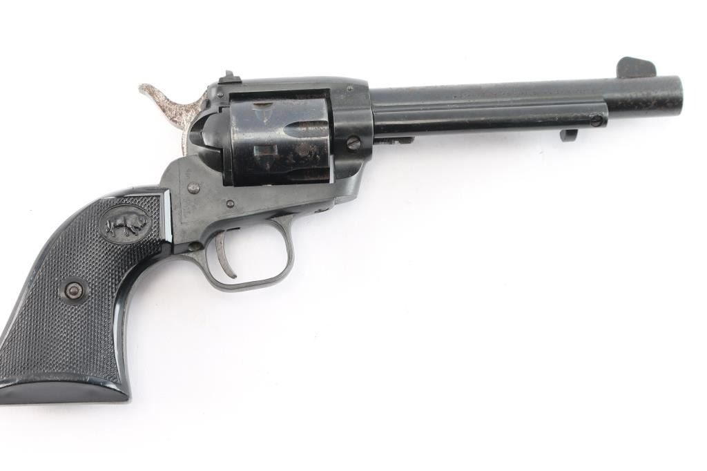 West German made 5.5", .22 LR single action pistol manufactured circa 1972. Imported by Hawes Firearm Co. Los Angels, CA, as marked on the left side of the barrel. The right side of the barrel is marked “H. SCHMIDT, OSTHEIM/RHOEN MADE IN W. GERMANY,” and the top marked "HS MODEL 21 S." The left side of the frame is marked “HS 72." It features a blade front sight, a dovetailed rear sight, six shot fluted cylinder, smooth curved trigger, radius crown, passive firing pin, serrated hammer spur, two piece plastic checkered grips with buffaloes on both sides and "Made in Germany" on the bottom of the right grip. It seems to be in good working condition, but there is scattered rust throughout. Bore is bright with strong rifling.